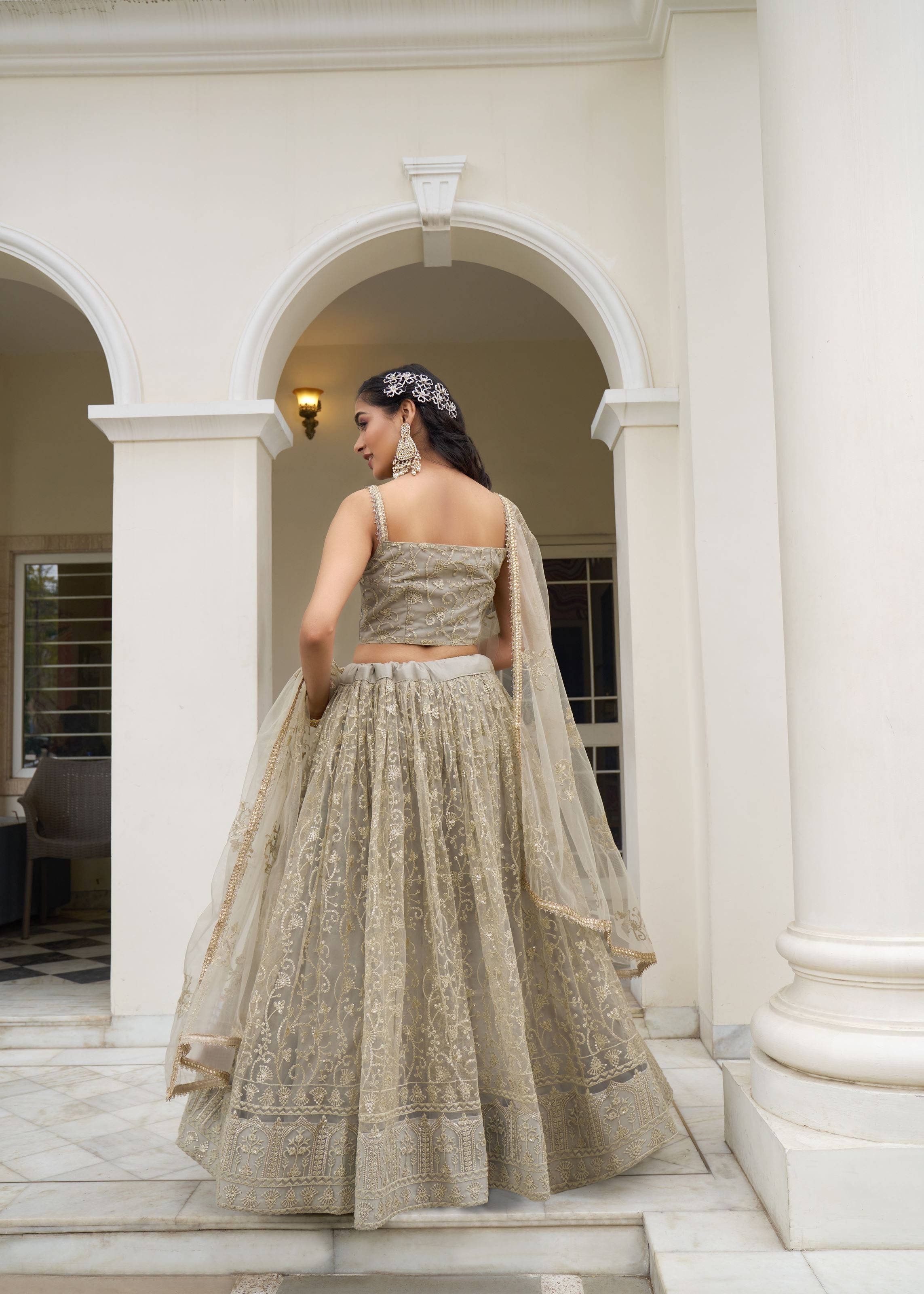 The matching blouse continues the rich embroidery, offering a seamless and elegant silhouette that’s both graceful and captivating. Despite its ornate look, the butterfly net fabric remains breathable and light, ensuring ease of movement and all-day comfort — ideal for women who desire luxury ethnic fashion with refined craftsmanship and minimalistic hues.