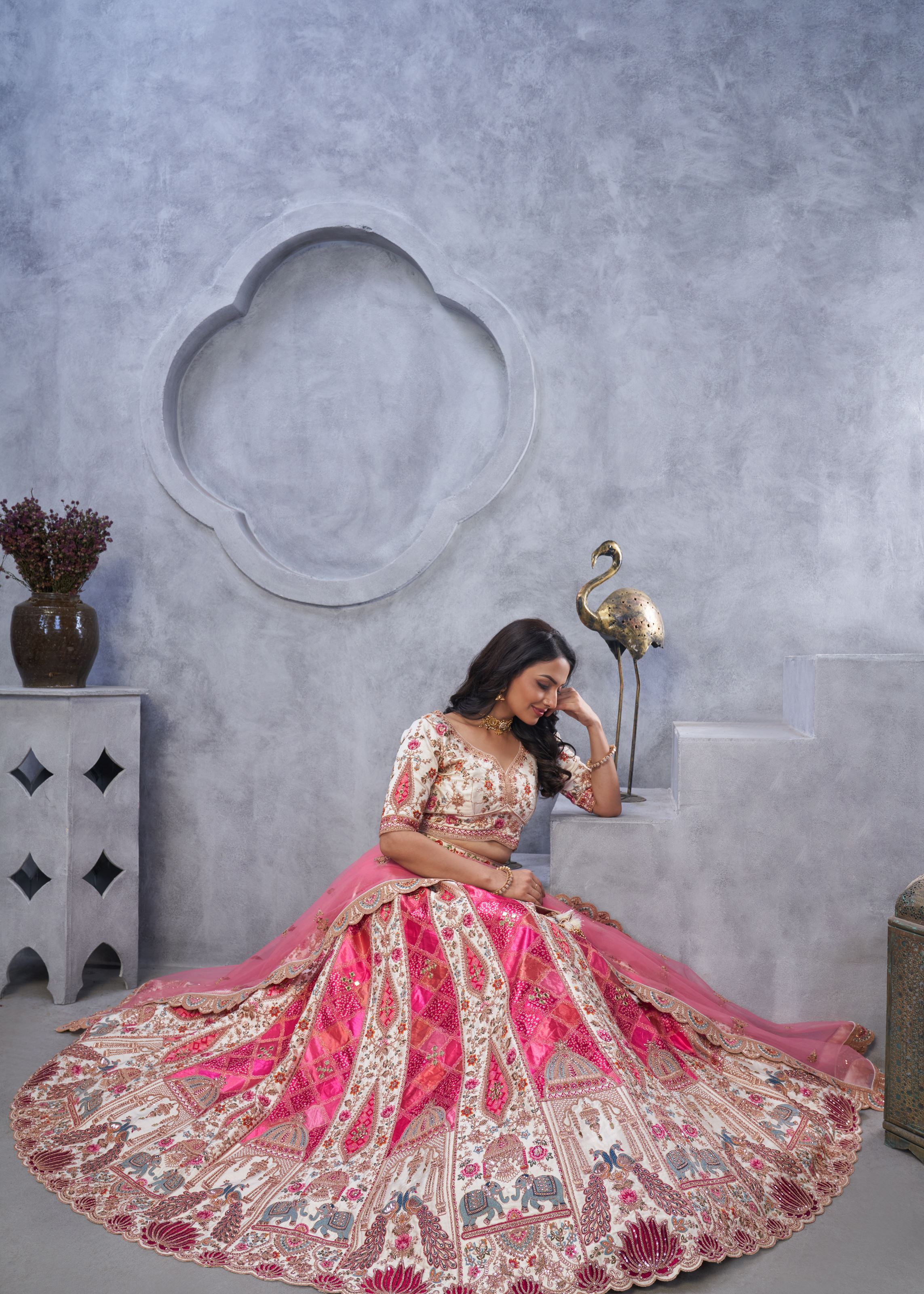 Ivory White Bridal Lehenga With Temple Motifs, Peacock Designs & Bandhej Jacquard Patches