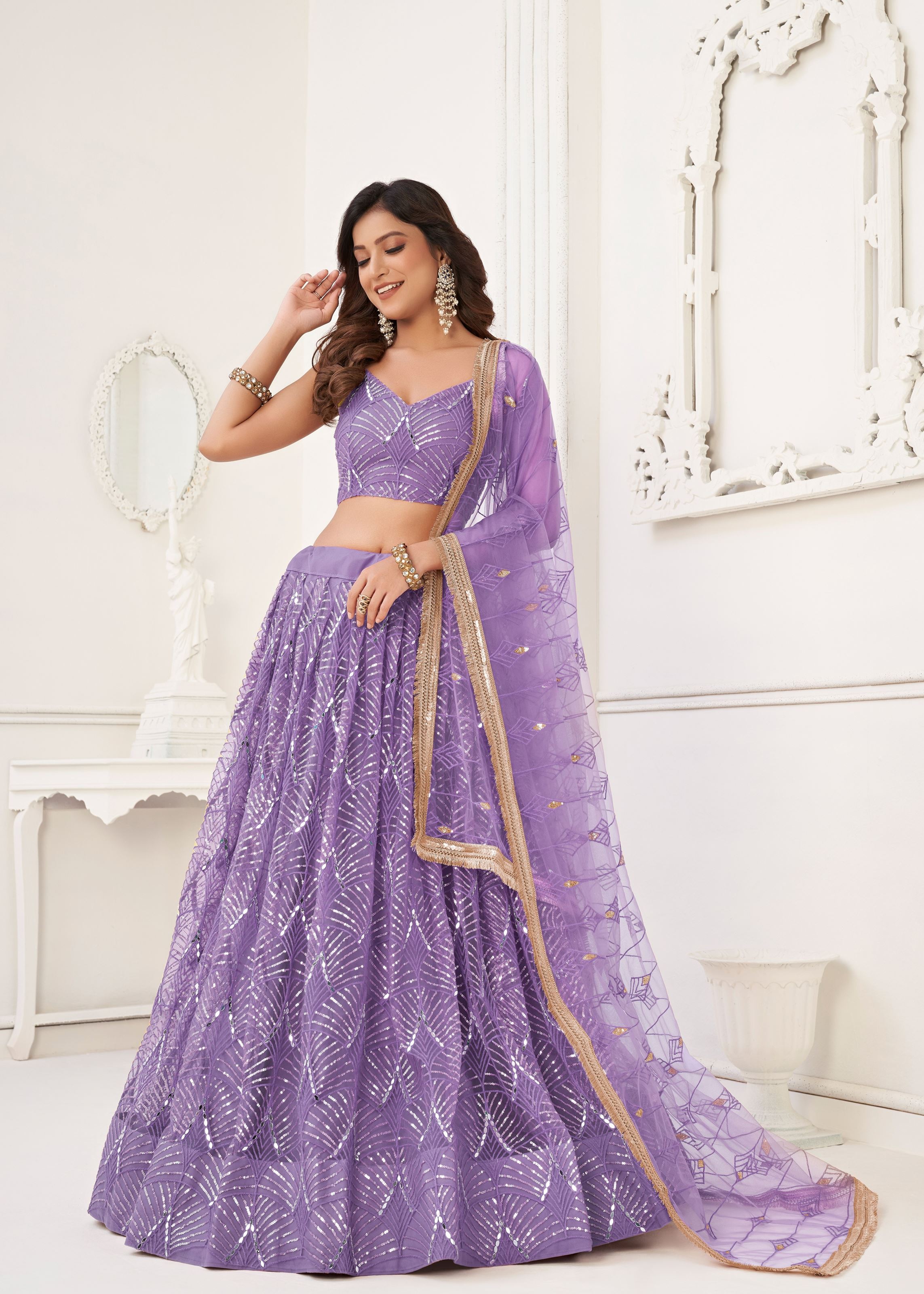 Step into a world of soft elegance with this enchanting Lavender Net Lehenga Choli from Aethnofit Fashions — a dreamy ensemble that pairs pastel hues with exquisite detailing. Crafted from lightweight net fabric, the lehenga is adorned with intricate thread embroidery and real mirror work, offering a subtle yet radiant shimmer that elevates its delicate lavender shade. Perfect for engagement ceremonies, pre-wedding functions, or festive occasions, this outfit blends grace and glamour effortlessly.