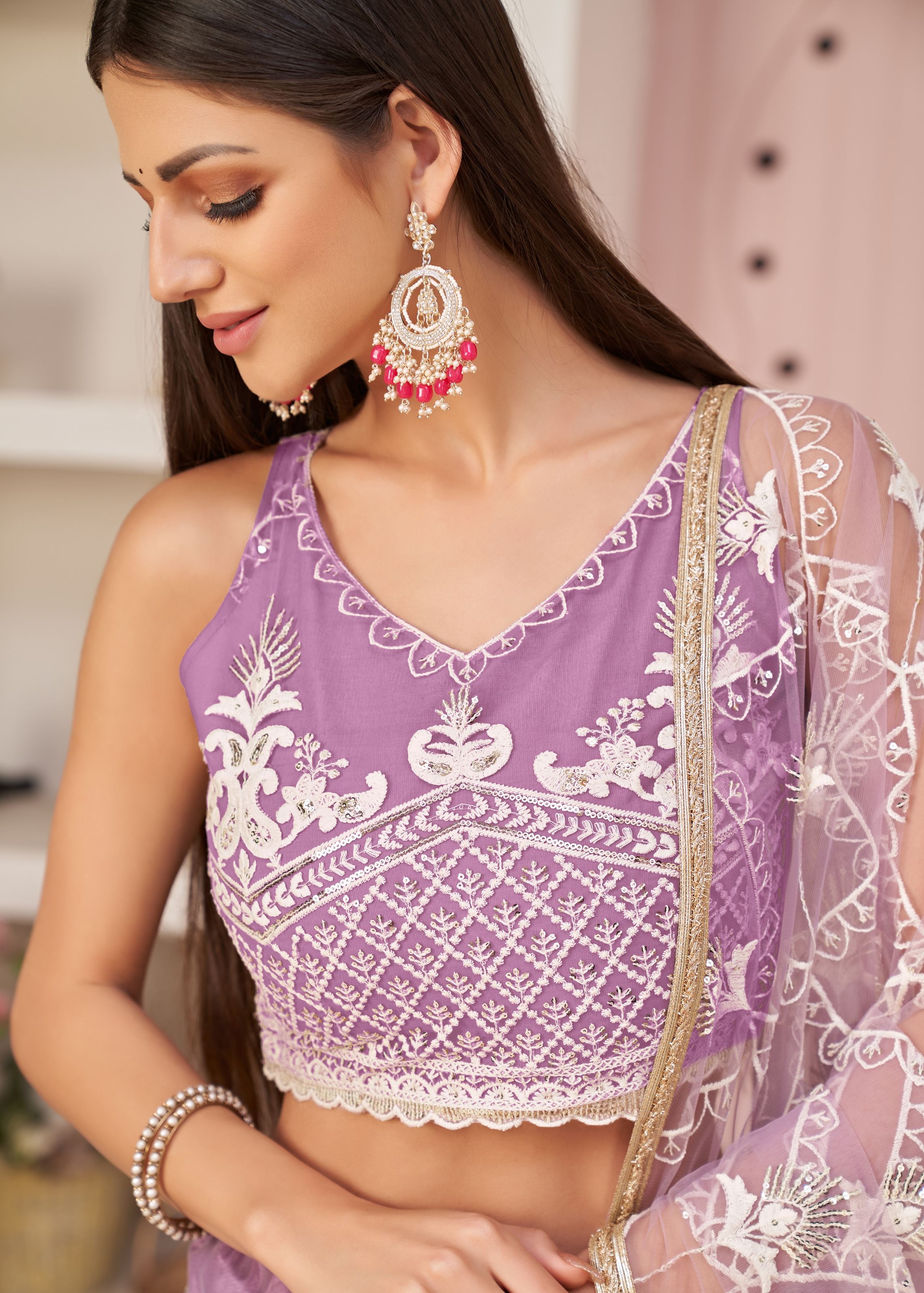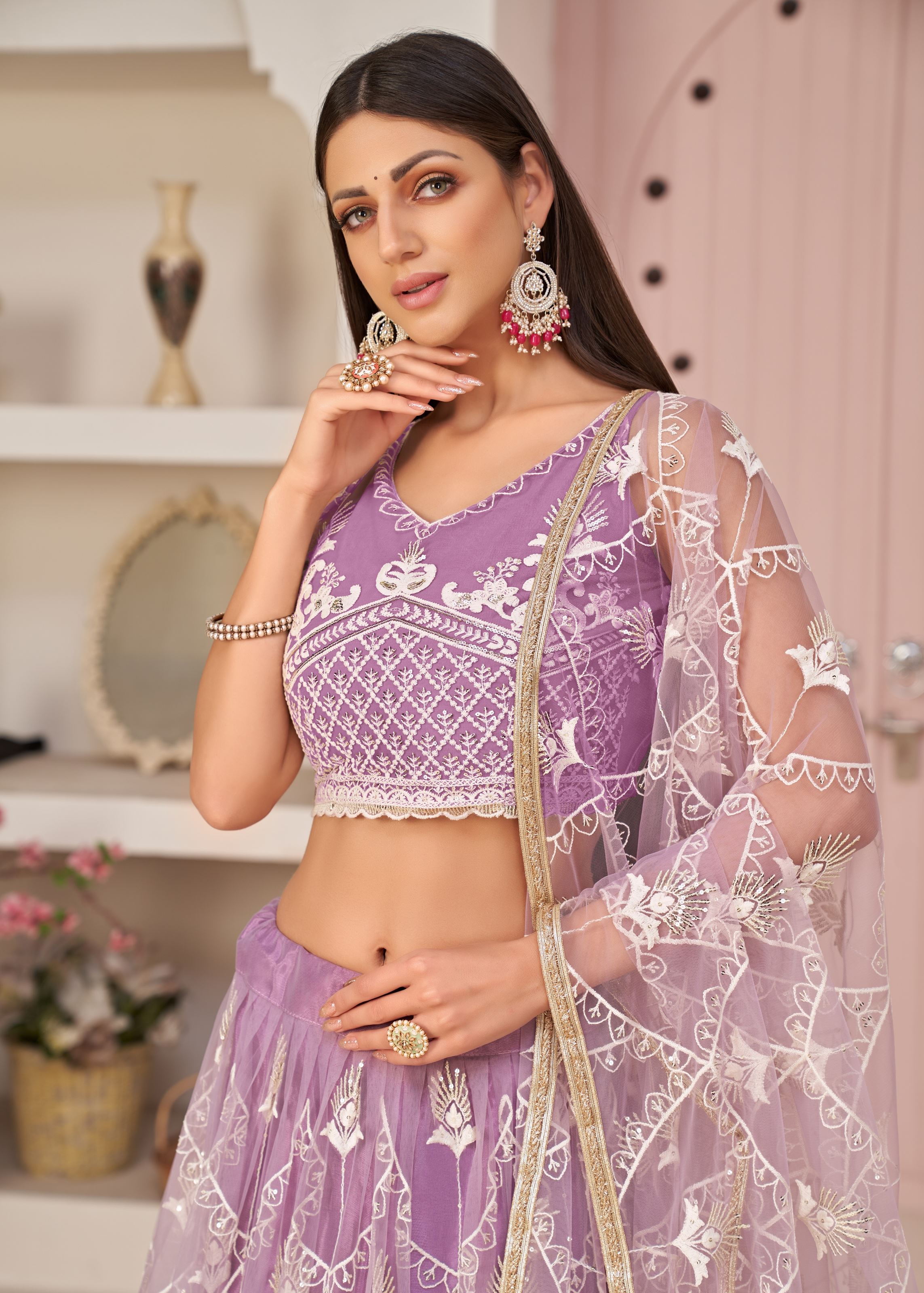Lavender Net Lehenga Choli with Thread Embroidery Work