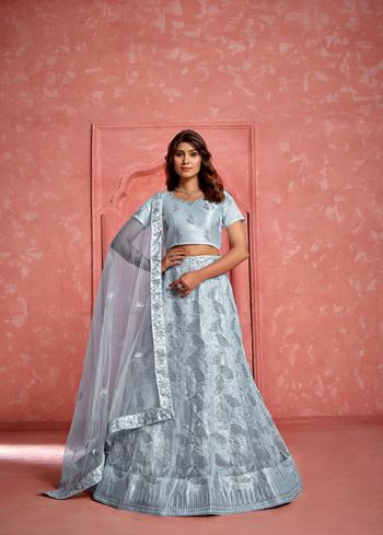 Crafted from lightweight net fabric, the lehenga flows gracefully and feels light on the skin, offering comfort without compromising on elegance. The matching net blouse and dupatta are thoughtfully designed to complement the overall look, with subtle sequin accents that shimmer under soft lighting—creating a beautifully refined finish for modern ethnic celebrations.
