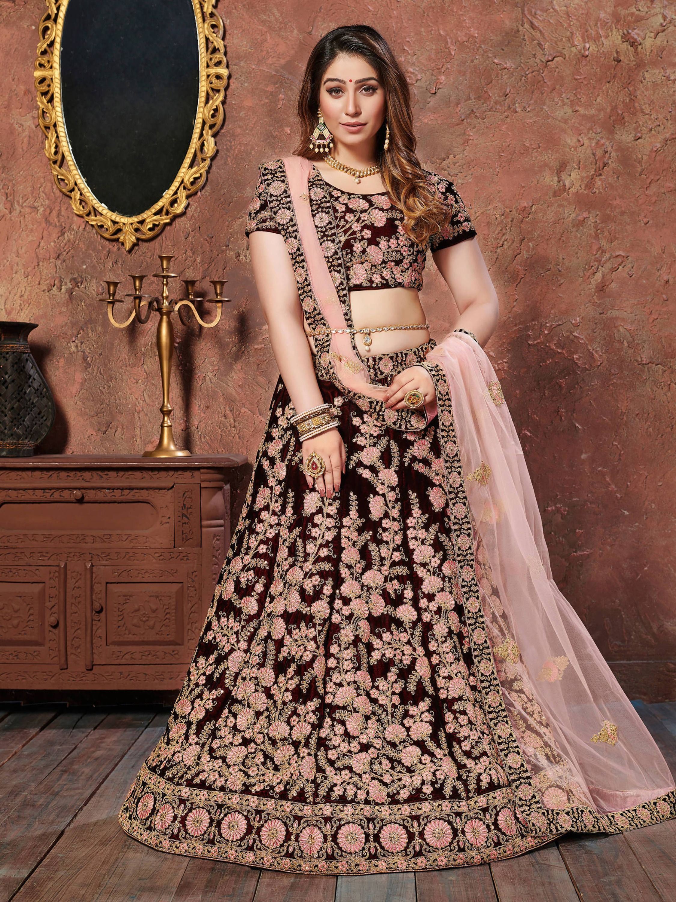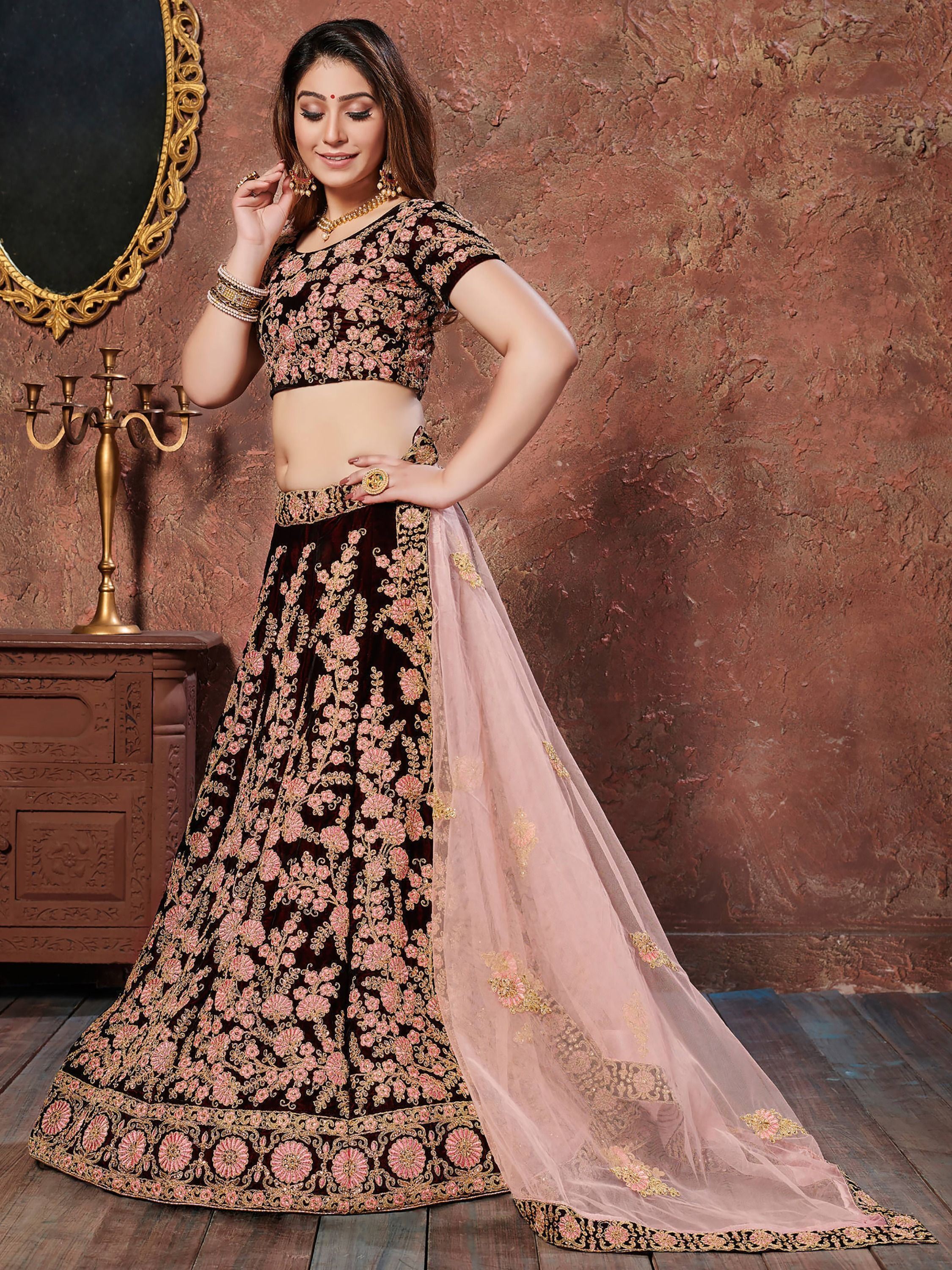 Maroon Thread Embroidery Velvet Silk Bridal Wear Lehenga Choli and Pastel Pink Dupatta