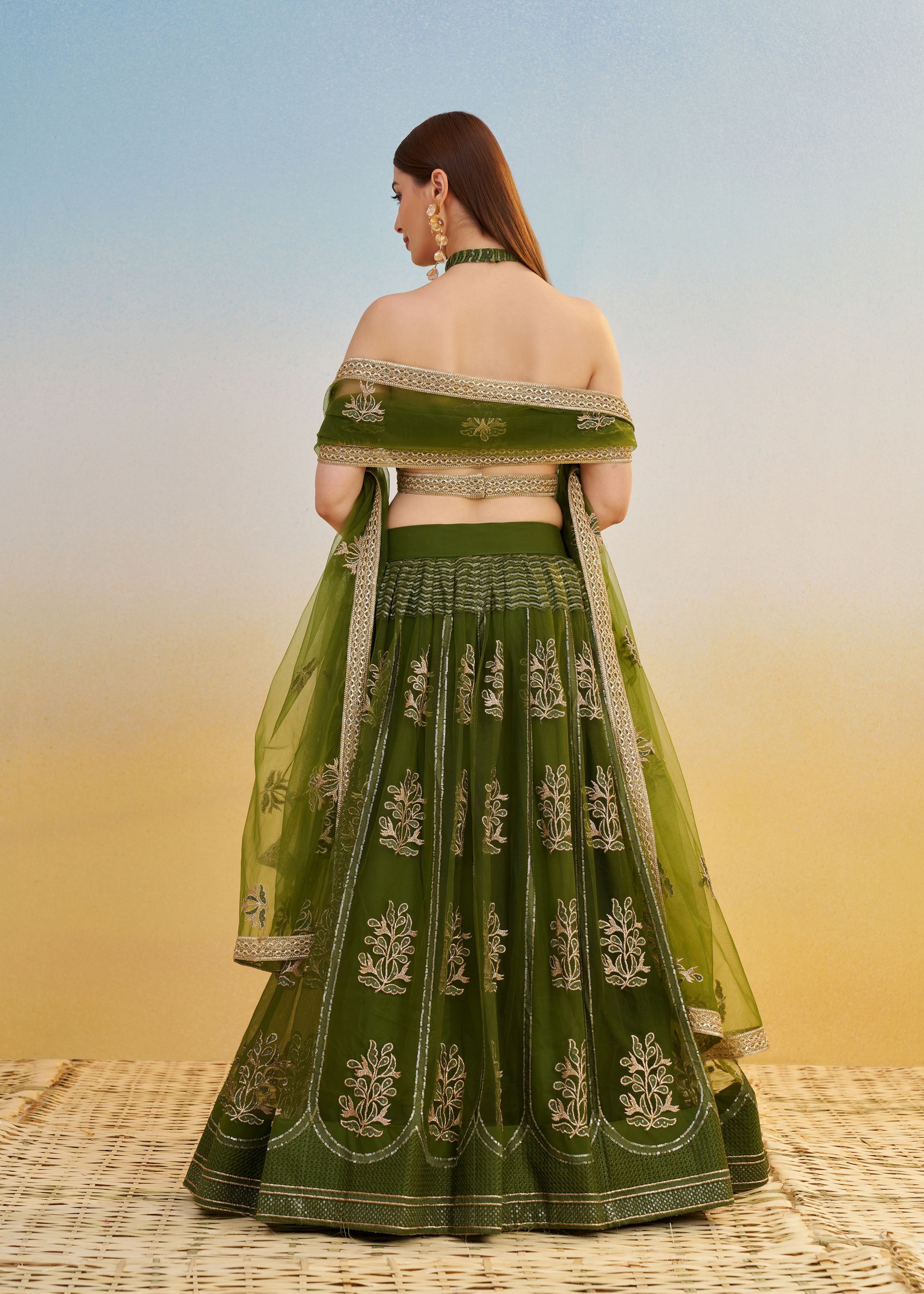 Mehendigreen Lehenga Choli With Tone To Tone Thread Work Zari Work and Sequence Work Embroidery With Readymade Fancy Lace