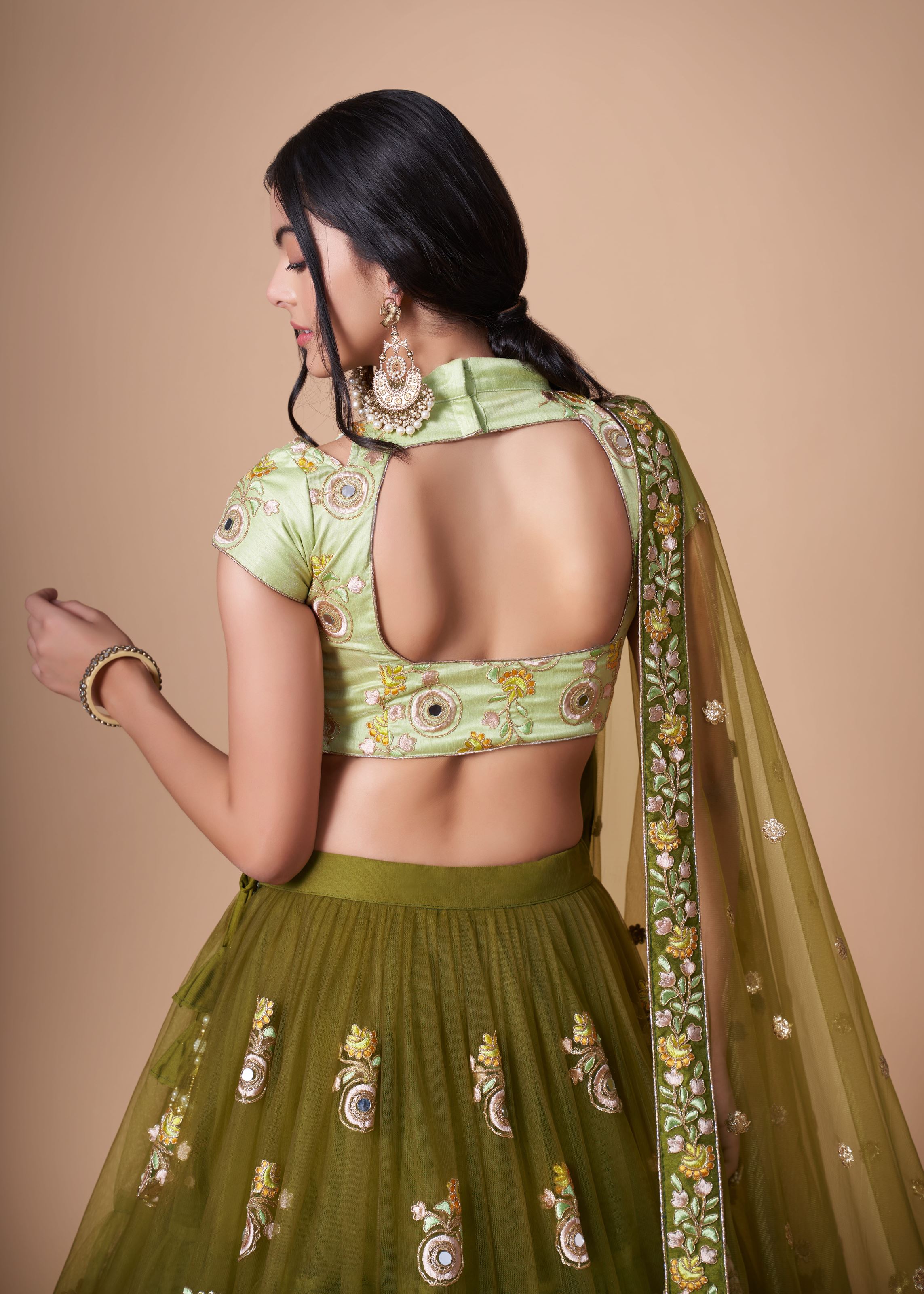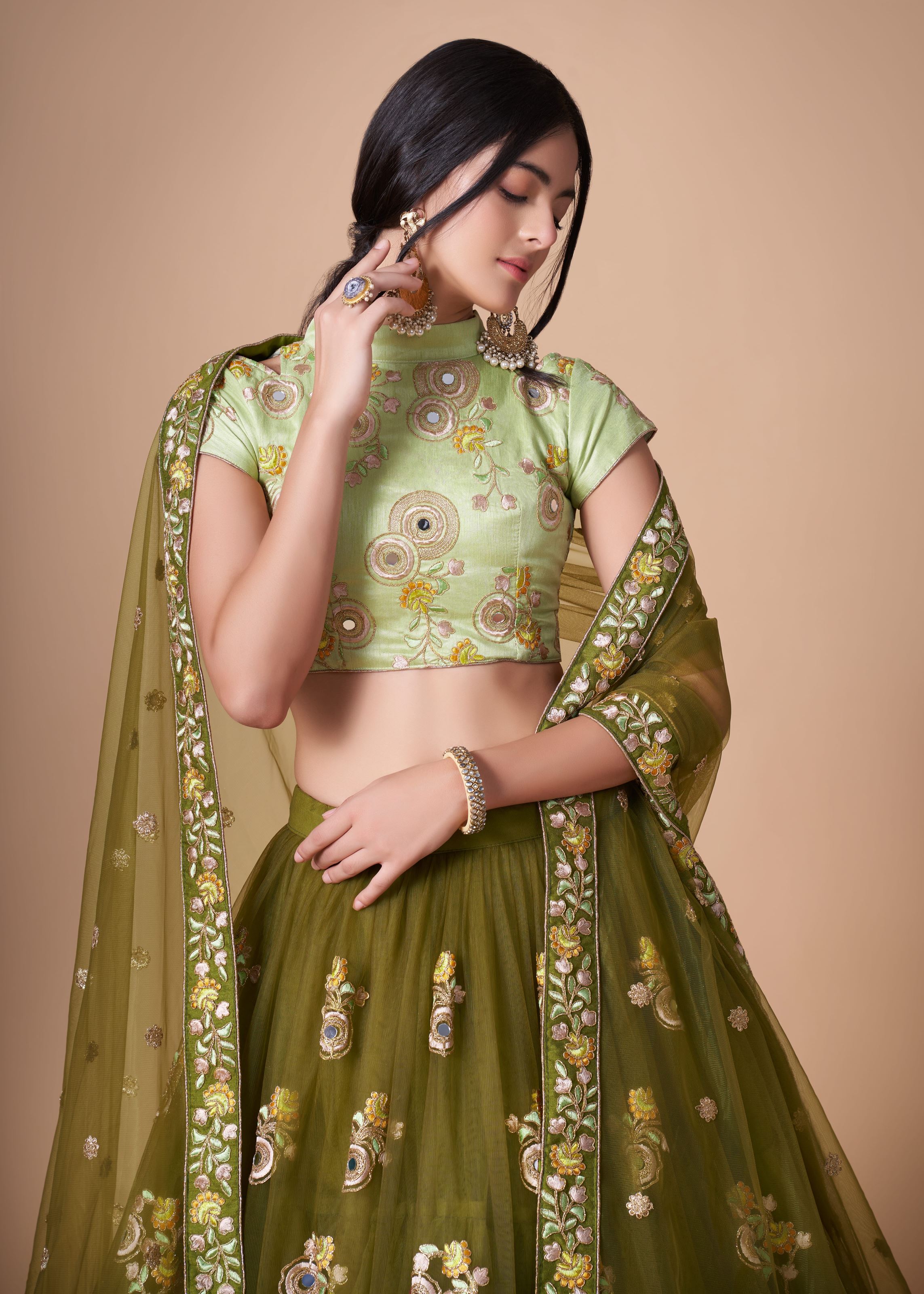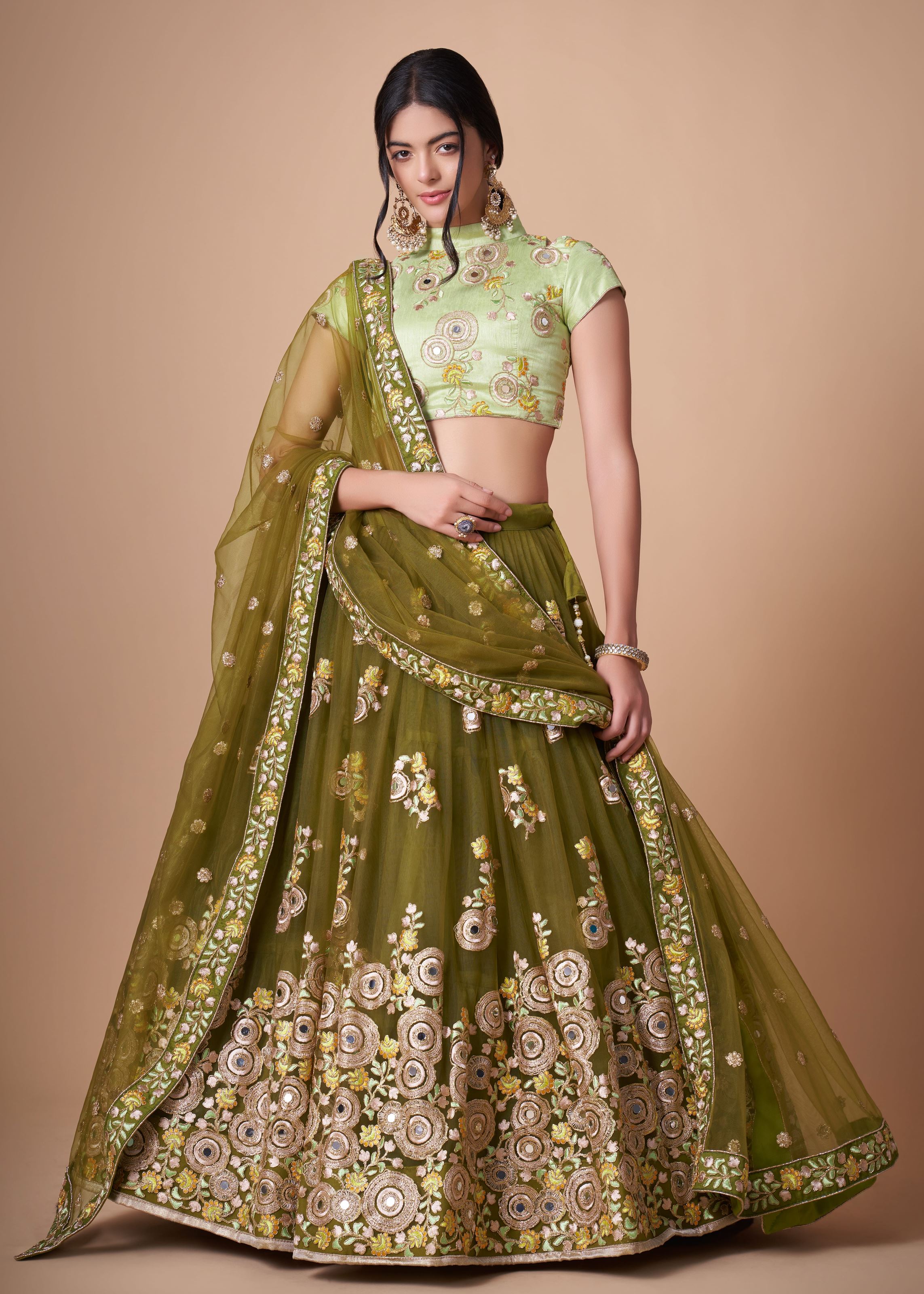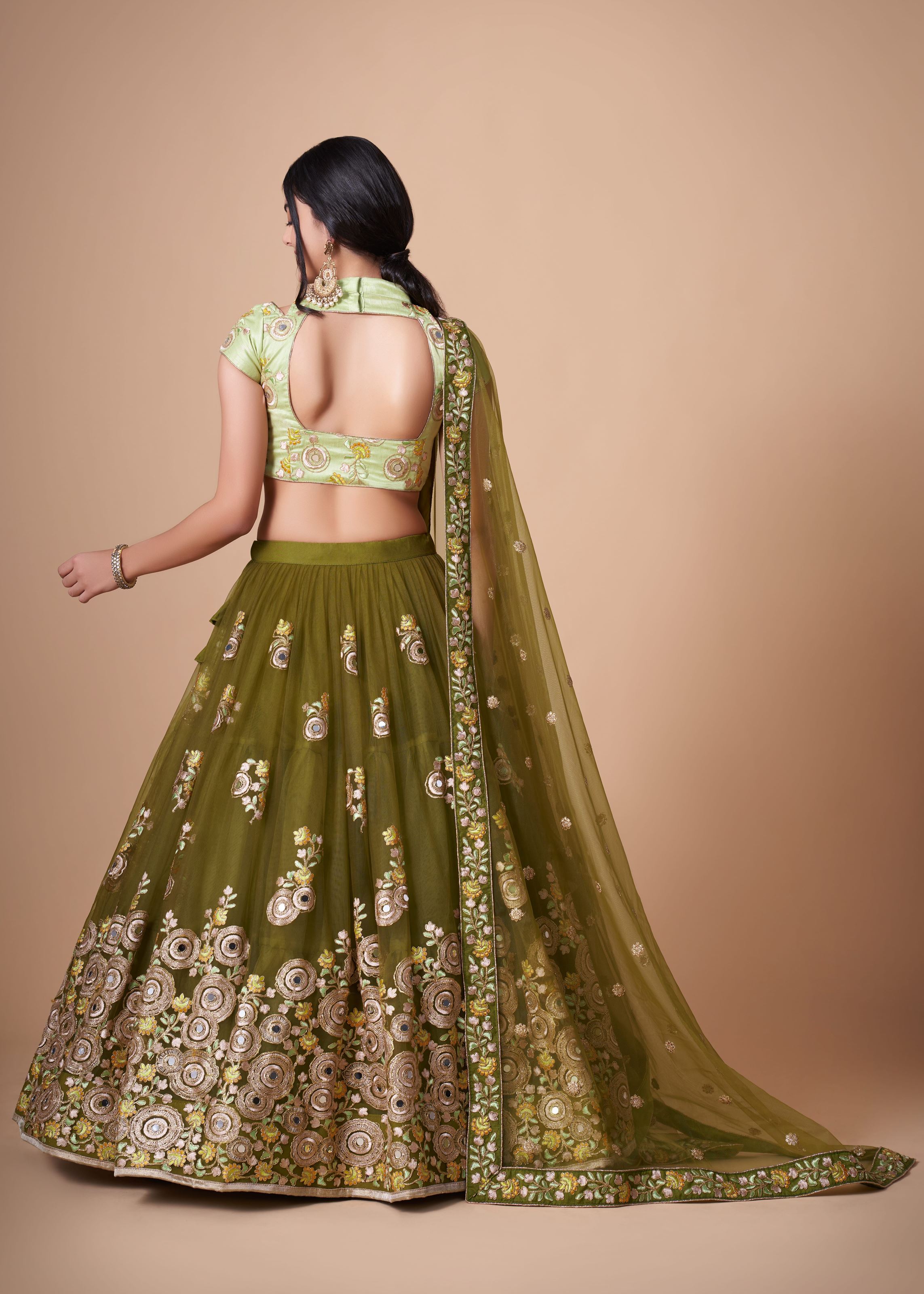 Mehndi green Soft Net Lehenga Choli With Thread, Zari, Dori And Sequins Embroidery With Mirror Work ----- SIZE (SEMI STITCHED) AVAILABLE UP TO 42 BUST AND WAIST