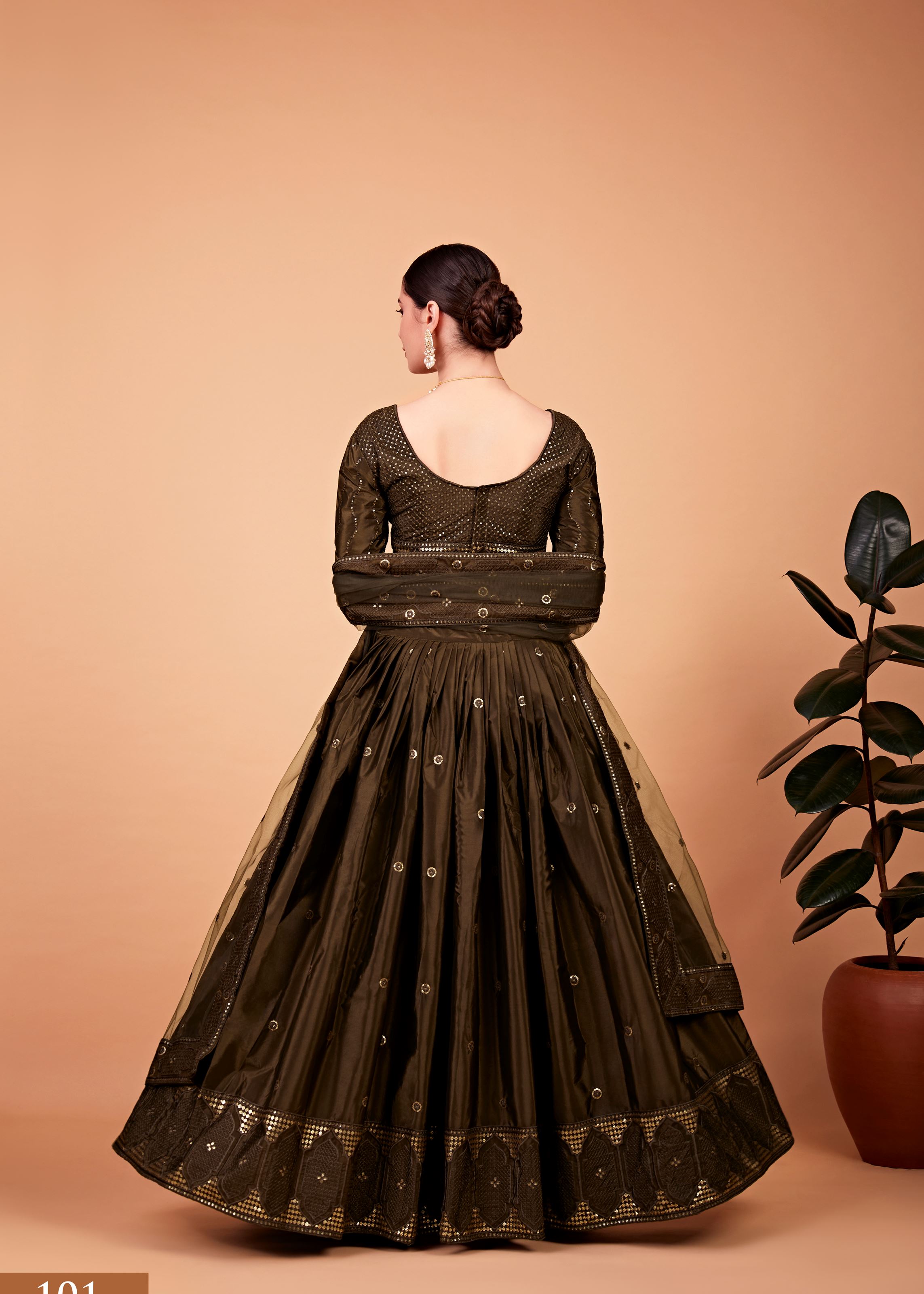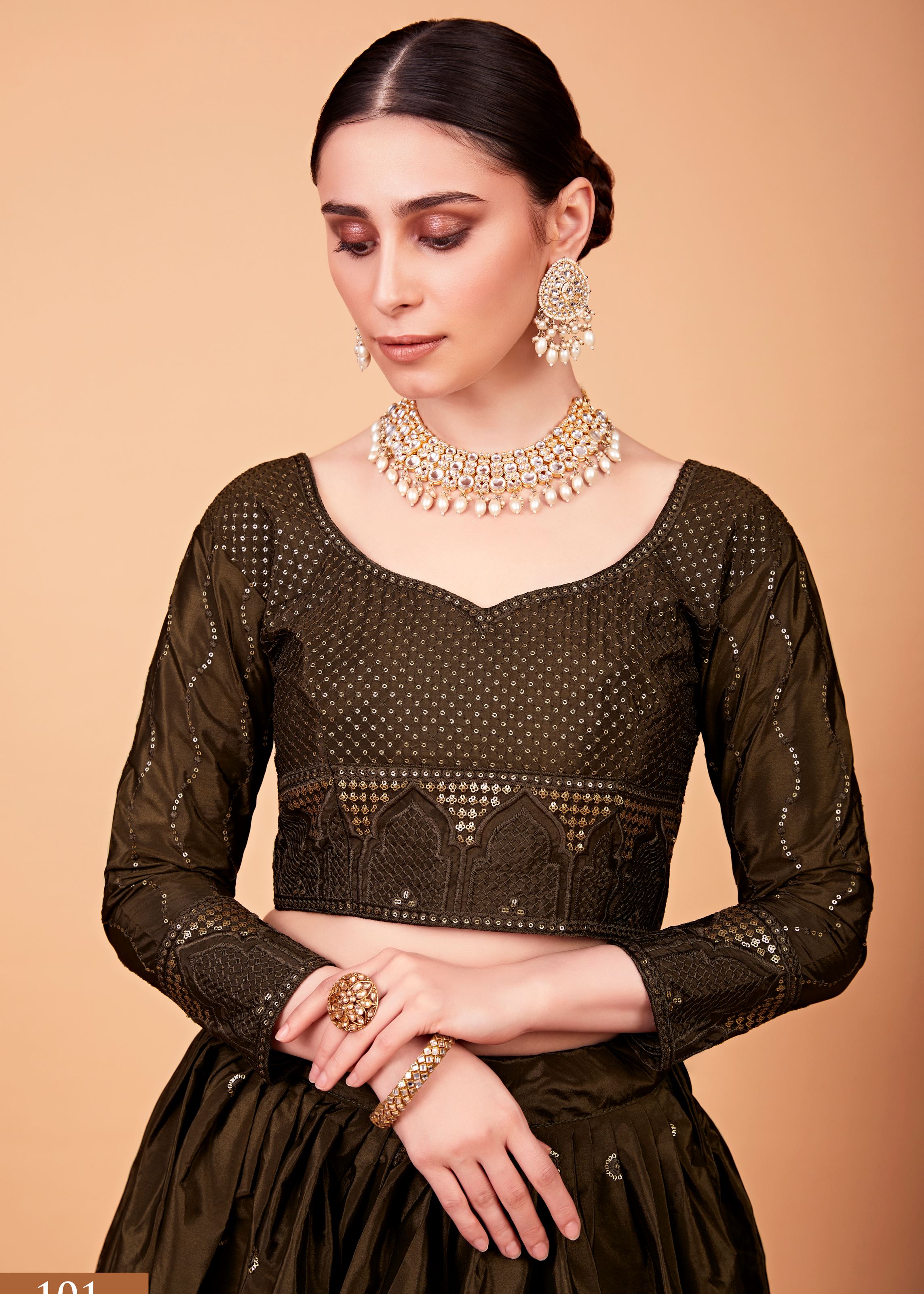 Bring timeless charm to your celebration with this Mehndi Lehenga Choli from Aethnofit Fashions, crafted in rich heavy tebi silk fabric. The lehenga and choli are dyed in a beautiful mehndi green tone, elevated by detailed thread and sequins embroidery that creates a perfect blend of sparkle and sophistication.