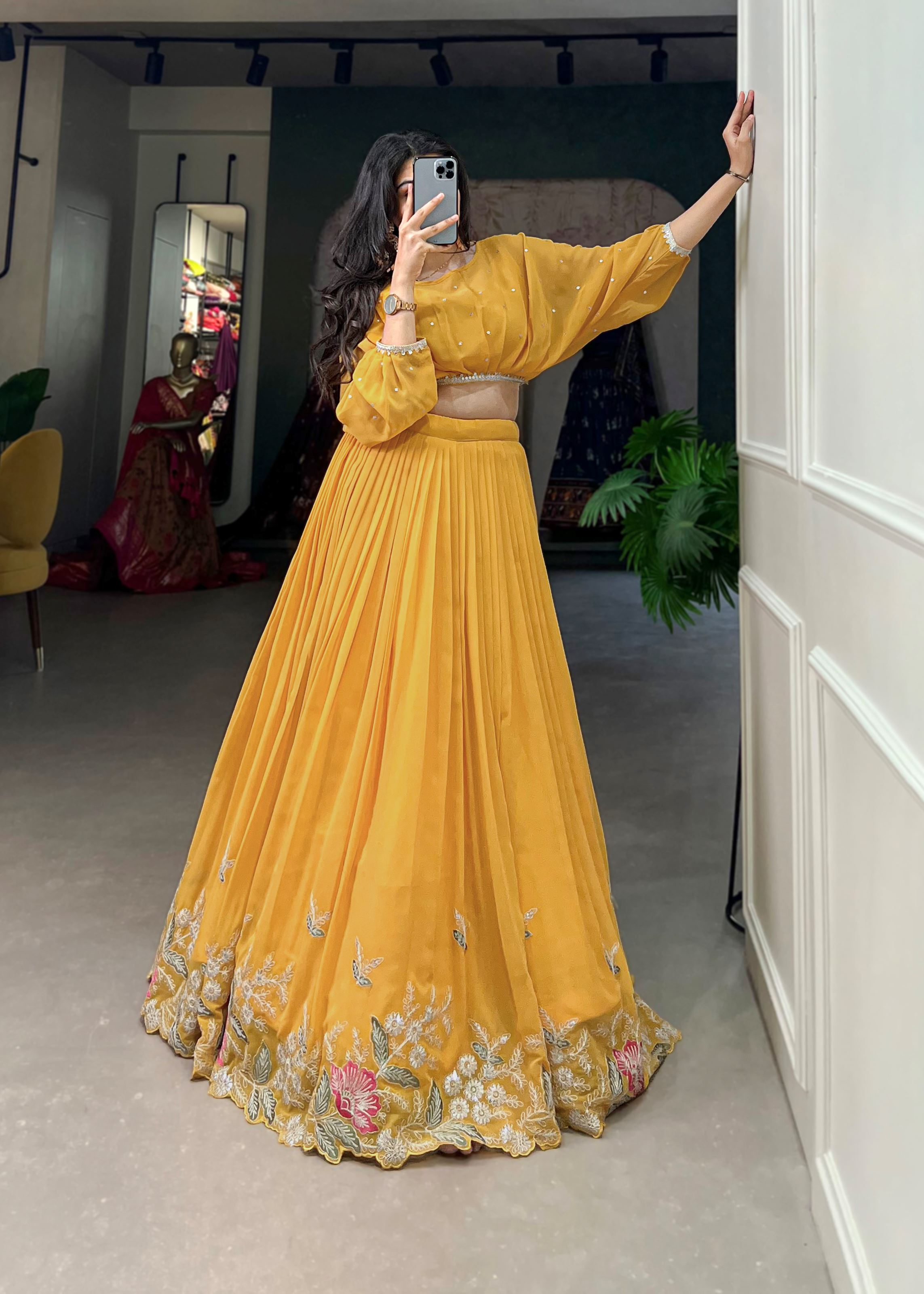 Mustard Georgette Lehenga with Sequin and Thread Detailing – Light & Elegant