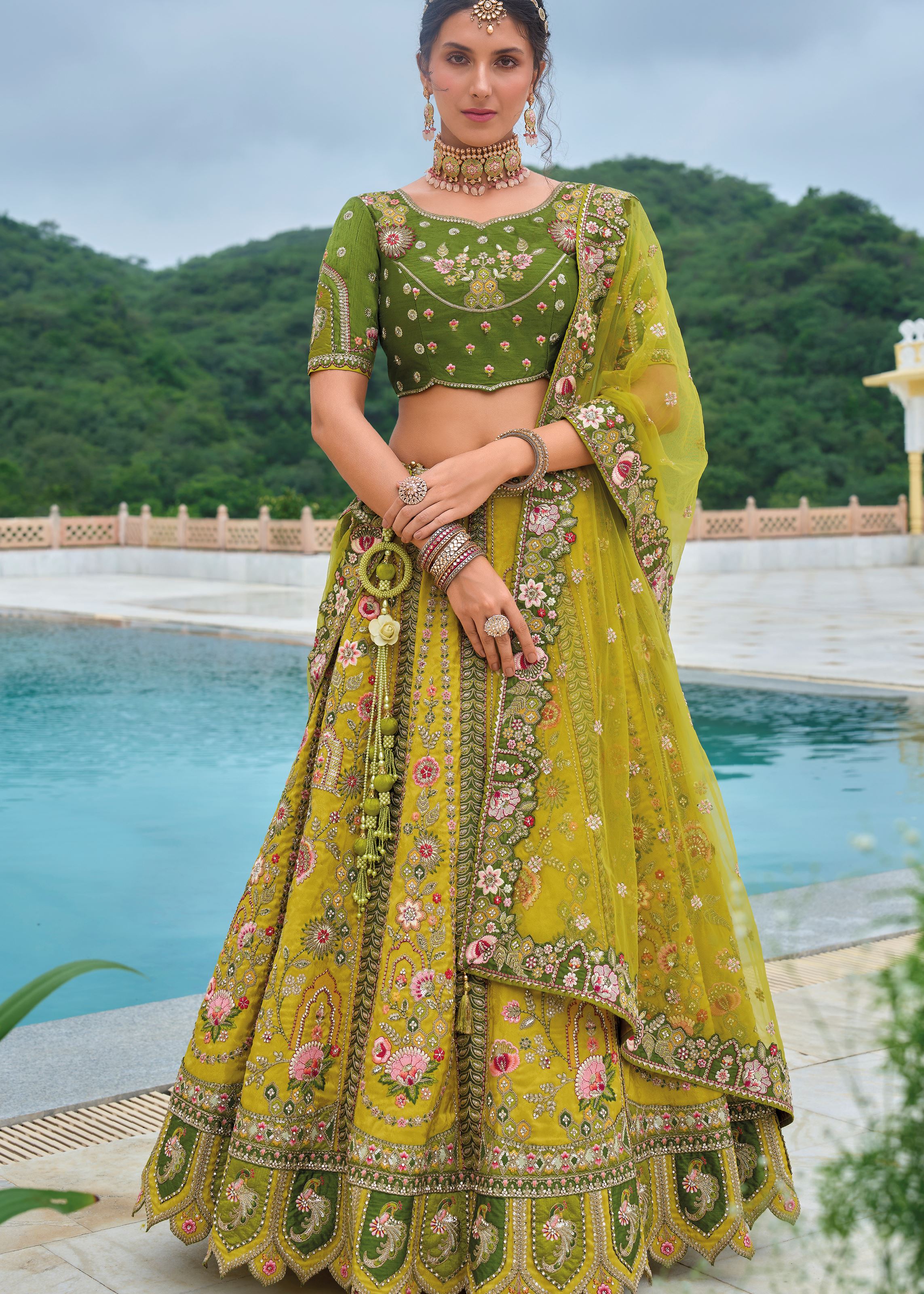 Mustard Lehenga Choli With Heavy Thread Embroidery, Zari With Sequins Work