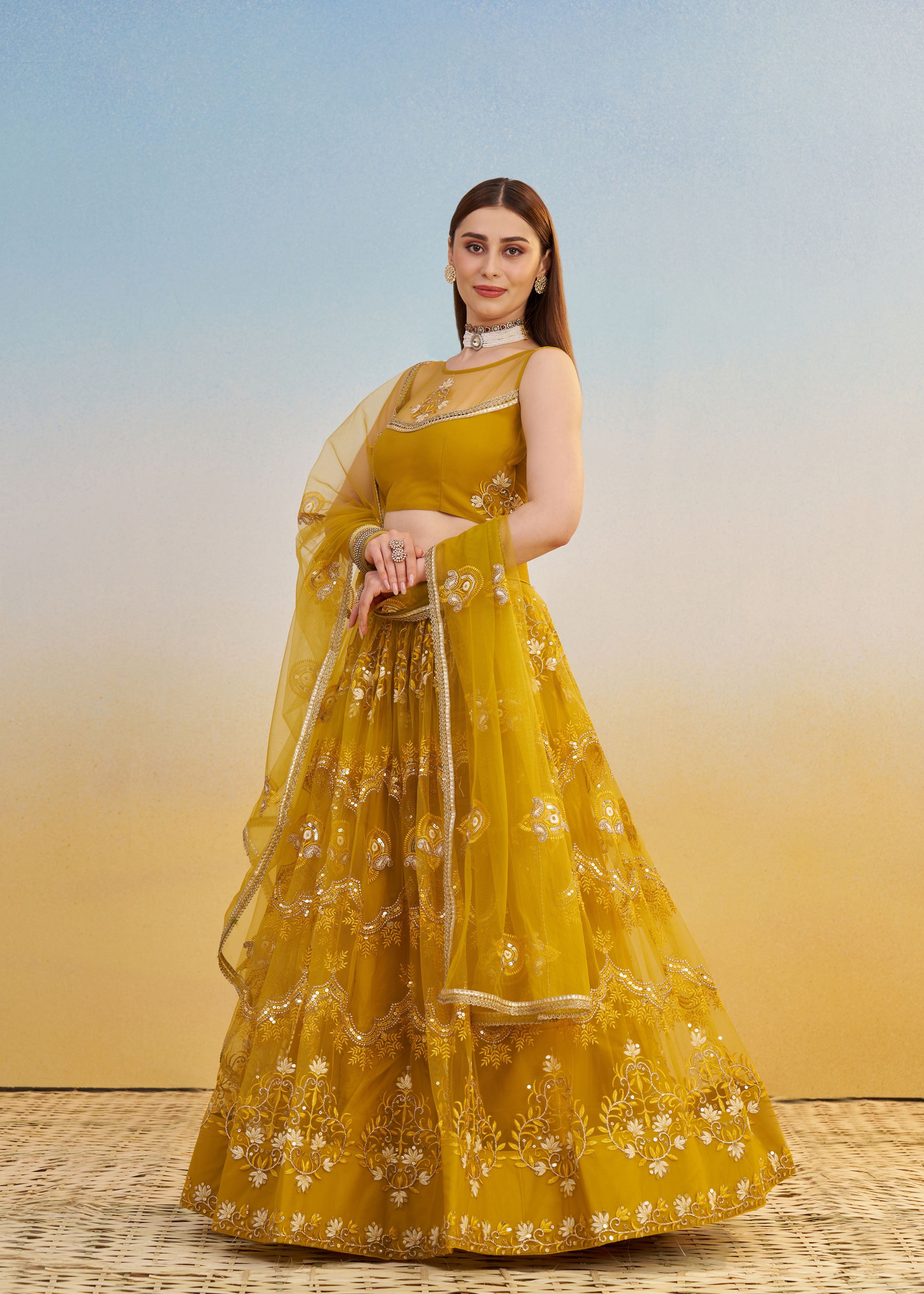 Mustardyellow Lehenga Choli With Tone To Tone Thread Work Zari Work and Sequence Work Embroidery With Readymade Fancy Lace