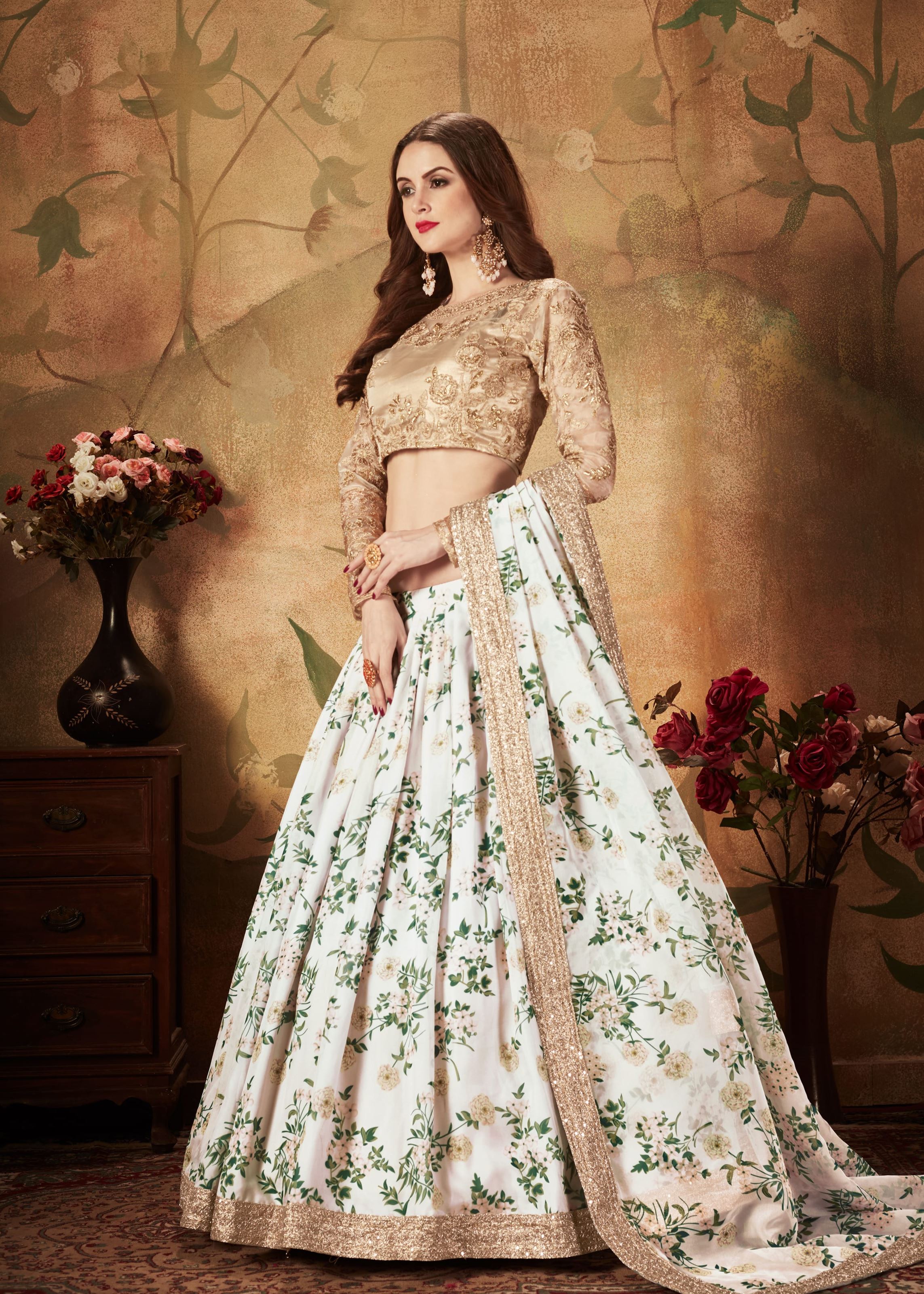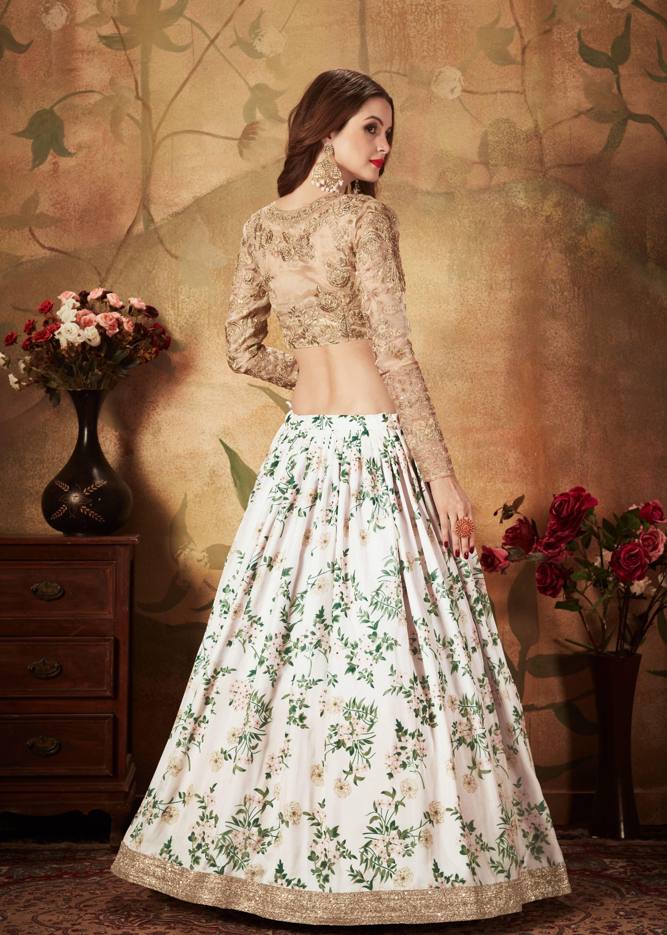 Off-White And Beige Lehenga Choli With Digital Print & Dori, Zari And Sequins Embroidery Work