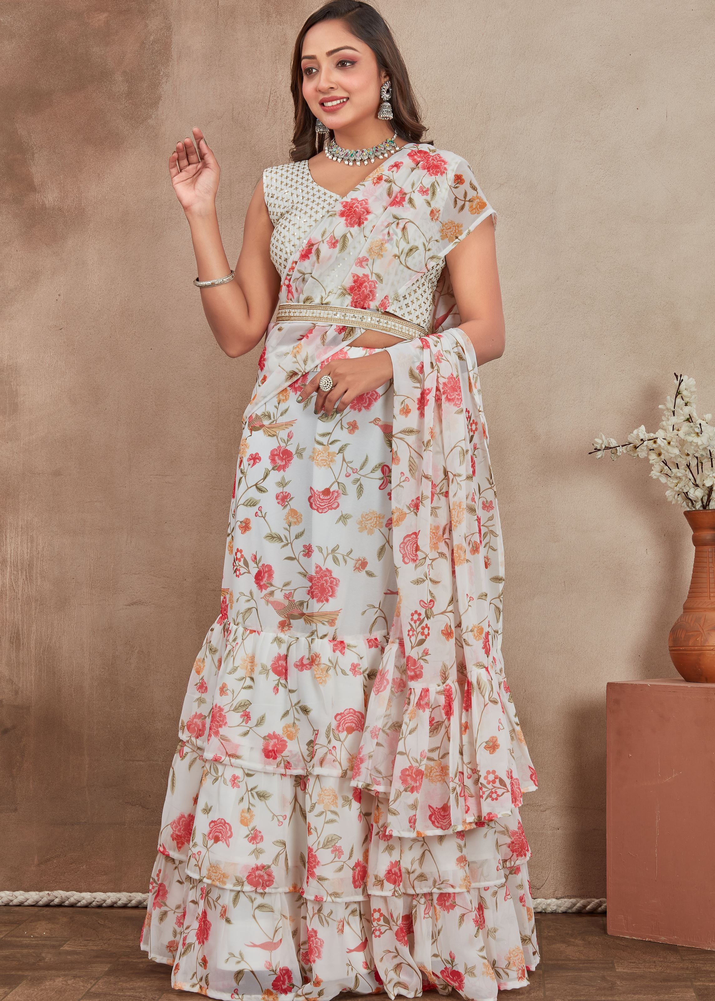 The blouse and lehenga are crafted from premium Heavy Georgette, ensuring a luxurious fall and flattering silhouette. The white lehenga is adorned with heavy digital prints, exuding a vibrant yet refined look ideal for festive galas, wedding receptions, or pre-bridal celebrations. Paired with an off-white Heavy Georgette dupatta, the full ensemble offers a graceful balance of volume, fluidity, and charm.