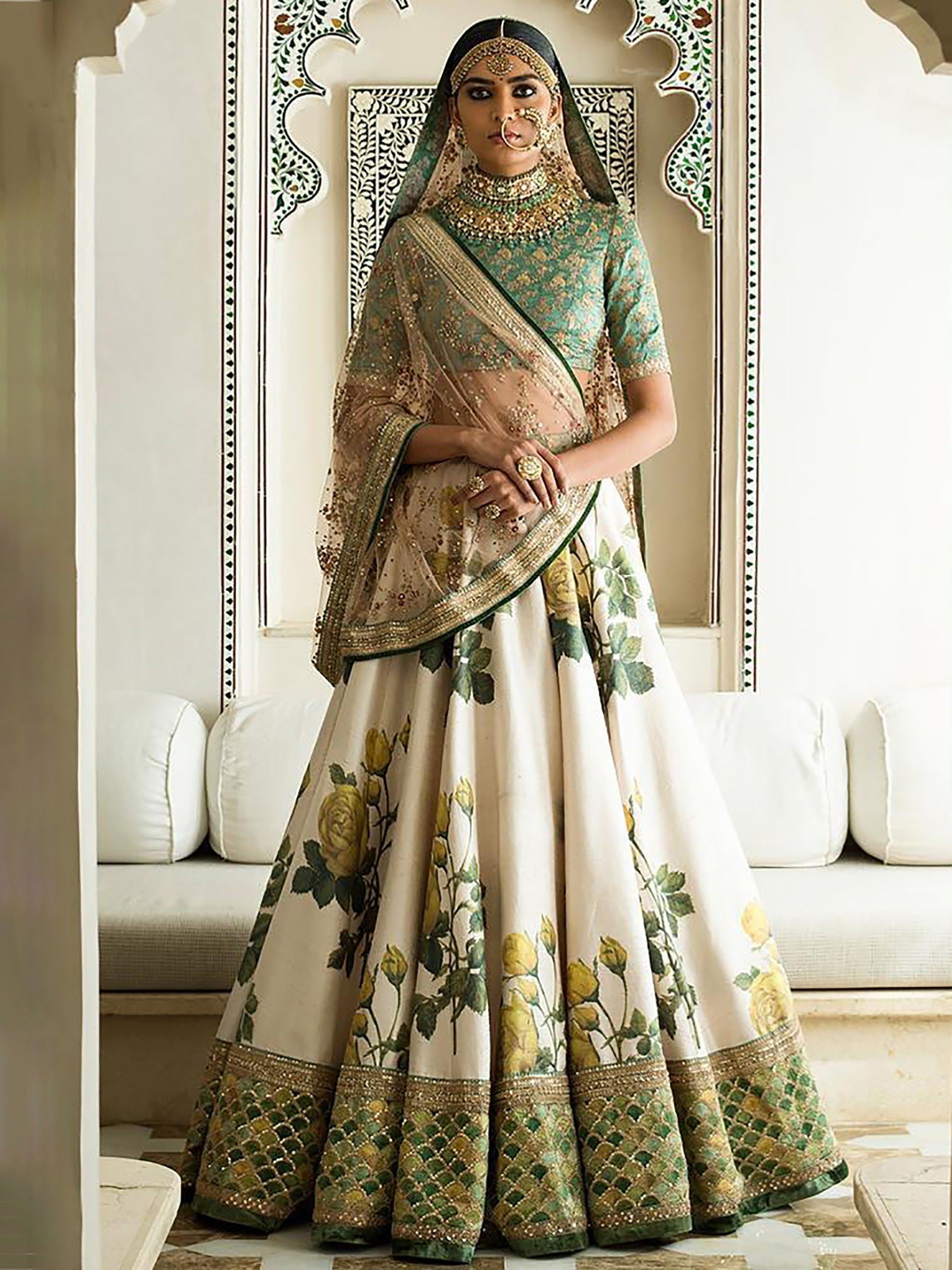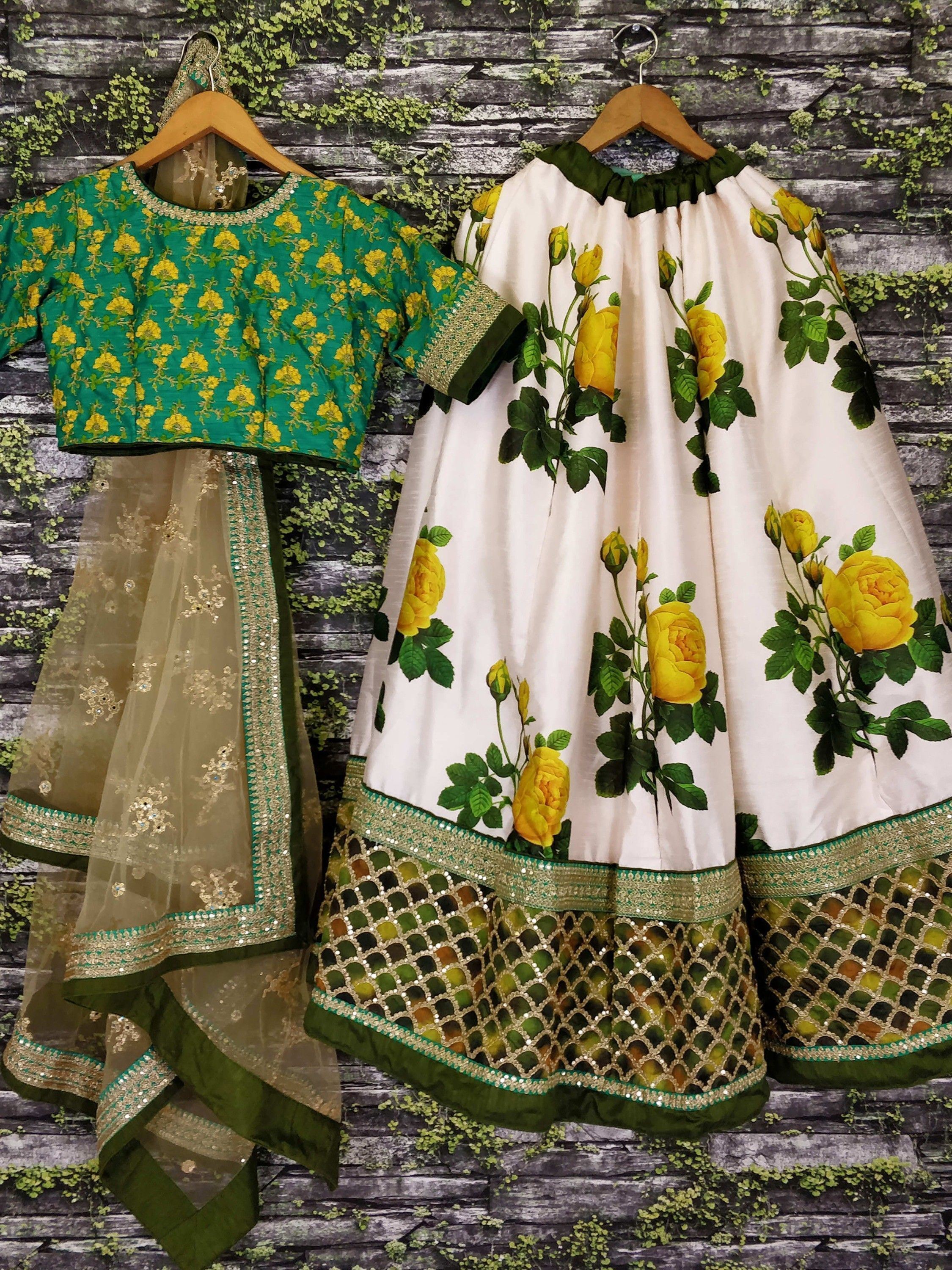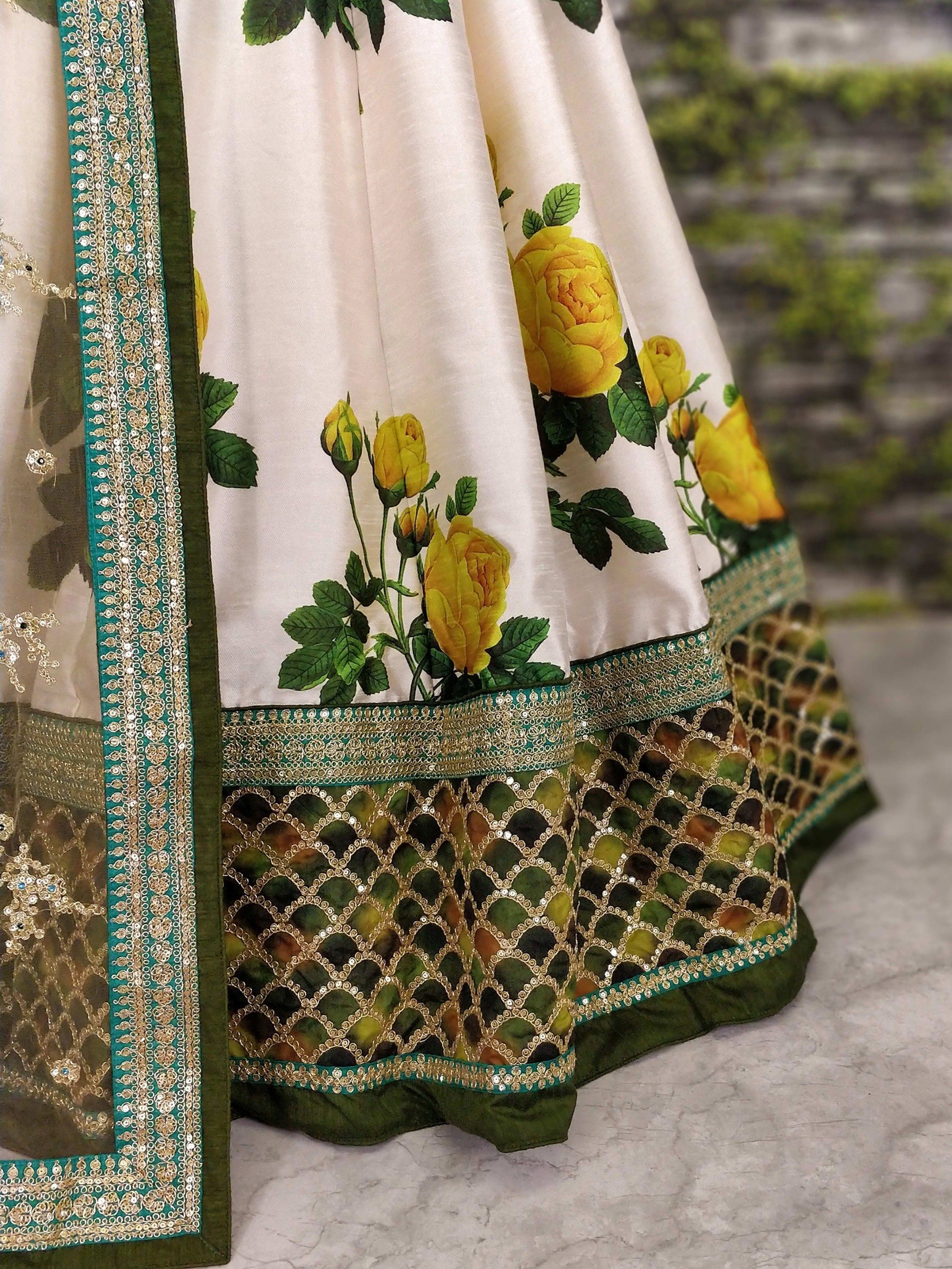 Off White-Yellow Rose Floral Print Silk Lehenga Choli