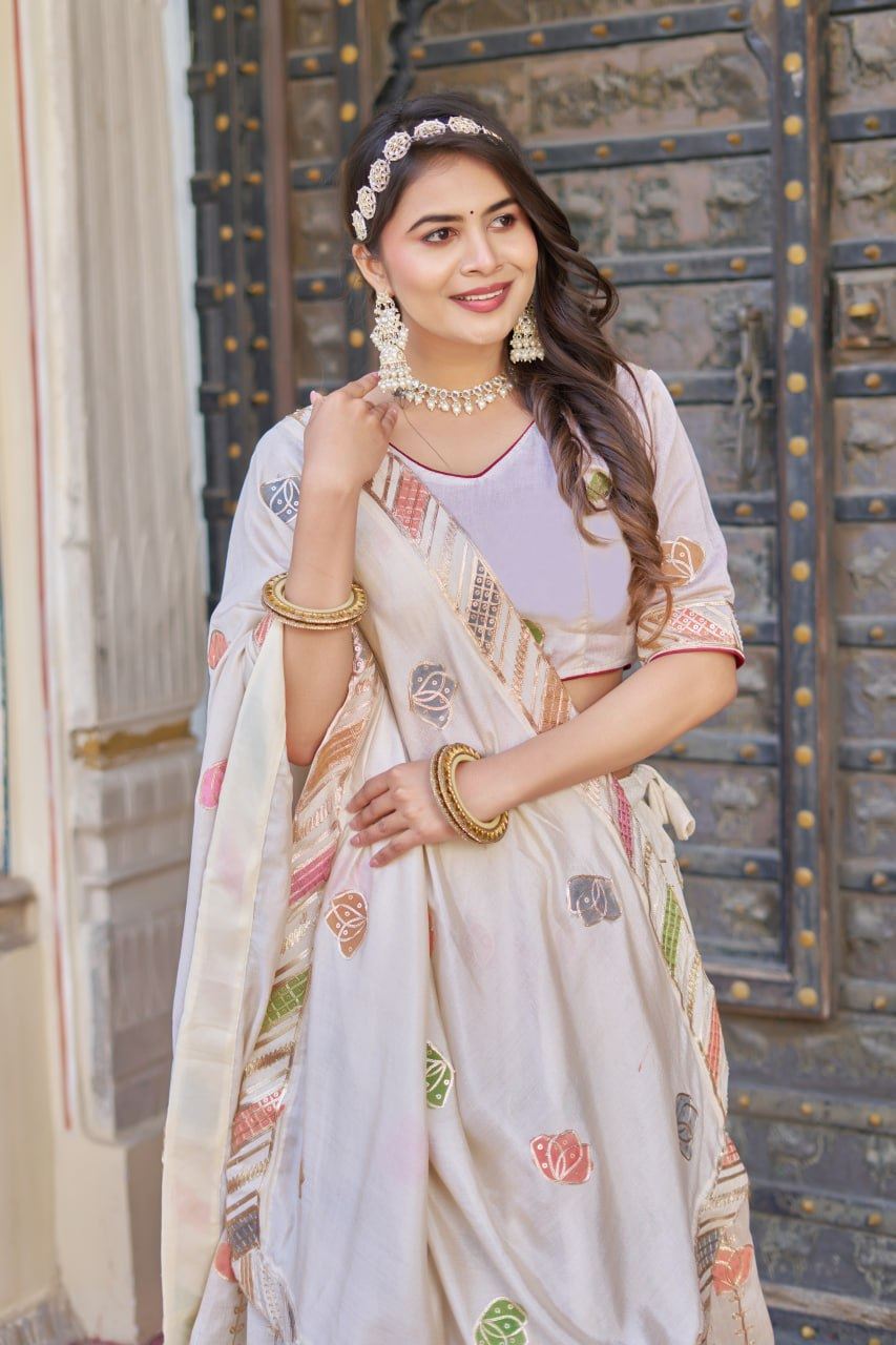 Off-White Lehenga Choli with Sequins, Thread Embroidery, Hand Print & Lace Detailing