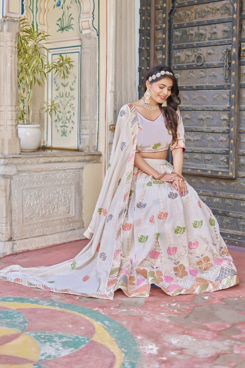 Radiate timeless beauty in this stunning Off-White Lehenga Choli, thoughtfully designed by Aethnofit Fashions. Crafted from soft and elegant Vichitra fabric, this ensemble stands out with its blend of fine thread embroidery, sparkling sequin work, and detailed hand-printed motifs. The addition of lace touch-up on the borders adds a graceful, designer flair to this already exquisite piece.