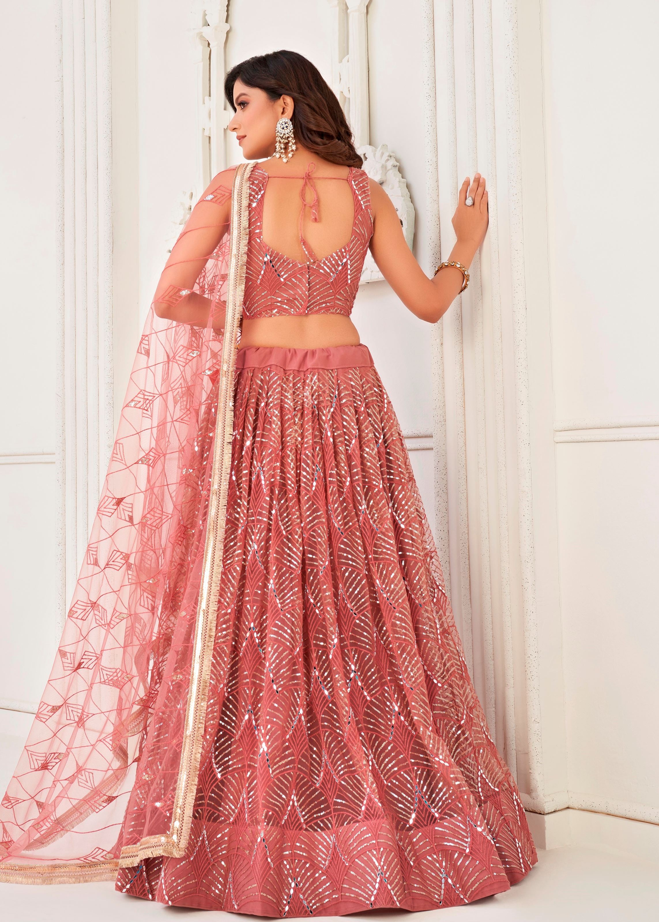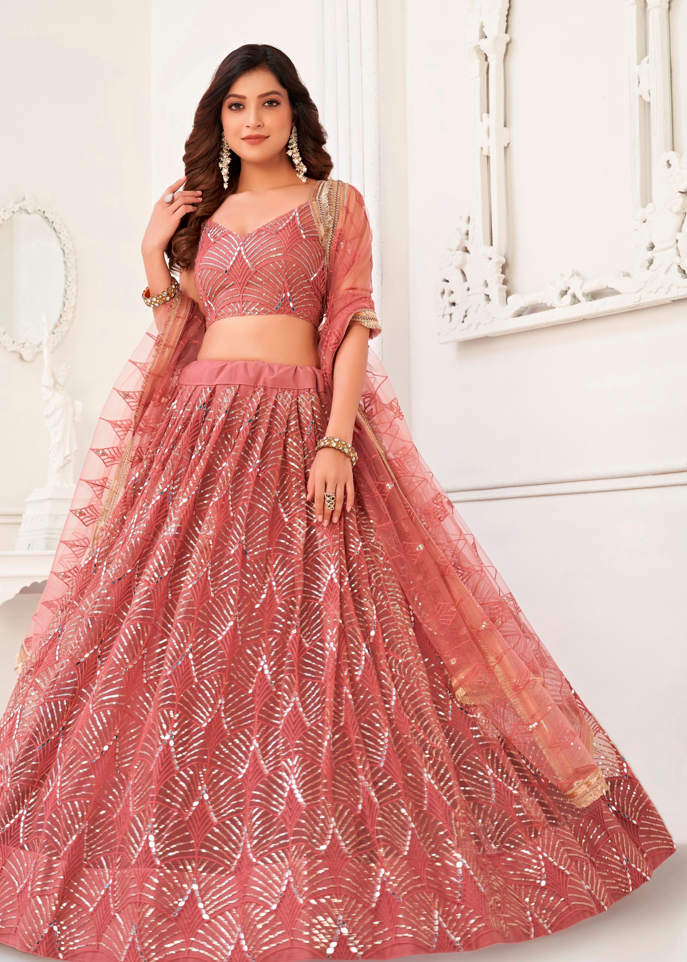 OnionPink Net Lehenga Choli With Thread Embroidery Real Mirror Work
