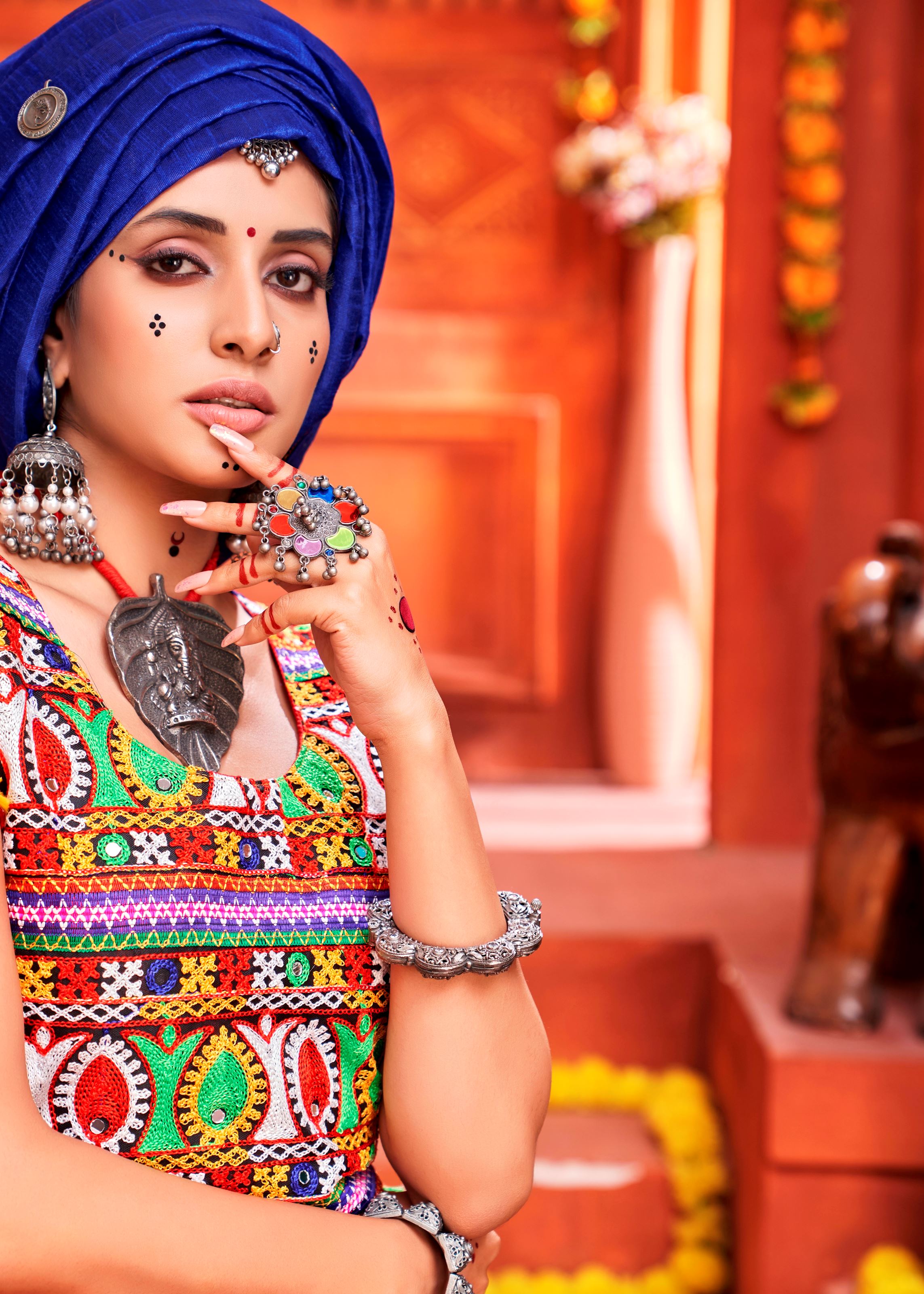 Celebrate Navratri with vibrant colors and traditional artistry in this stunning Orange and Royal Blue Navratri Chaniya Choli from Aethnofit Fashions. The lehenga and choli are crafted from soft mix cotton silk in a bright orange hue, featuring intricate Laheriya prints combined with detailed Gamthi work. Real mirror work adds a sparkling dimension, enhancing the festive appeal of this exquisite ensemble.