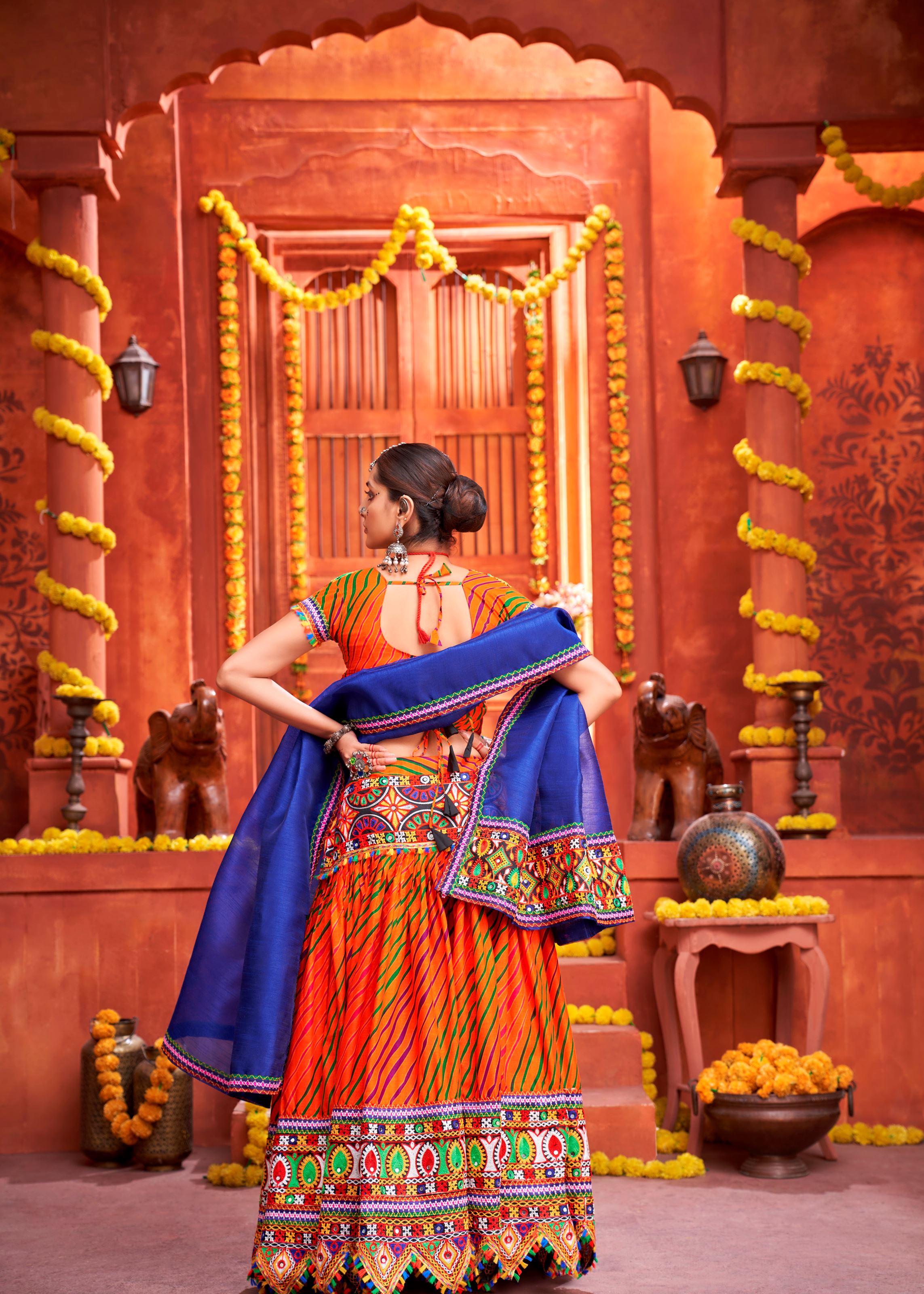 Orange And Royal Blue Navratri Chaniya Choli With Laheriya Print With Gamthi Work And Real Mirror Work