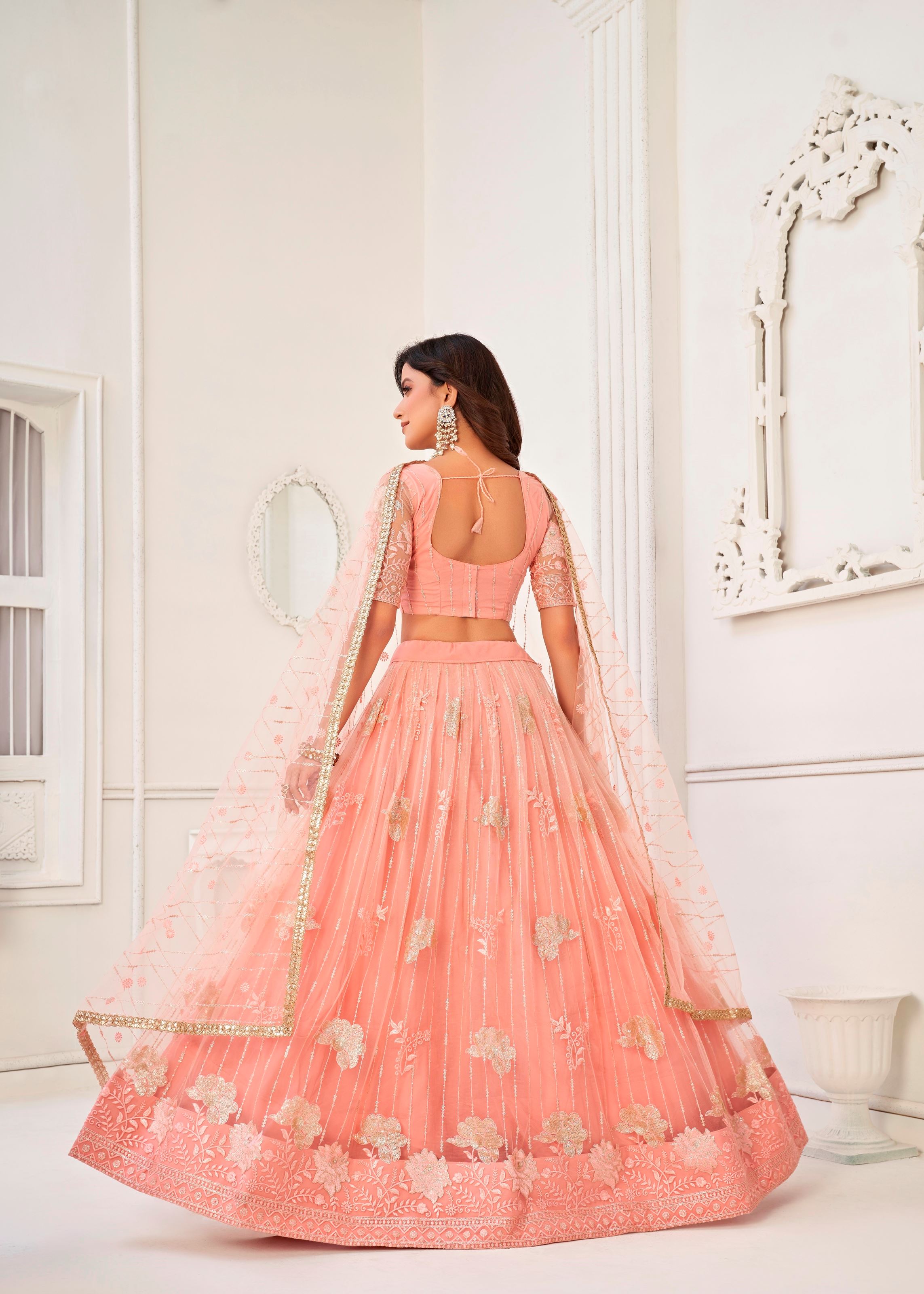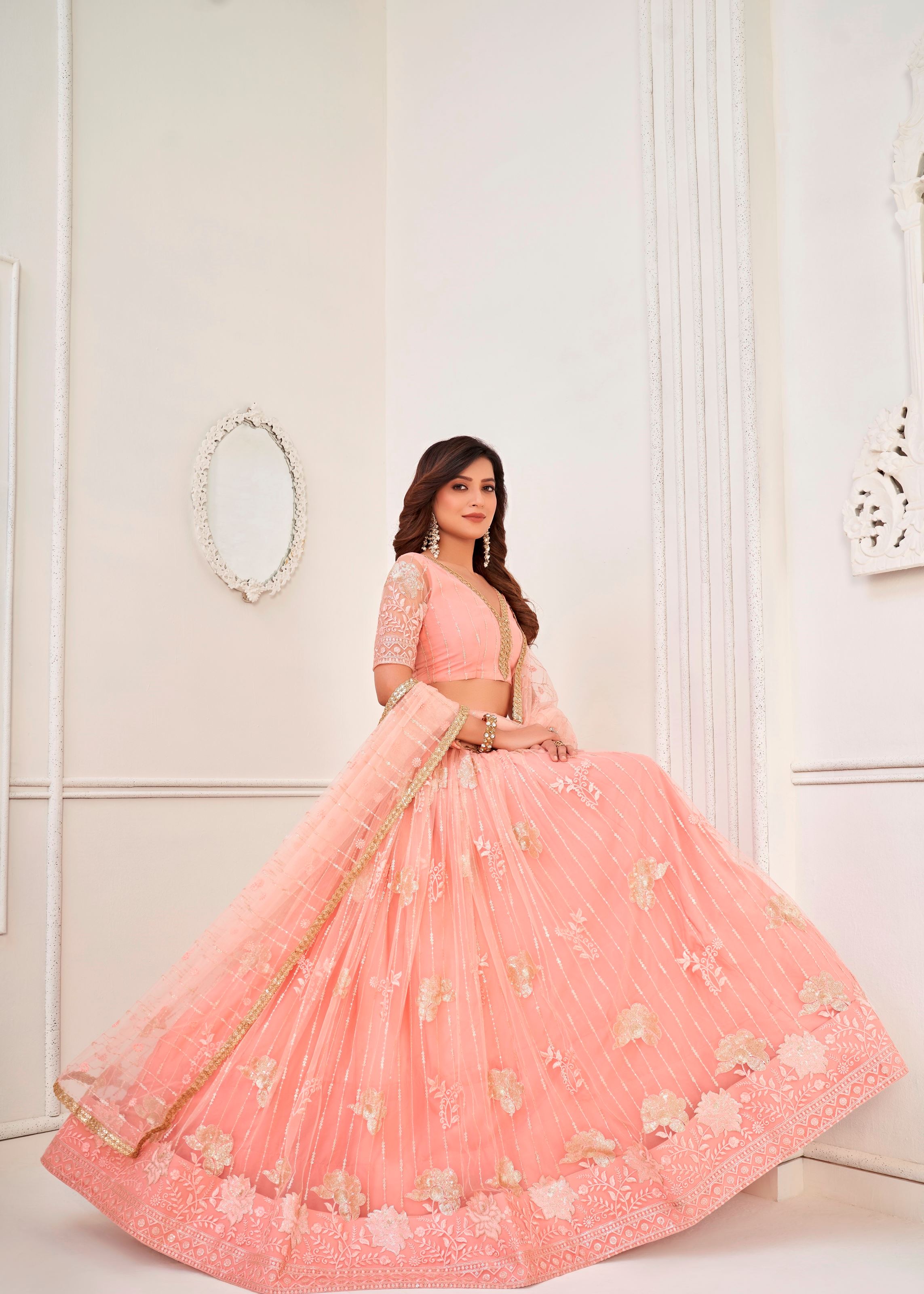 Peach Butterfly Net Lehenga Choli With Tone To Tone Thread Embroidery And Sequins Work