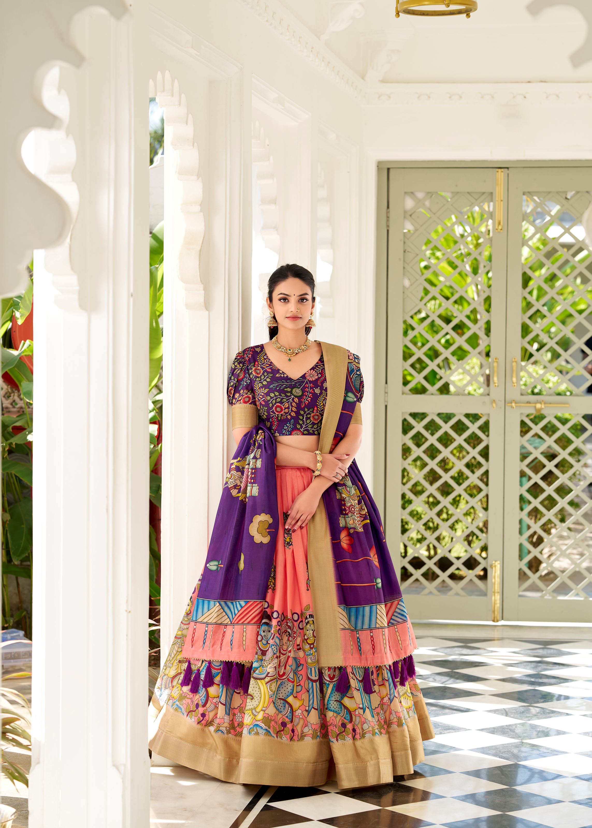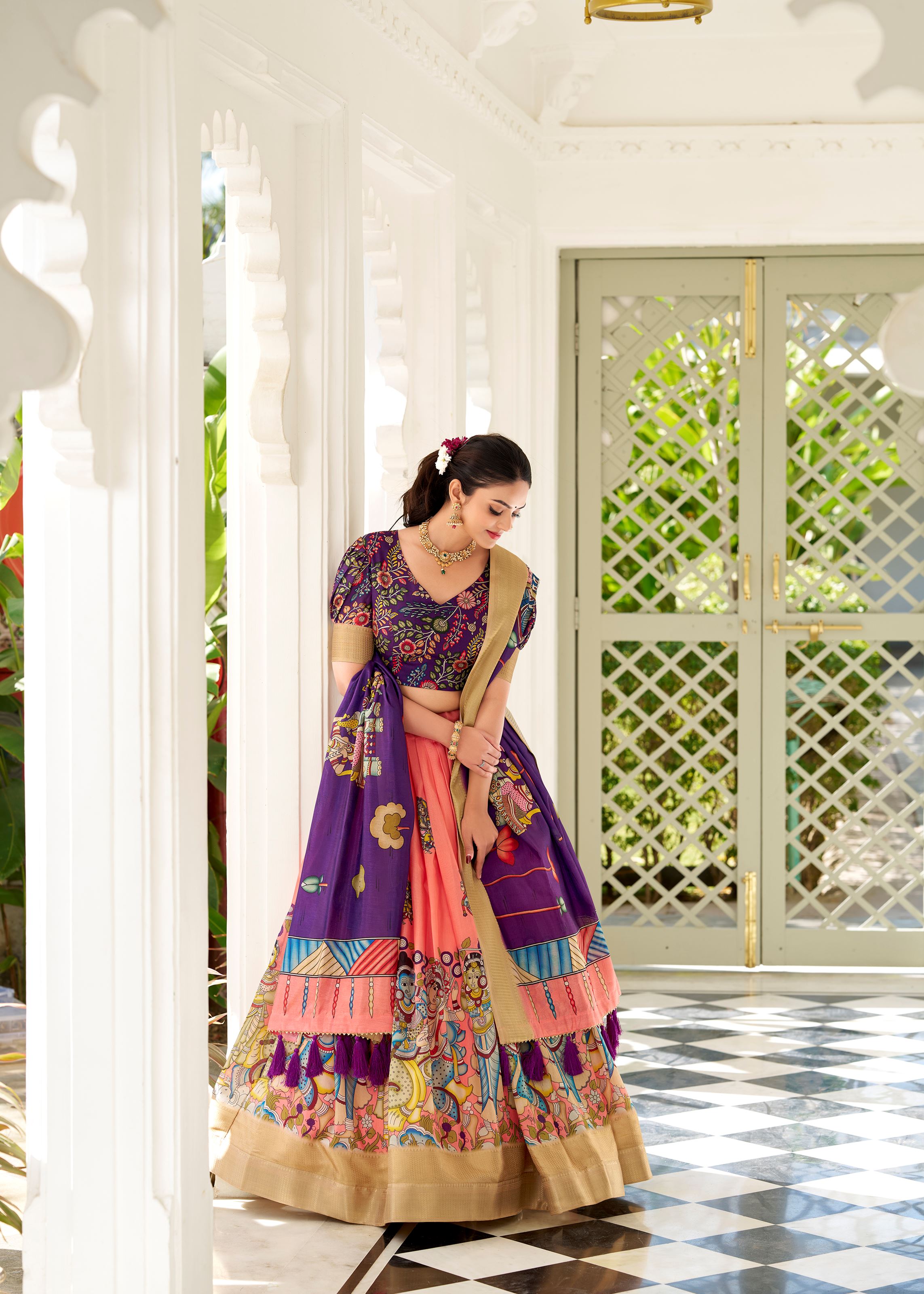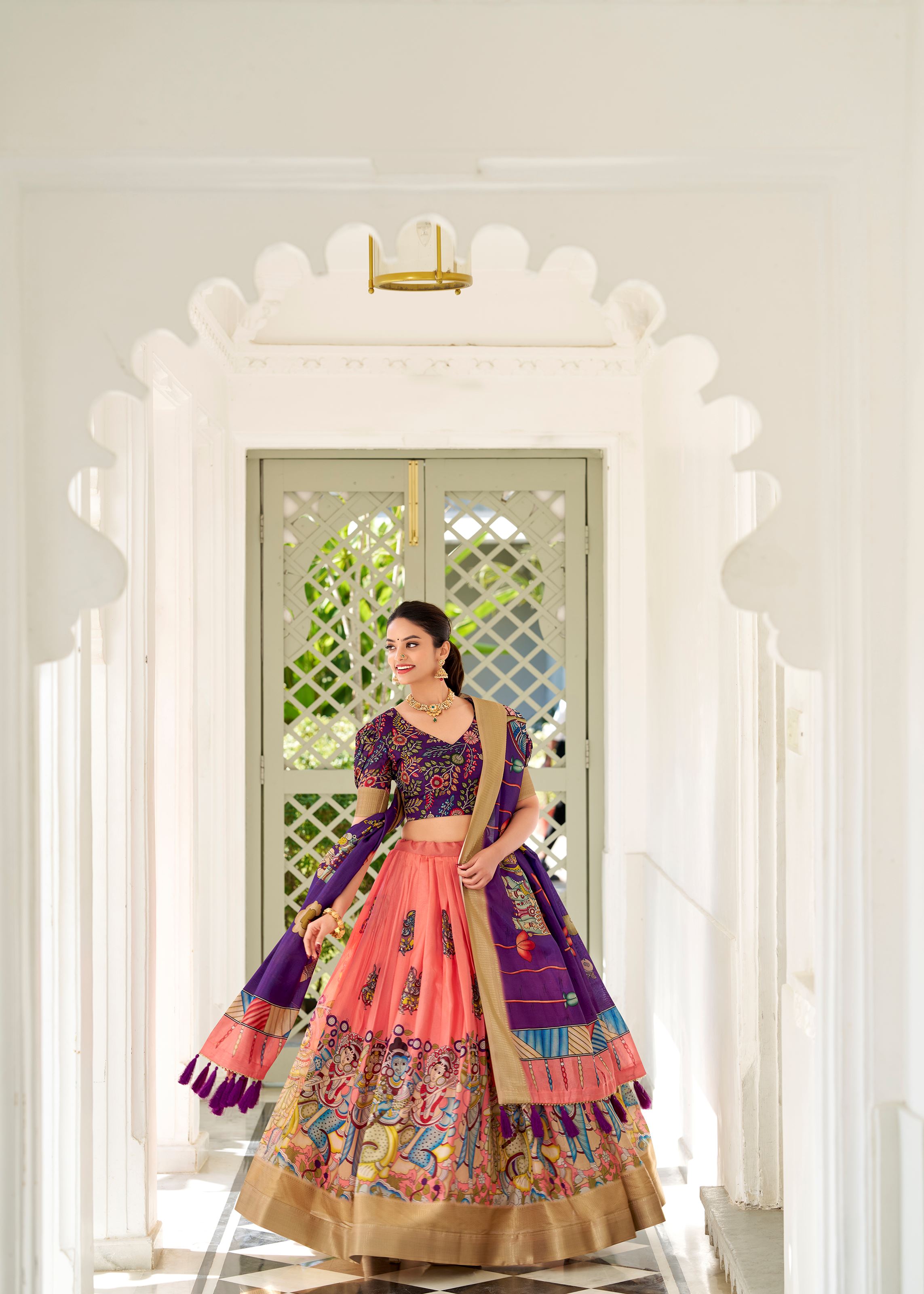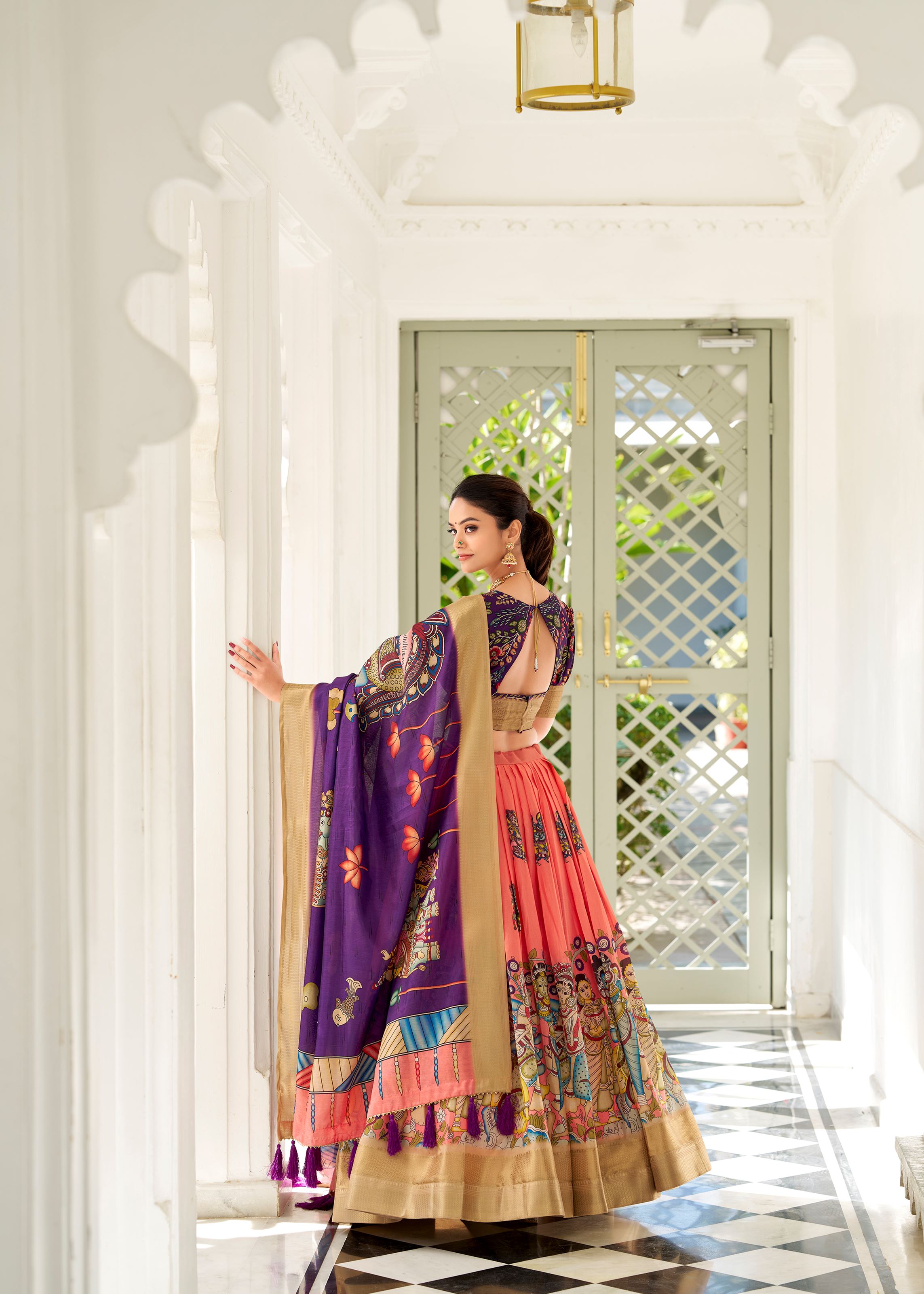 Peach Kalamkari Charm on Luxurious Dola Silk Lehenga with Woven Borders