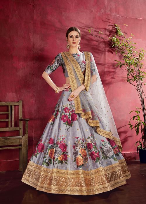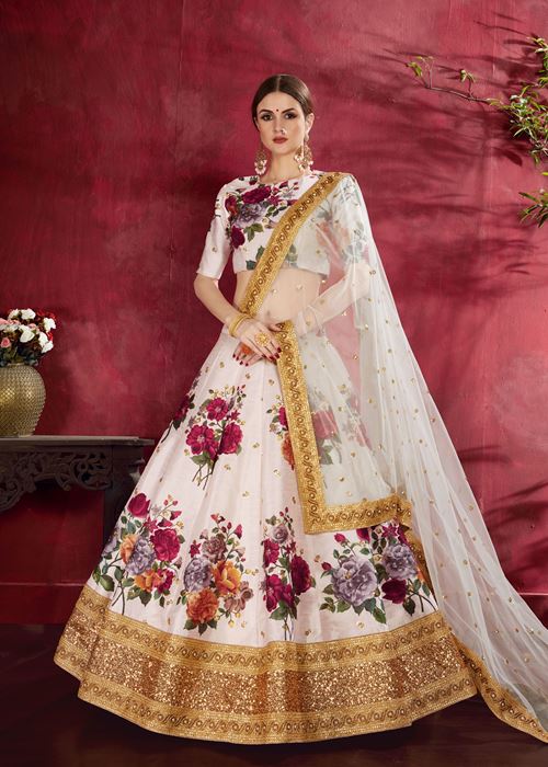 Peach Heavy Banglori Silk Lehenga Choli With Floral Print, Dori, Zari And Sequins Embroidery ----- SIZE (SEMI STITCHED) AVAILABLE UP TO 42 BUST AND WAIST
