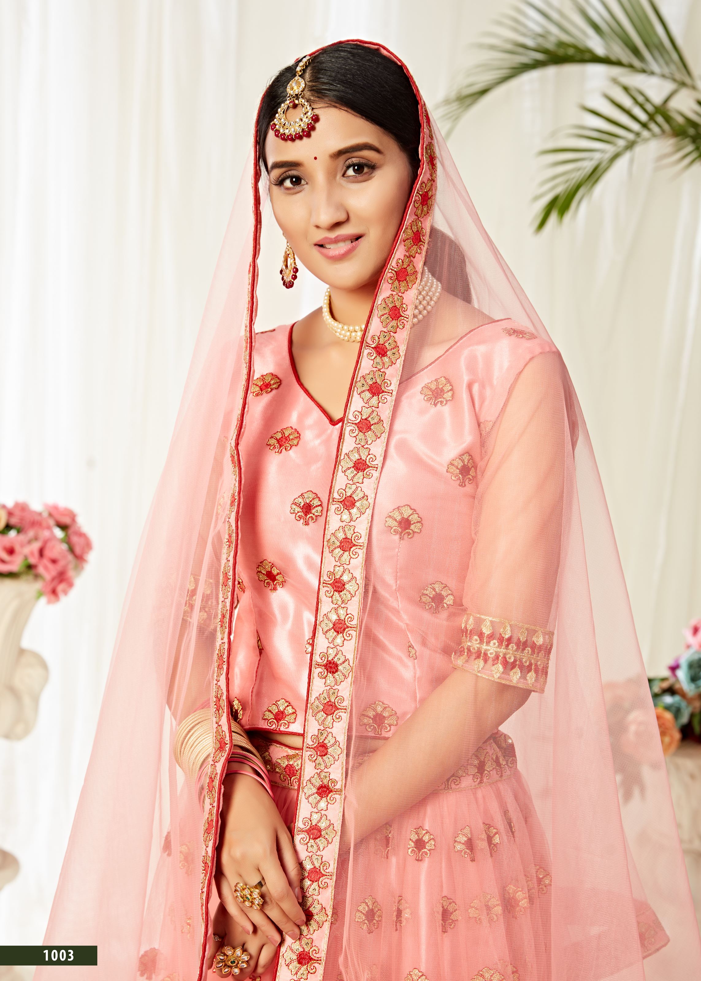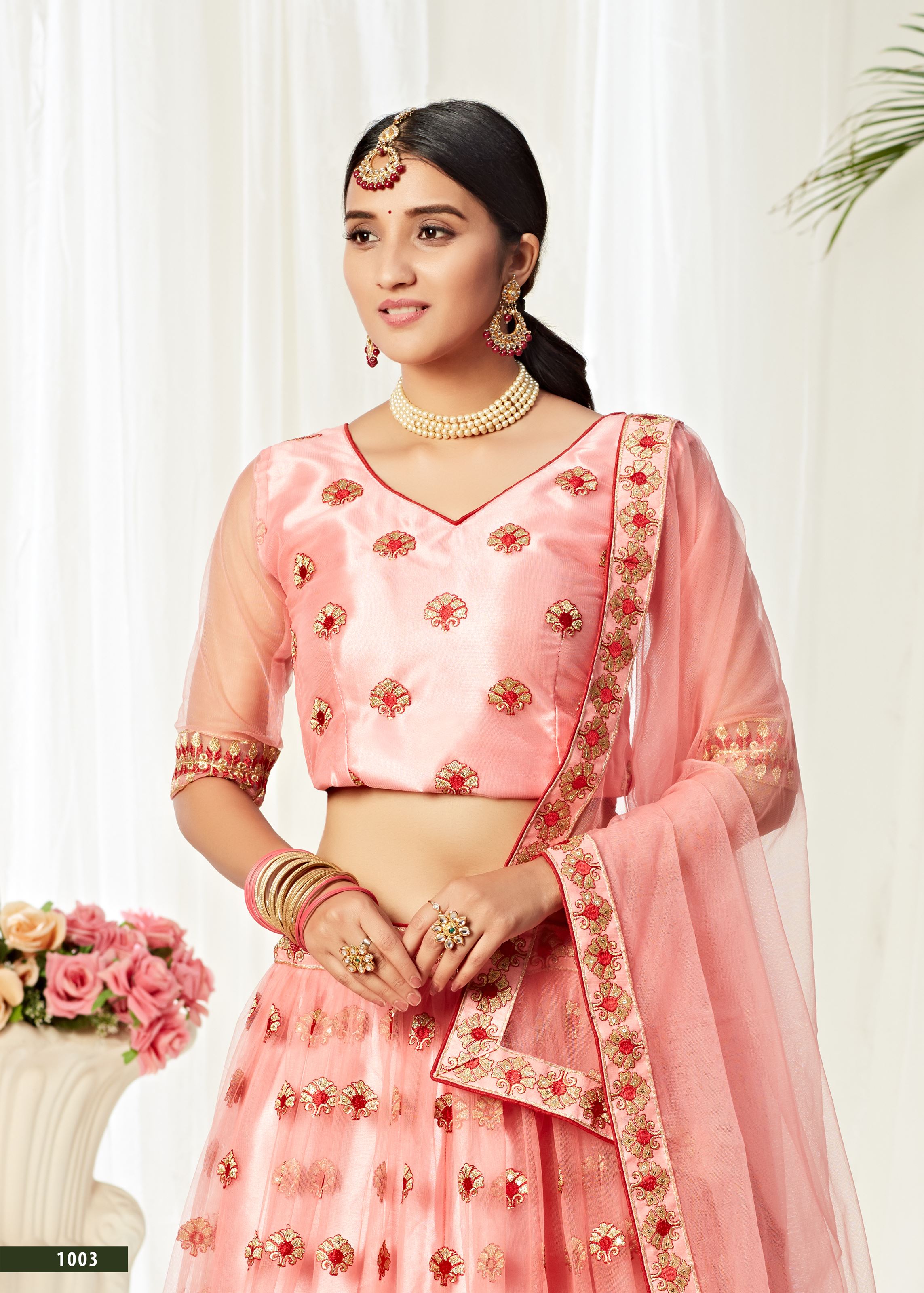 The matching art silk choli in peach enhances the coordinated aesthetic, offering both comfort and sophistication. Embellished with the same detailed embroidery, it brings a refined ethnic touch to the overall look. A soft net dupatta in peach, finished with subtle accents, completes this ensemble, giving it a balanced blend of traditional charm and contemporary style.