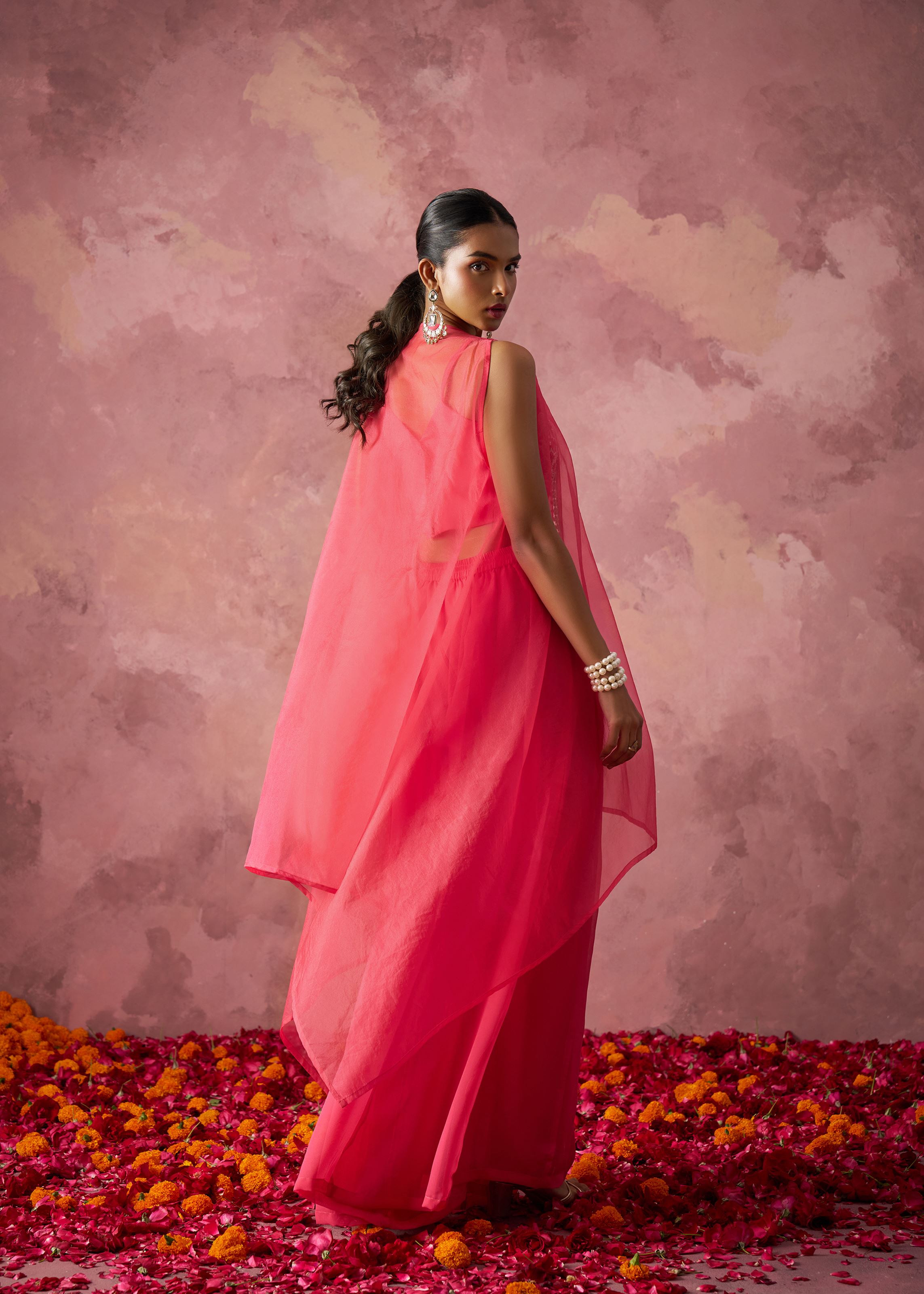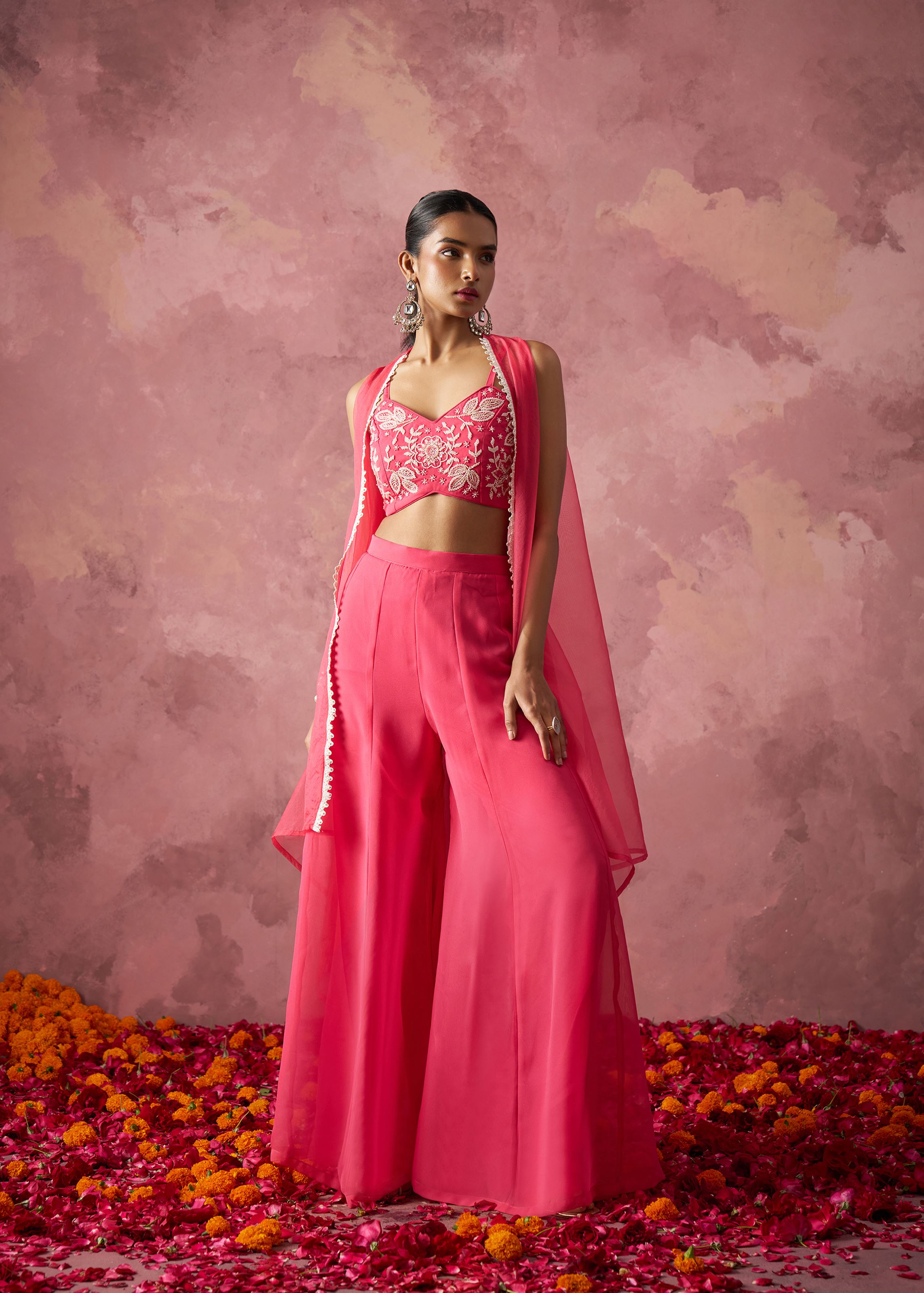 The ensemble is elevated by a pure khatli work blouse — a highlight of traditional Indian hand embroidery. Crafted on matching georgette, the blouse is intricately adorned with metallic thread detailing that adds a sophisticated shimmer and heritage richness. Paired with a light organza dupatta, the complete outfit feels weightless yet luxurious, offering endless styling possibilities from ethnic chic to fusion glam.
