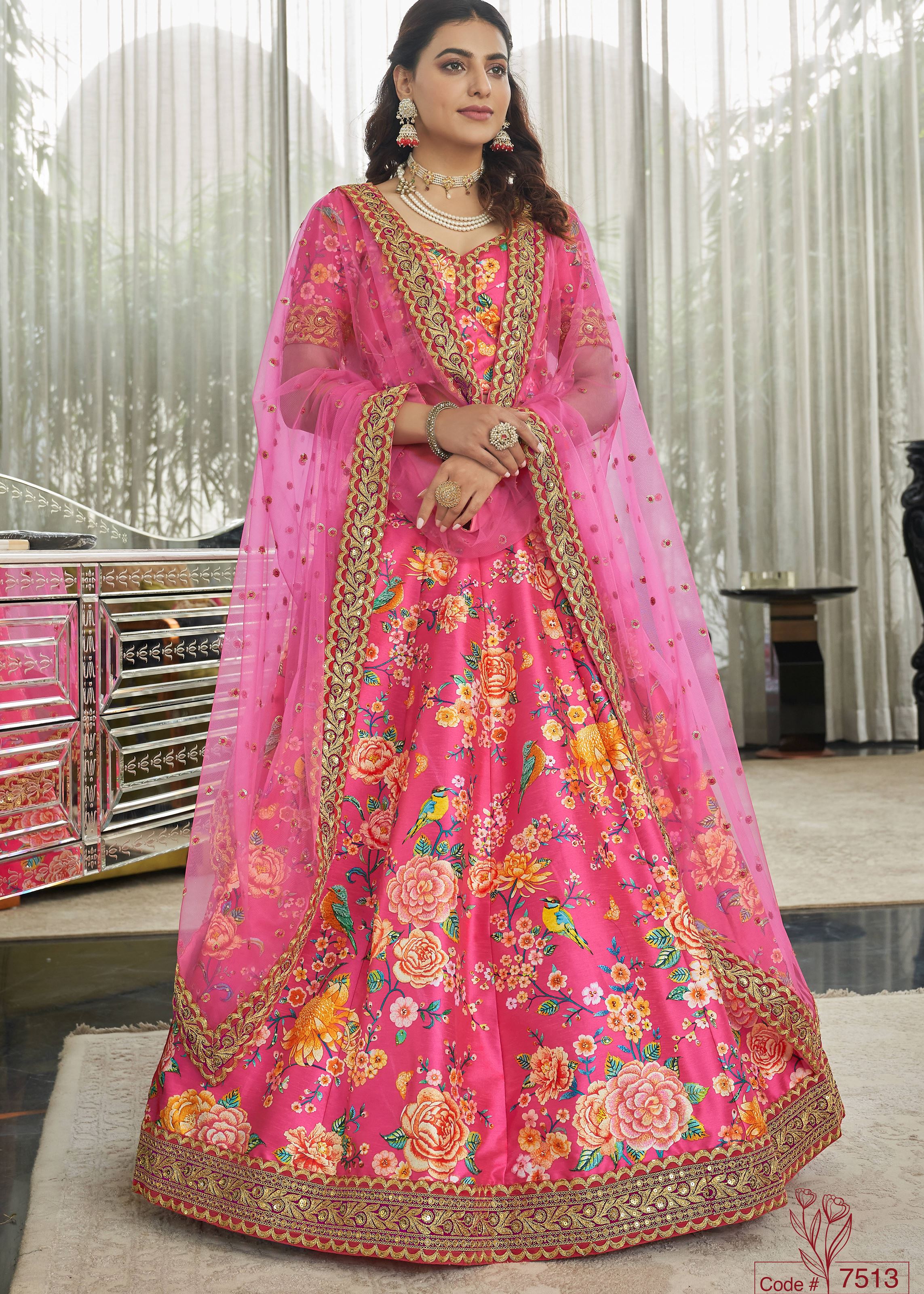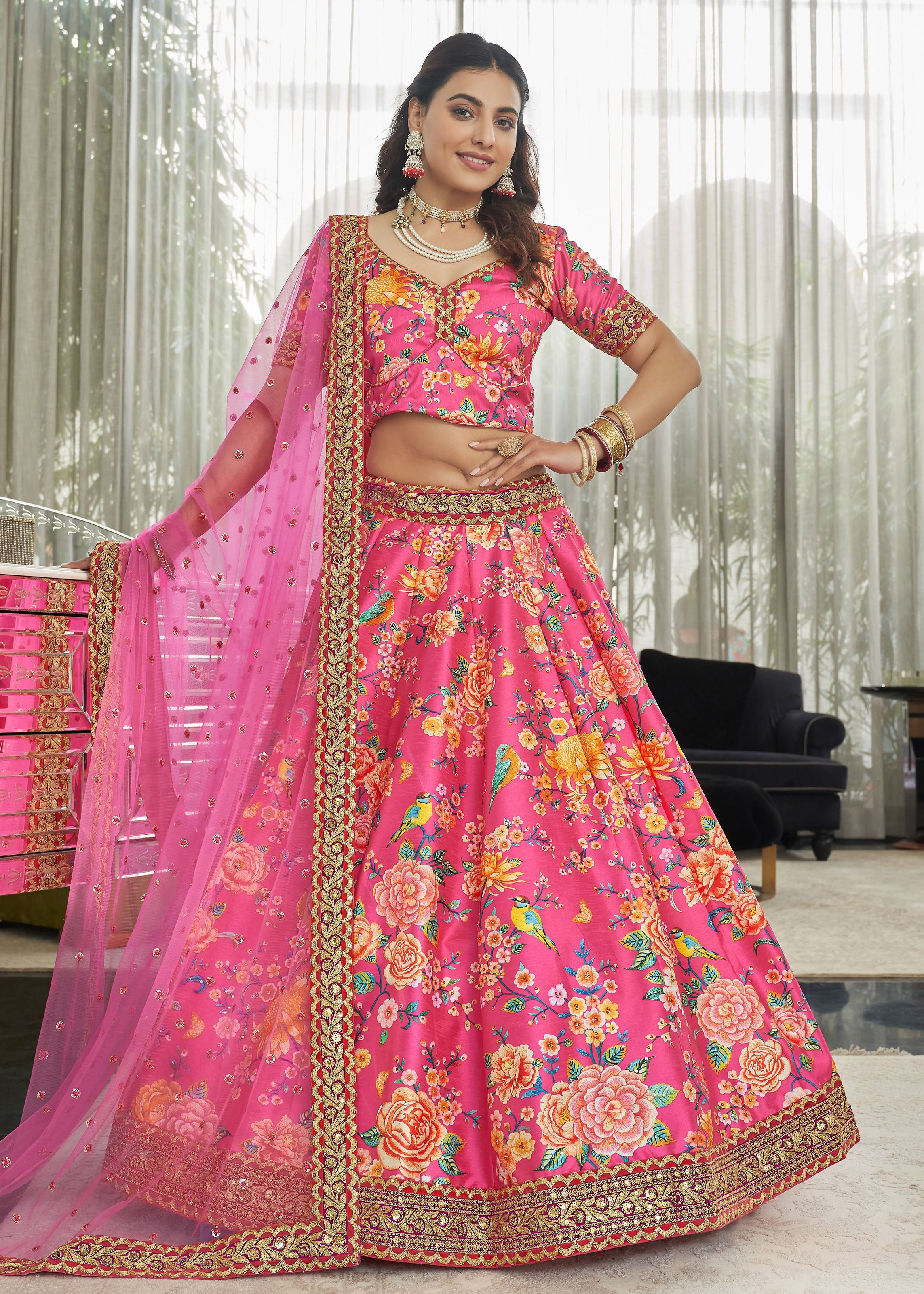 Pink Art Silk Lehenga Choli With Digital Print With Dori, Sequins And Stone Work ----- SIZE (SEMI STITCHED) AVAILABLE UP TO 42 BUST AND WAIST