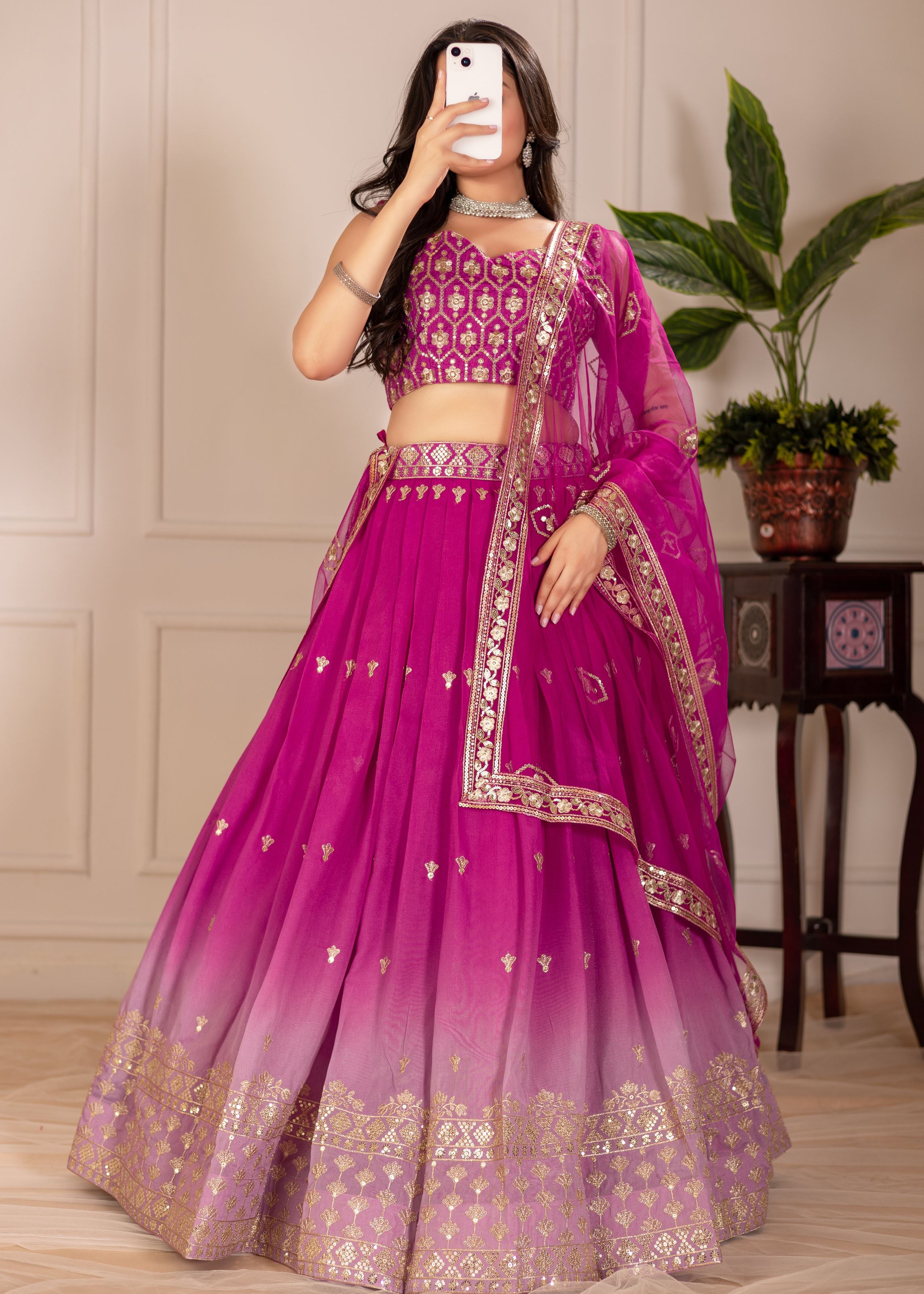 Turn every celebration into a style statement with Aethnofit Fashions’ Pink Lehenga Choli, gracefully designed with detailed thread embroidery and elegant sequin work. Crafted from premium Shimmer Silk, this ensemble radiates charm, offering a luxurious texture with a soft shine—perfect for weddings, festive gatherings, and special occasions.