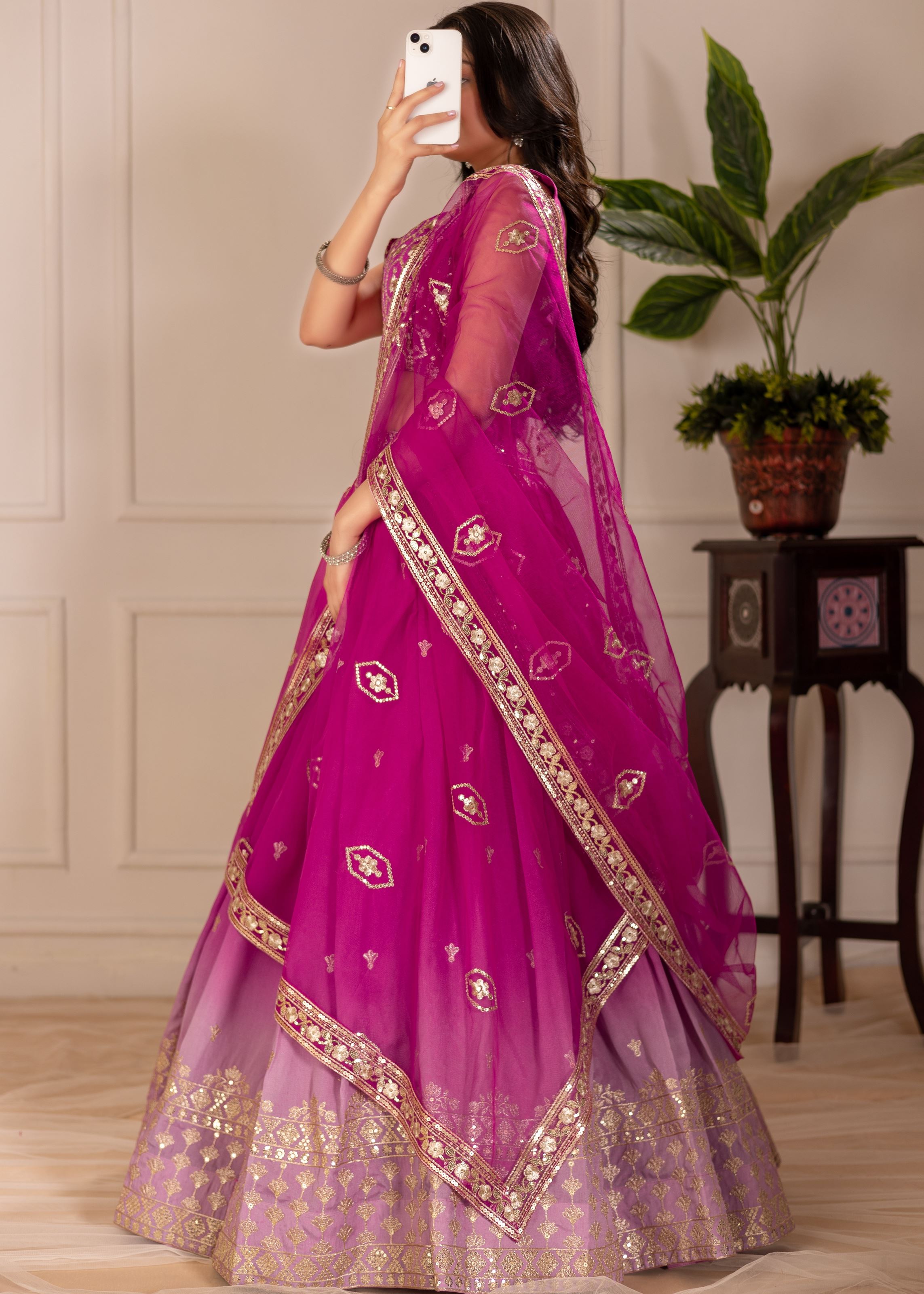 The vibrant pink tone symbolizes joy and festivity, while the intricate threadwork adds cultural richness and fine craftsmanship. Delicately embellished sequins lend just the right amount of sparkle, creating a look that's both graceful and eye-catching. The matching shimmer silk blouse ensures a cohesive, flattering silhouette, and the light net dupatta in pink adds a soft, airy finish to complete the look.