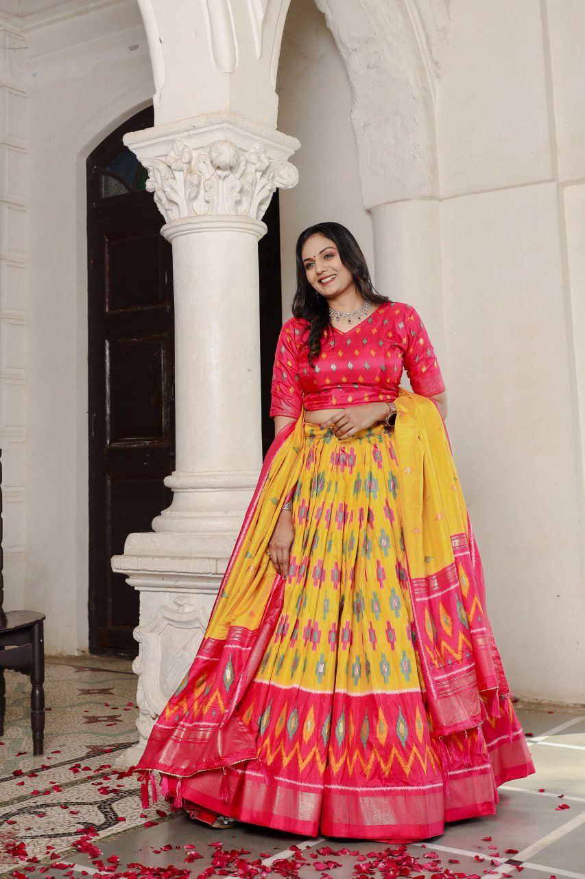 Make a bold yet graceful statement with this vibrant Pink Lehenga Choli, exquisitely designed by Aethnofit Fashions. Crafted from premium Dola Silk, the lehenga features traditional Patola print, known for its rich geometric patterns and cultural heritage. Accentuated with a stylish foil work belt, this ensemble strikes the perfect balance between ethnic elegance and modern flair—ideal for festive occasions, sangeet nights, or cultural celebrations.