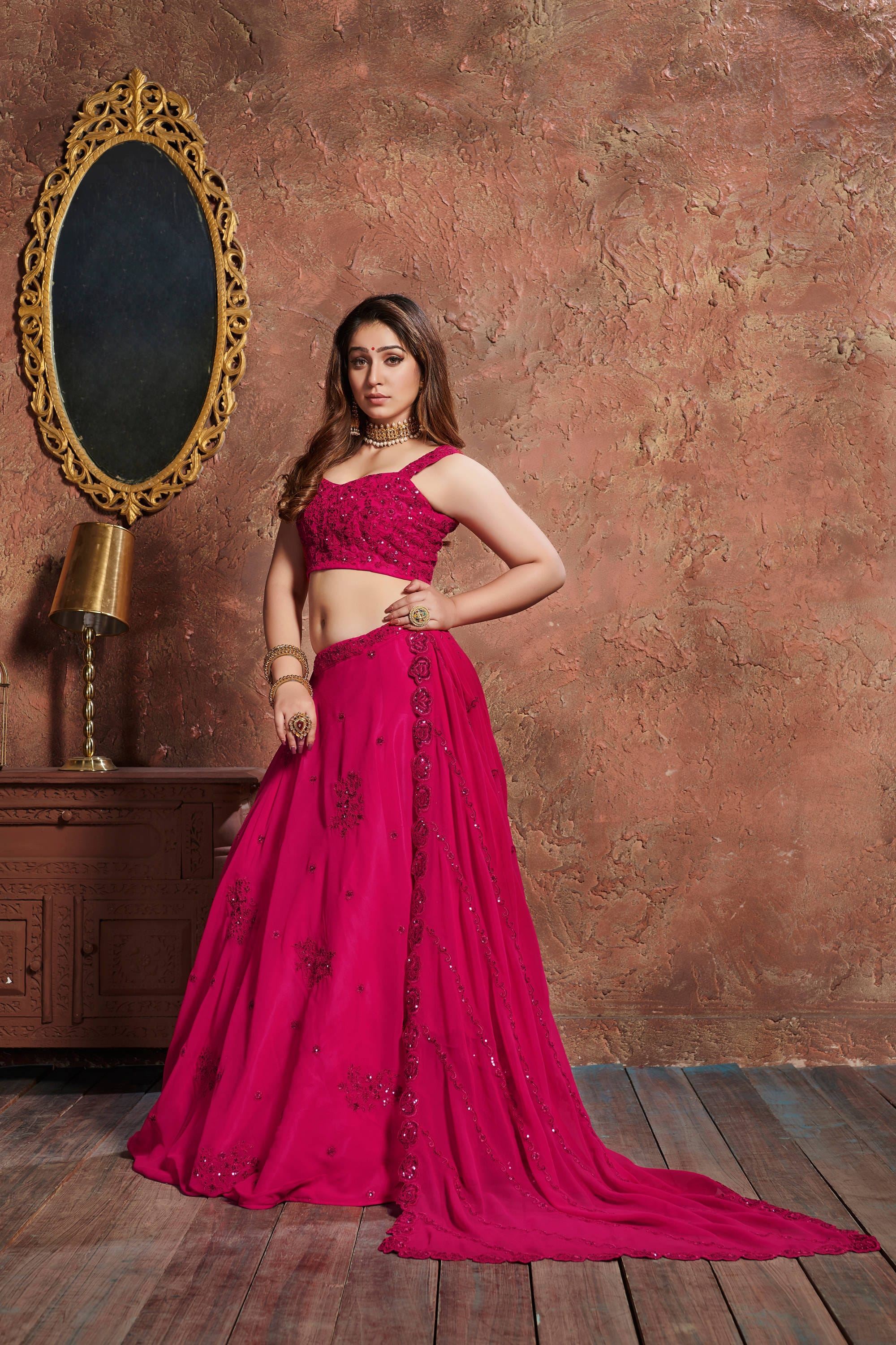 Pink Georgette Lehenga Choli With Zari, Sequins And Dori Embroidery ----- SIZE (SEMI STITCHED) AVAILABLE UP TO 42 BUST AND WAIST