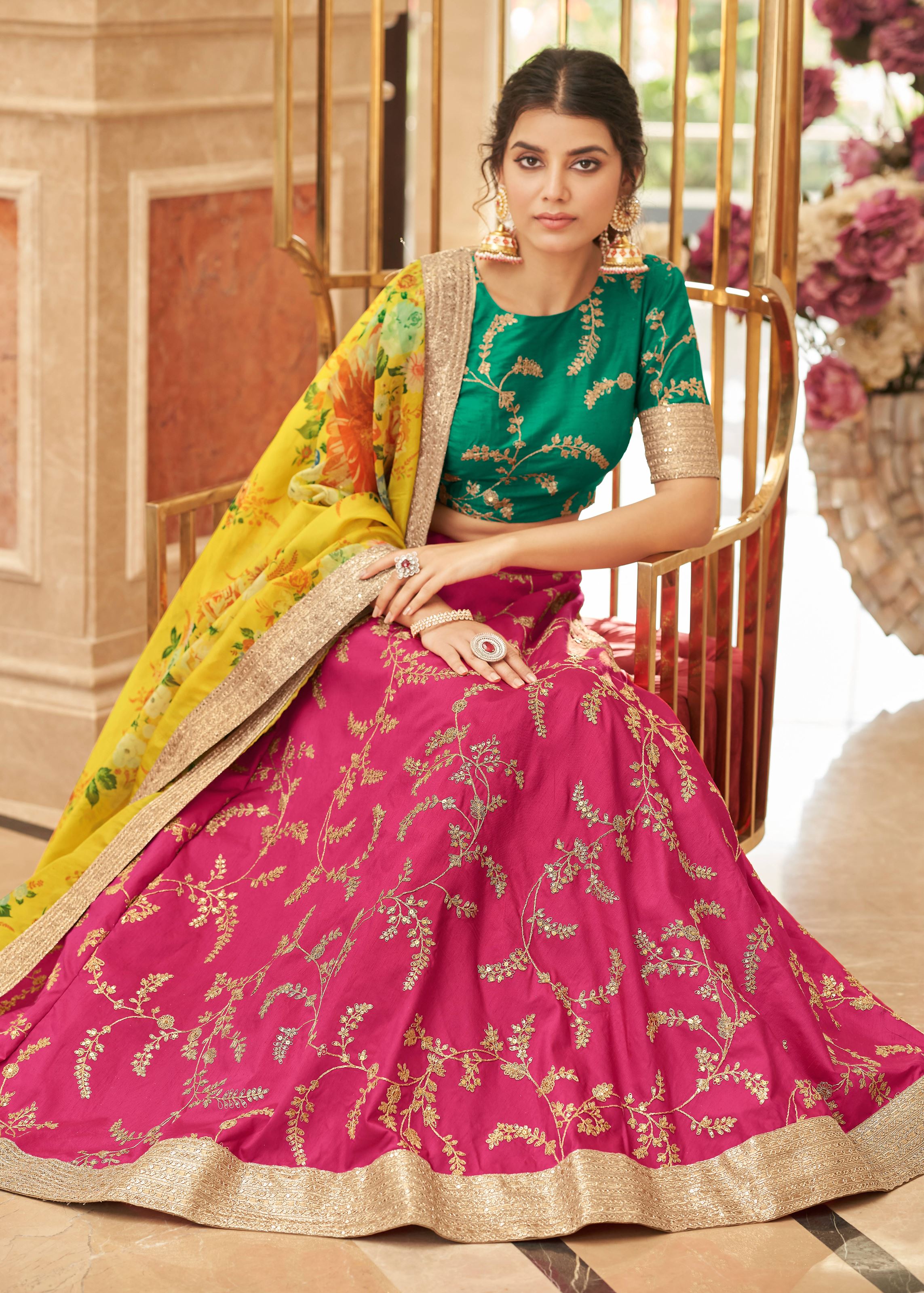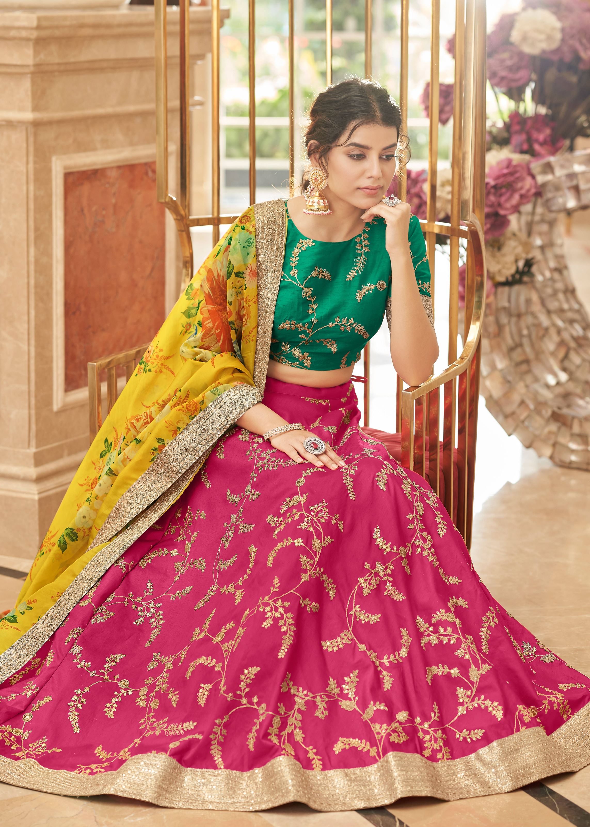 Pink-Yellow Art Silk Lehenga Choli With Thread, Zari, Dori And Sequins Embroidery Work ----- SIZE (SEMI STITCHED) AVAILABLE UP TO 42 BUST AND WAIST