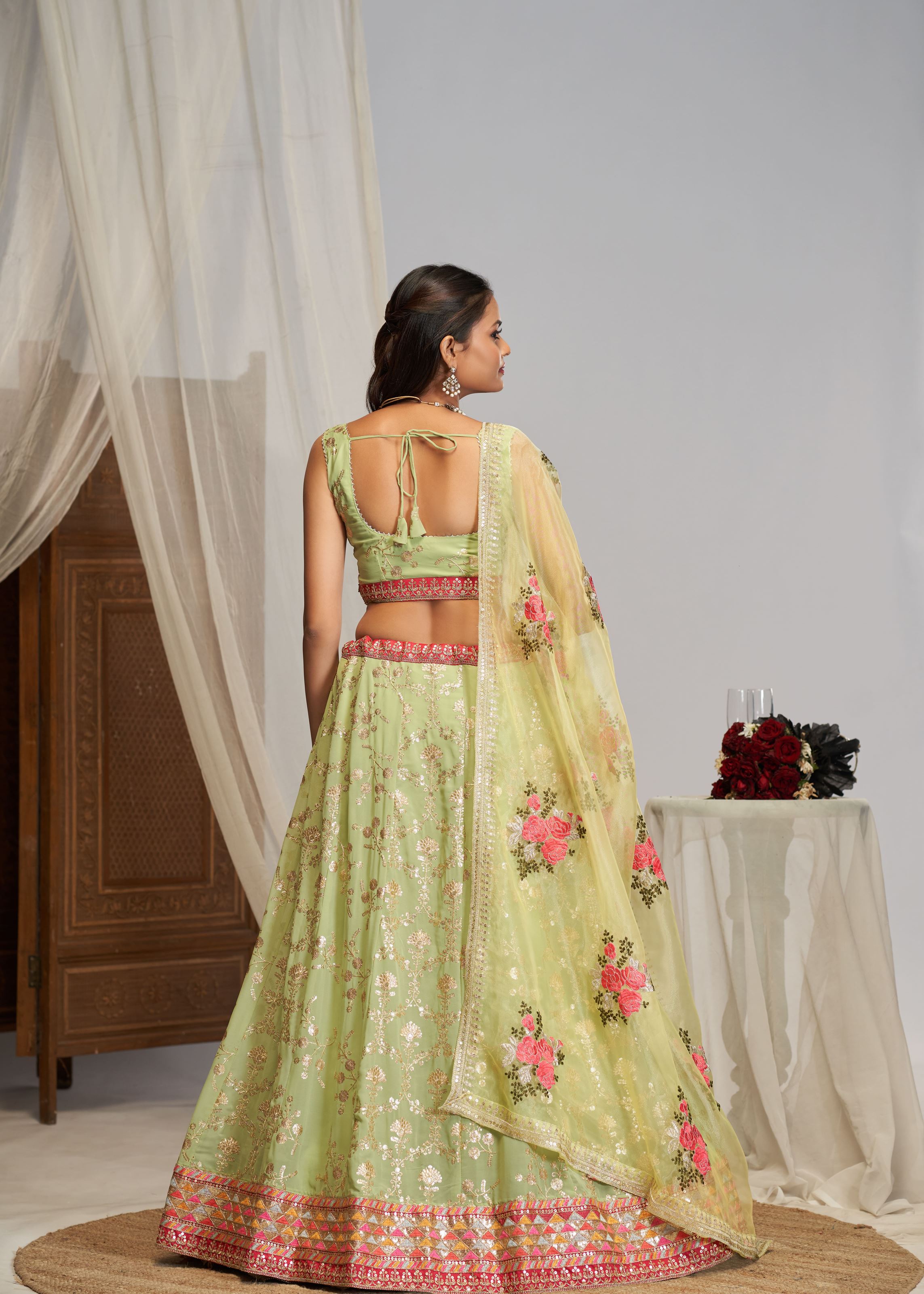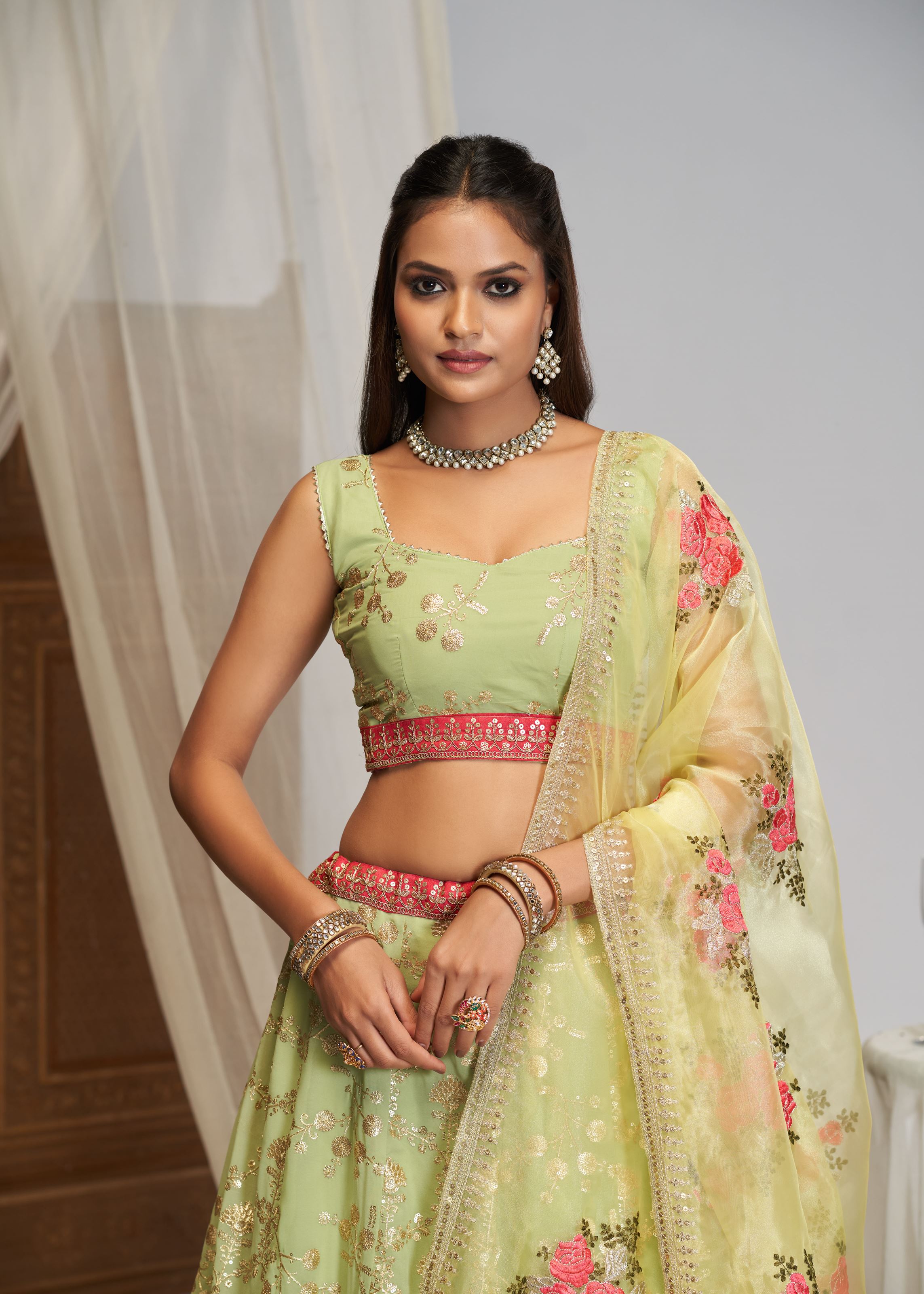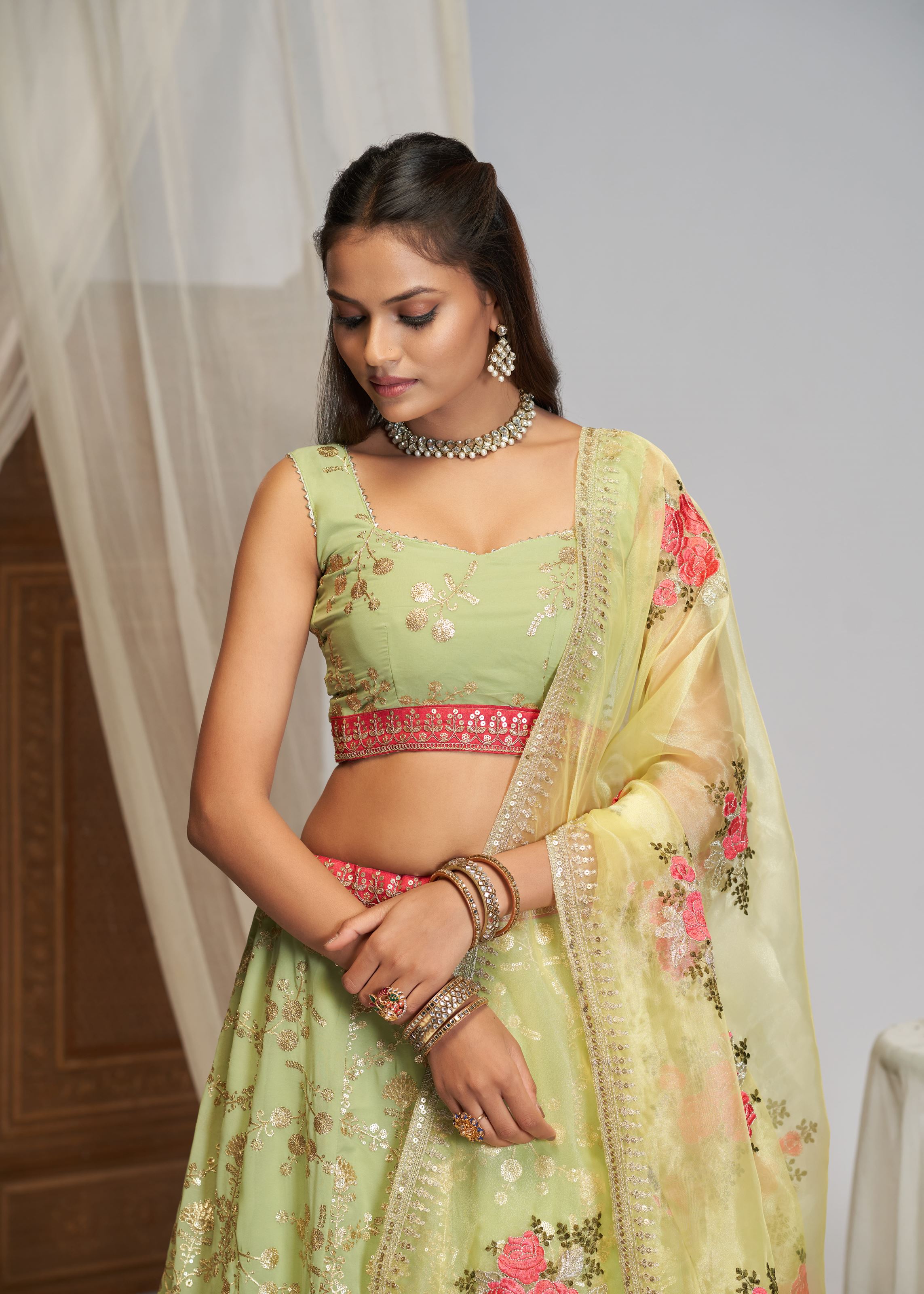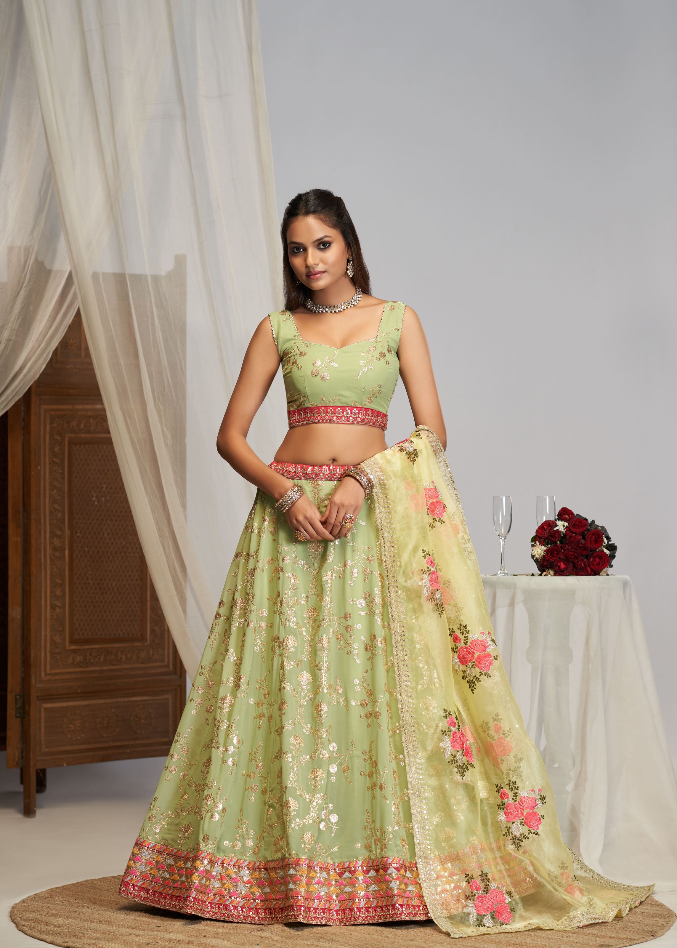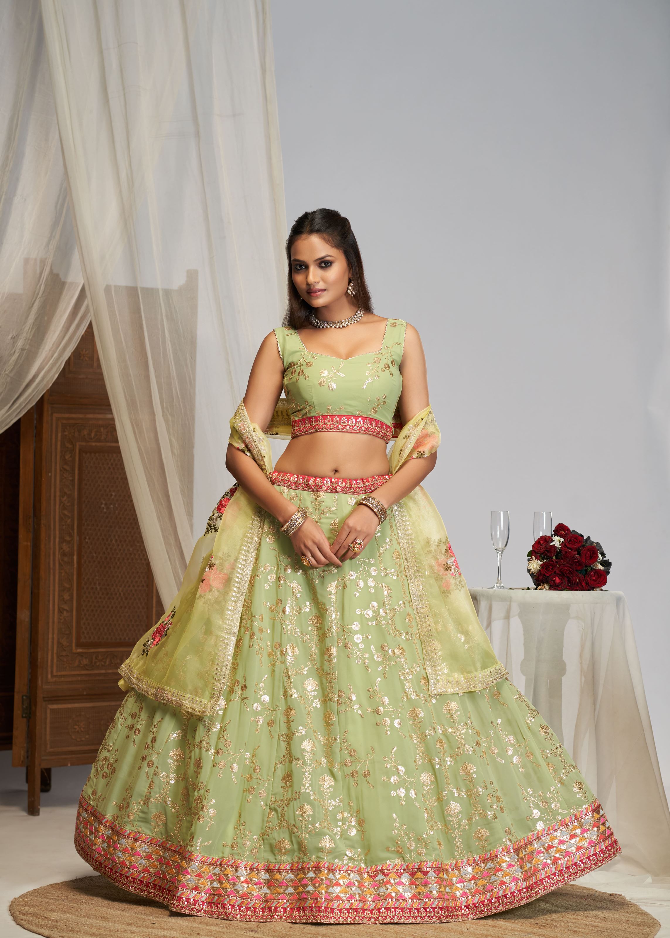 Pista Green Zari Thread Sequence Embroidery Work Lehenga Choli