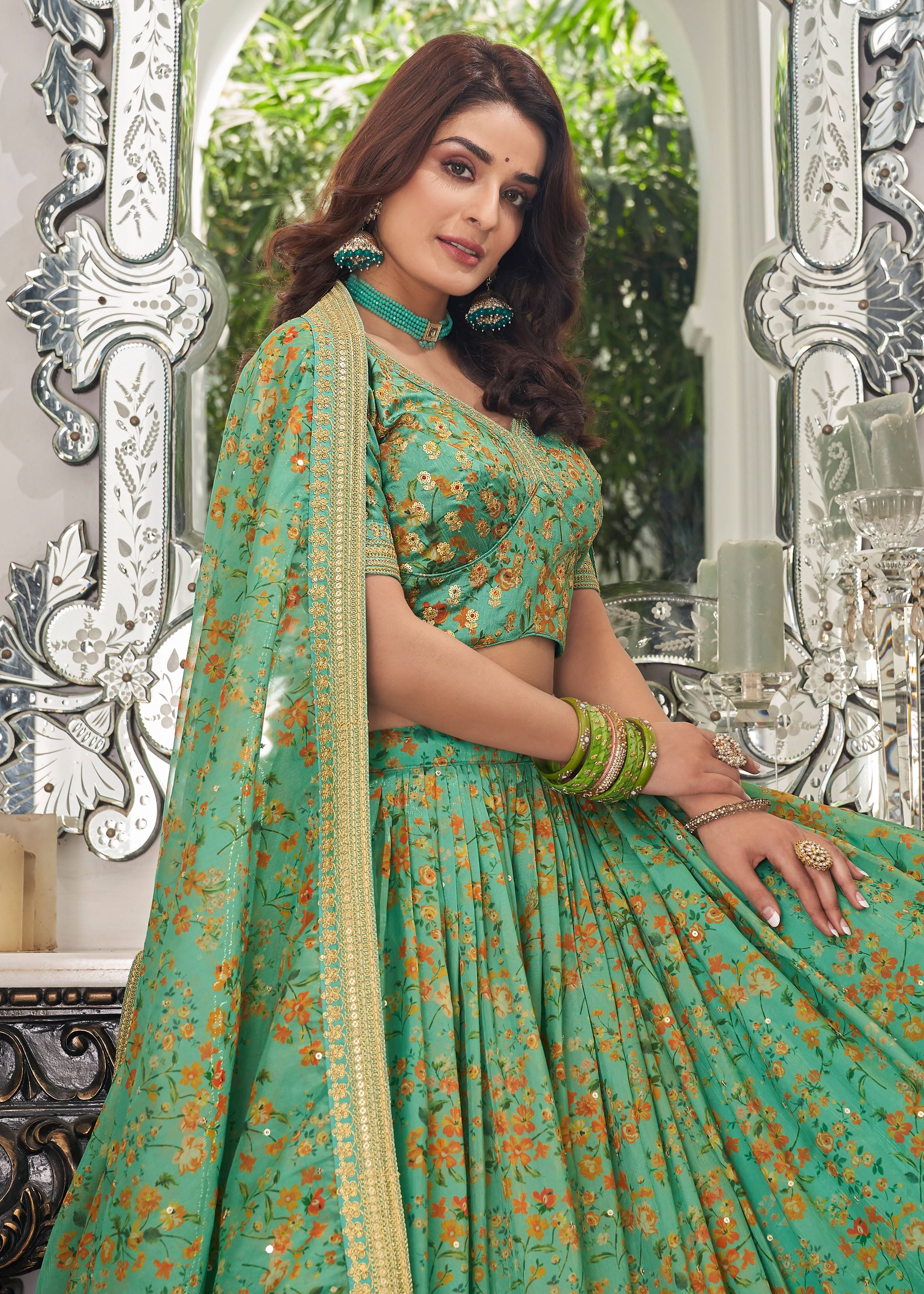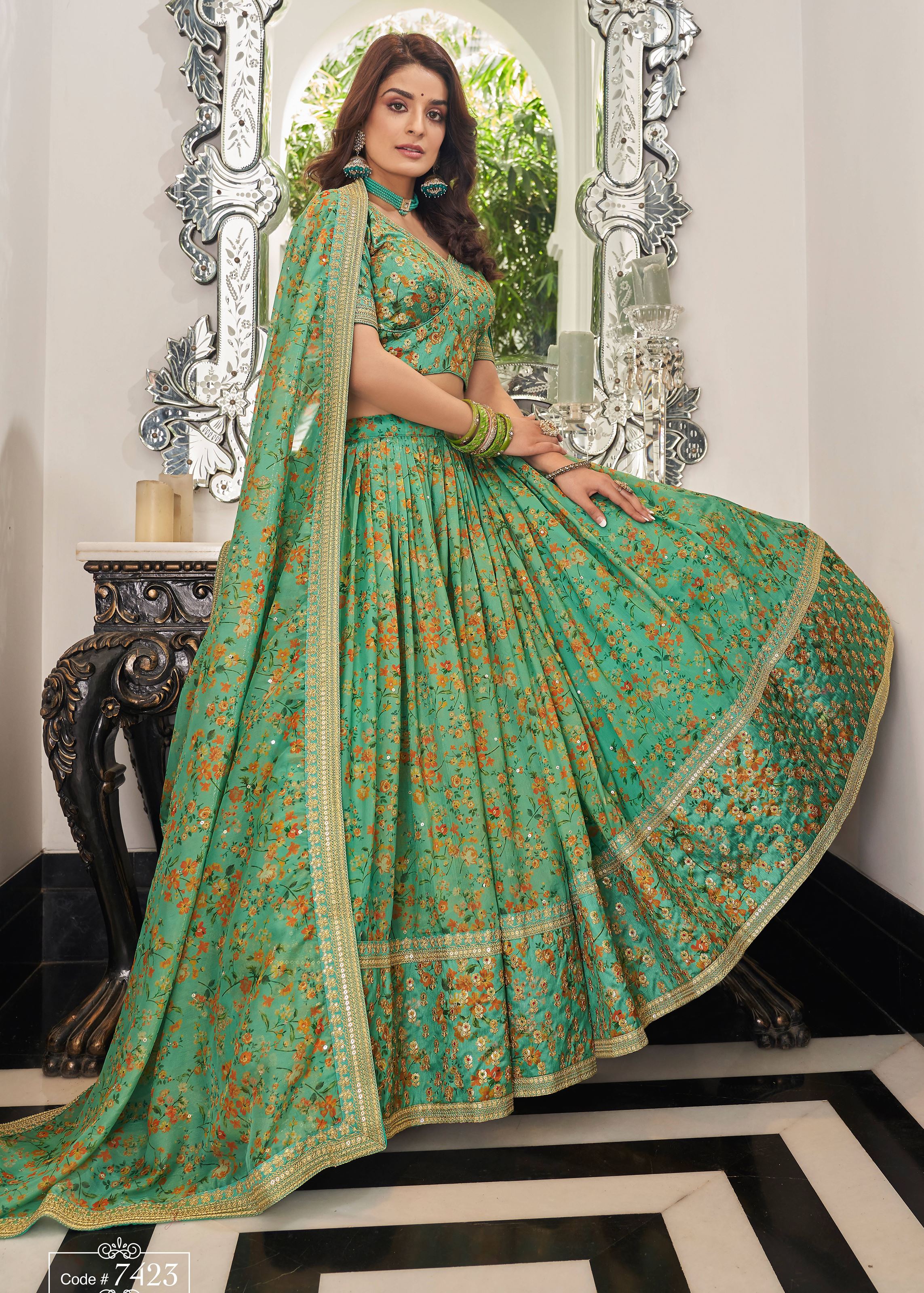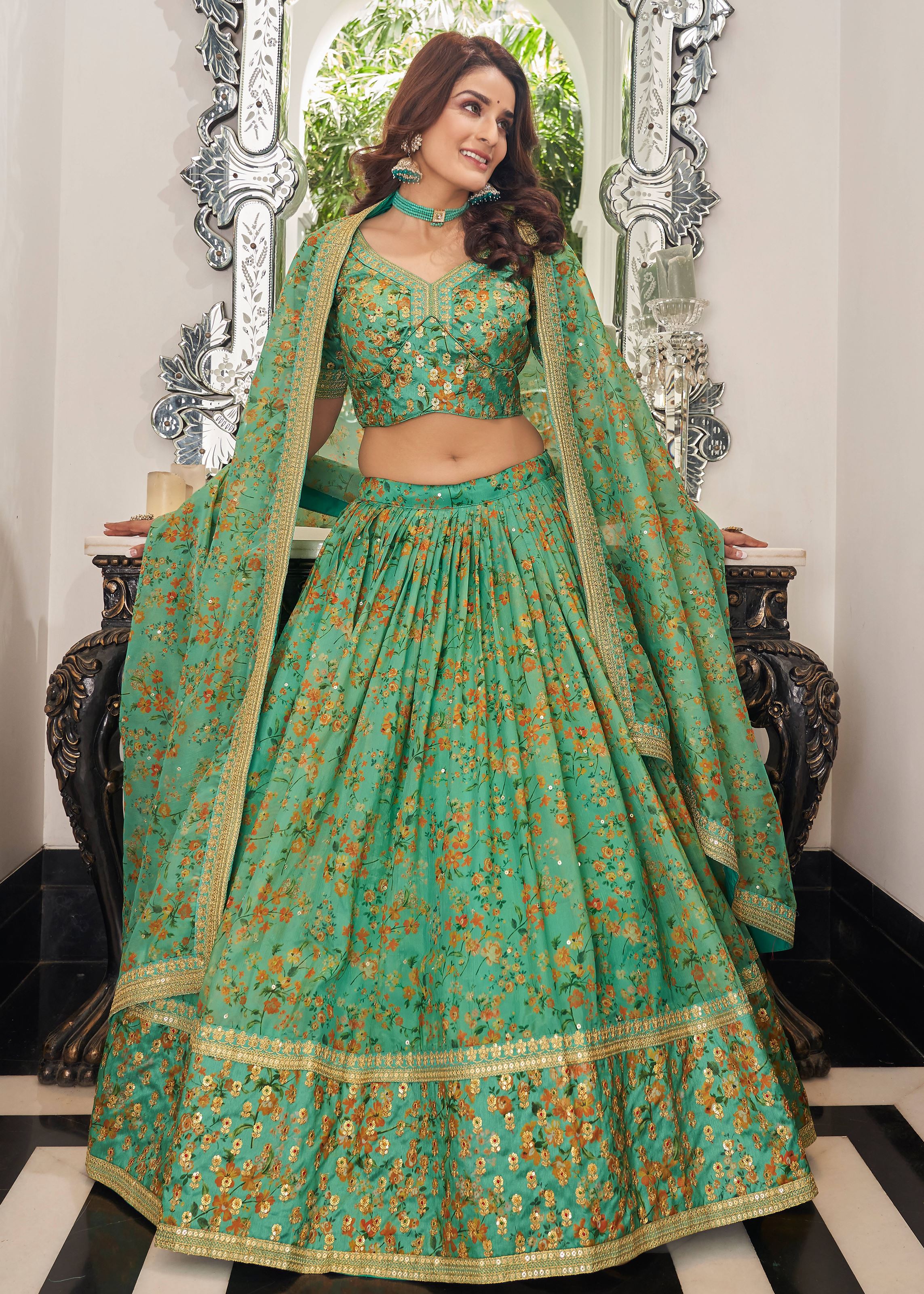 Pista Organza Lehenga Choli With Thread, Zari, Dori And Sequins Embroidery Work ----- SIZE (SEMI STITCHED) AVAILABLE UP TO 42 BUST AND WAIST