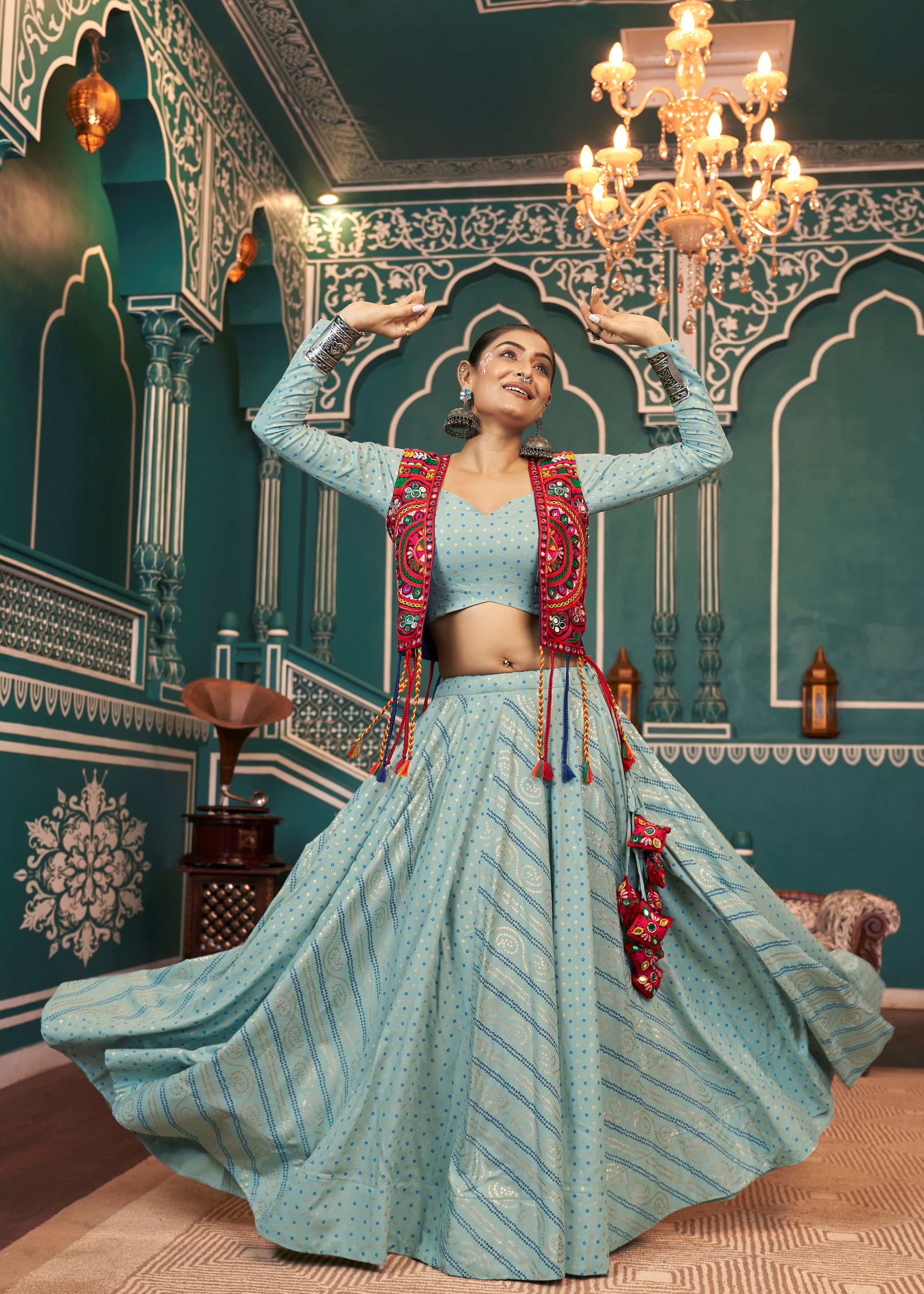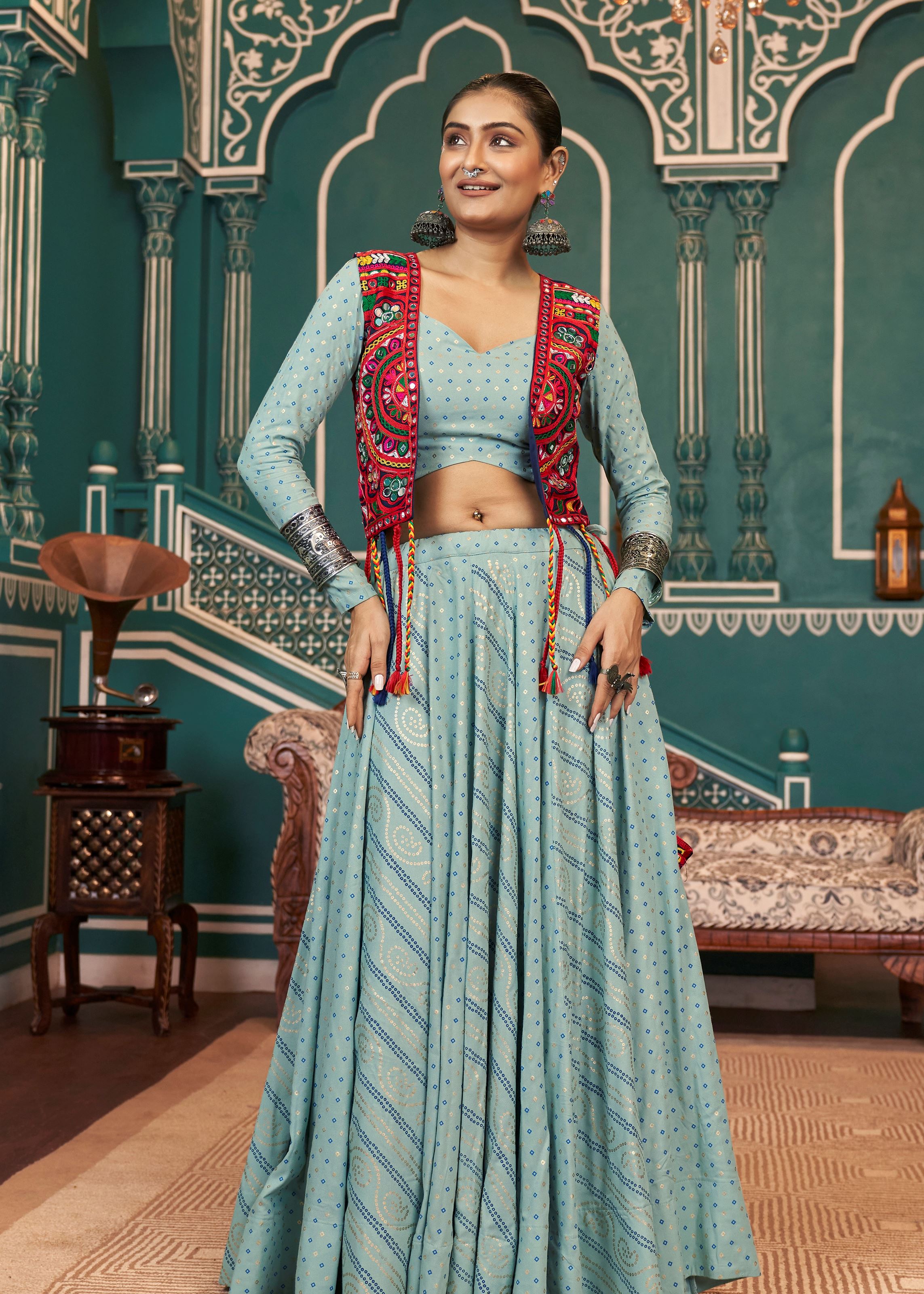 The lehenga flows gracefully in a serene pistagreen hue, adorned with subtle embroidery that enhances its minimalist beauty. Paired with a matching embroidered Rayon blouse and a coordinated Rayon dupatta, the look is effortlessly cohesive and refined. The lightweight fabric and pastel shade make this outfit ideal for daytime wear or summer occasions.