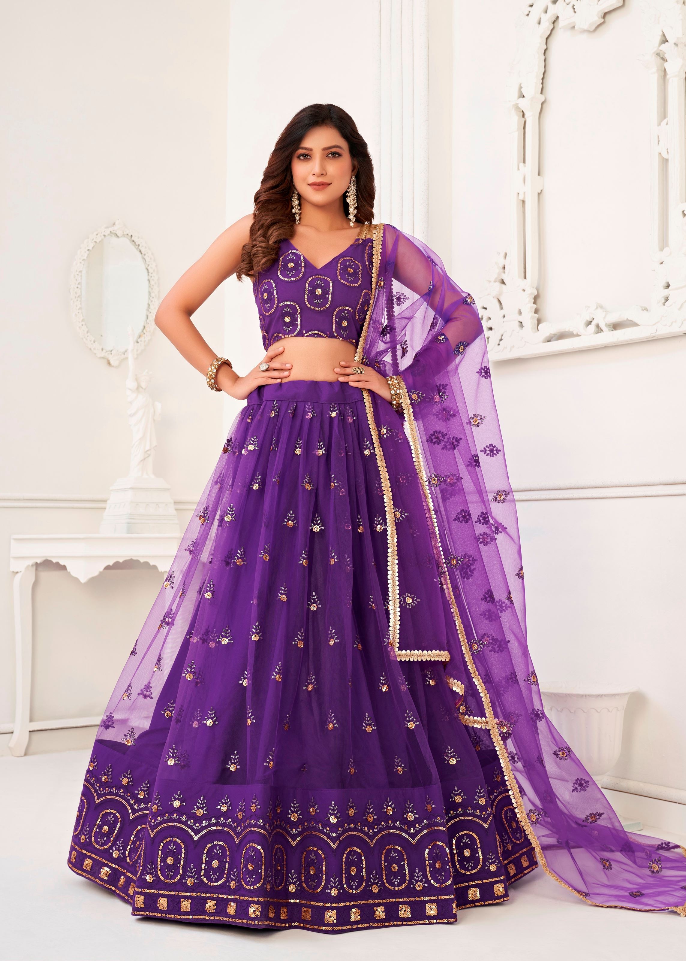 Step into regal elegance with this captivating Purple Butterfly Net Lehenga Choli from Aethnofit Fashions — a luxurious ensemble that radiates charm, sophistication, and festive sparkle. Crafted from feather-light butterfly net fabric, the lehenga is beautifully enhanced with thread and zari sandwich sequin embroidery work, creating a multi-layered, shimmering texture that elevates its rich purple tone. Ideal for weddings, receptions, or evening celebrations, this lehenga is designed to leave a lasting impression.