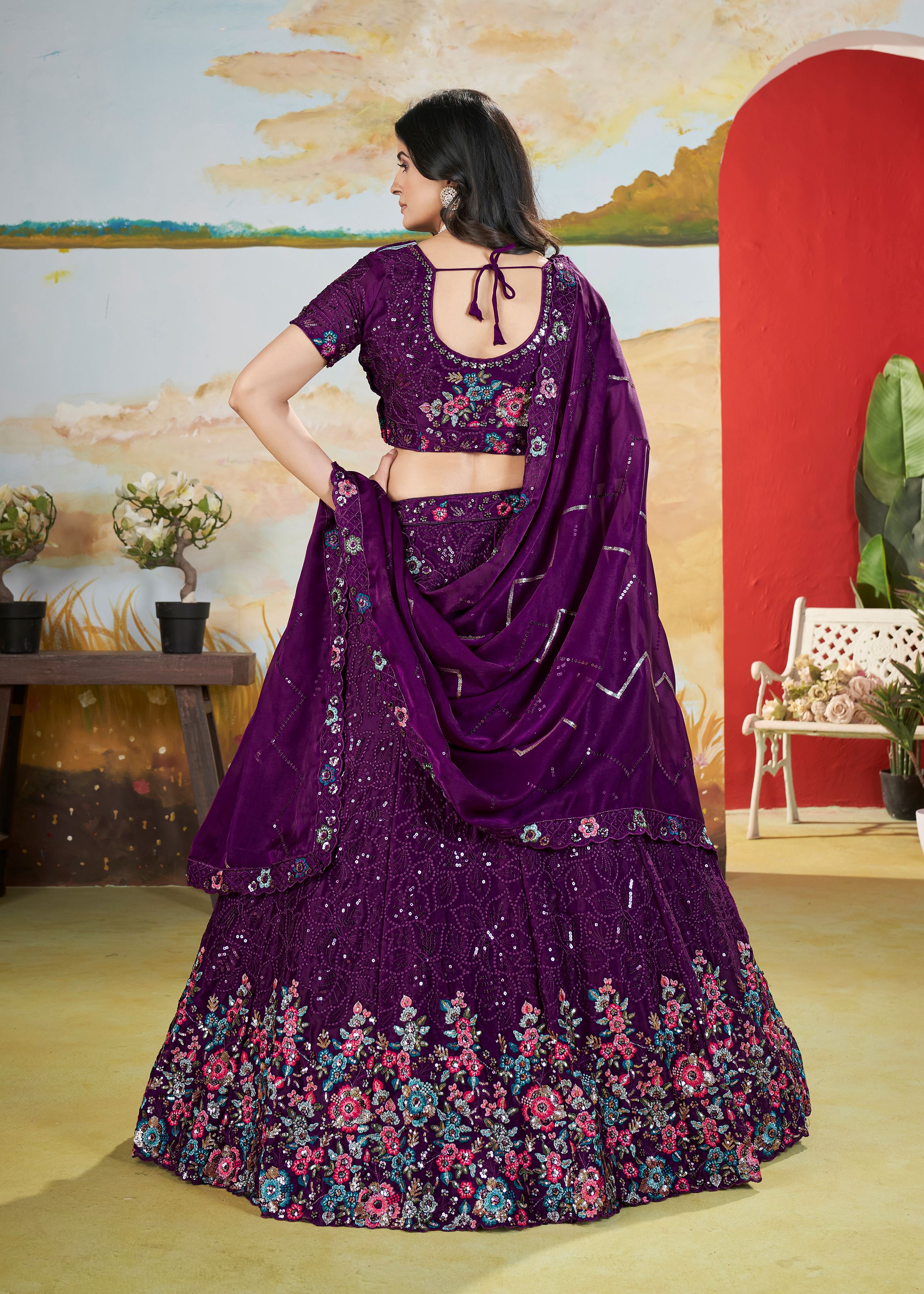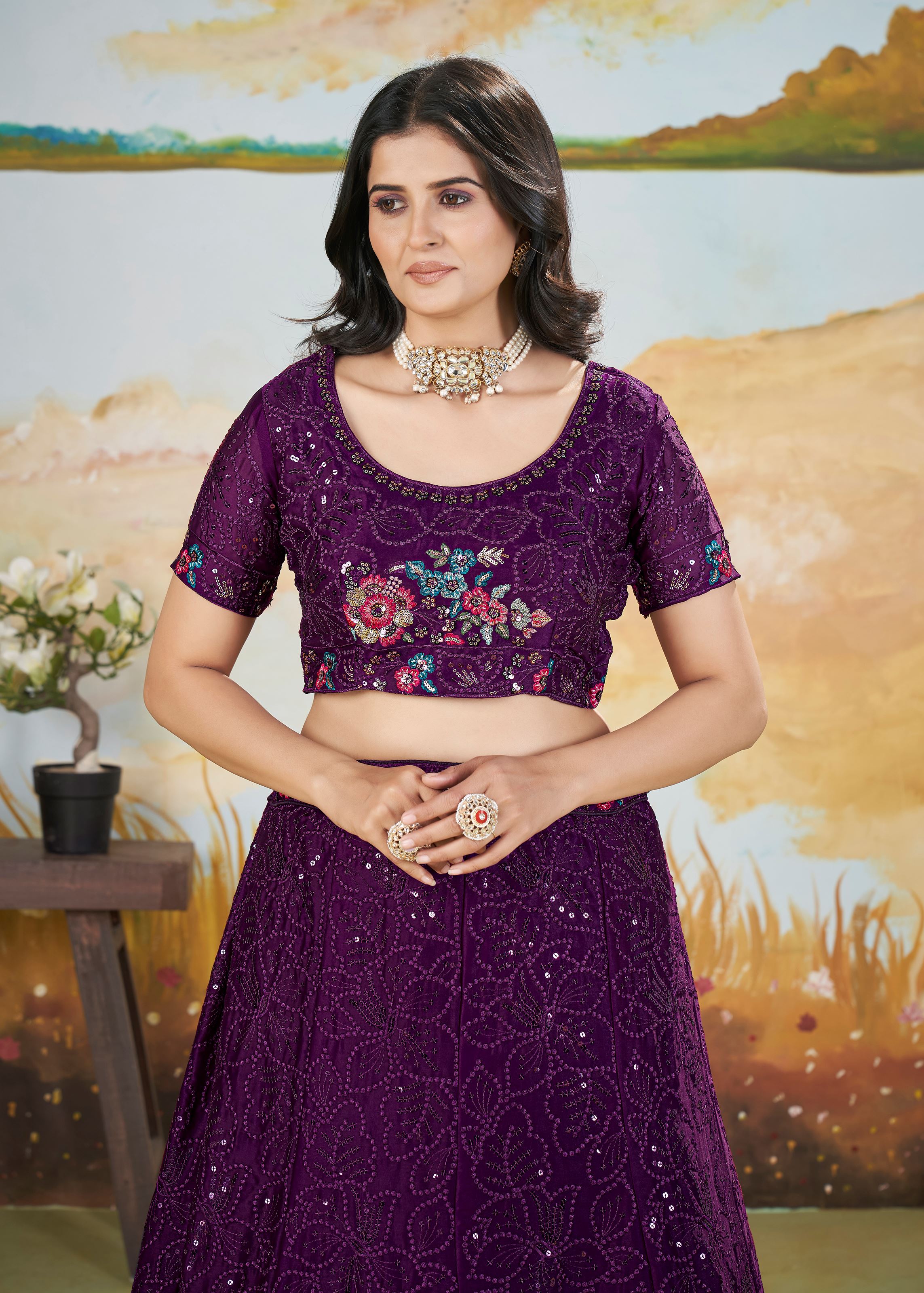 Purple Chinnon Lehenga with Copper Sequin and Floral Threadwork