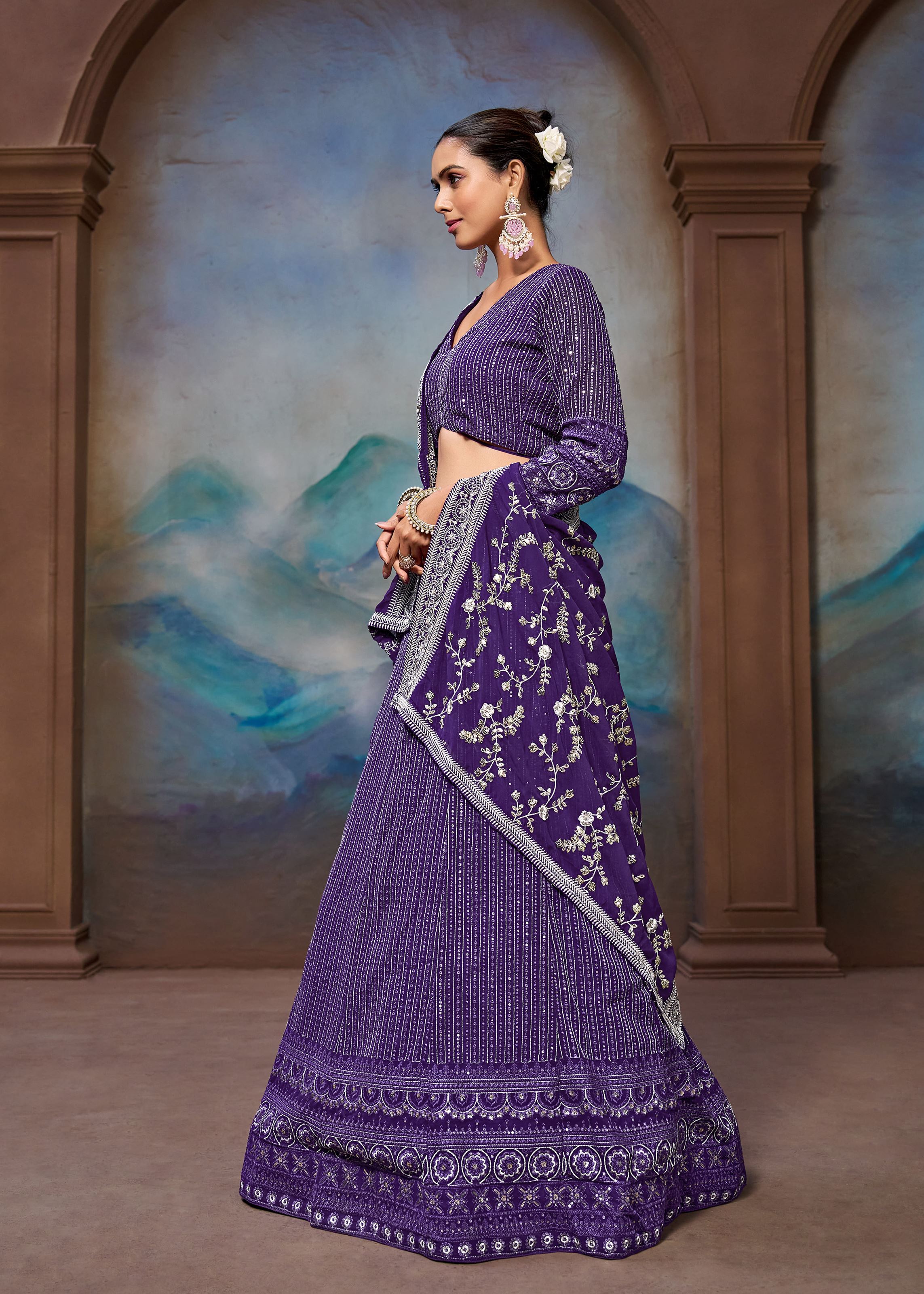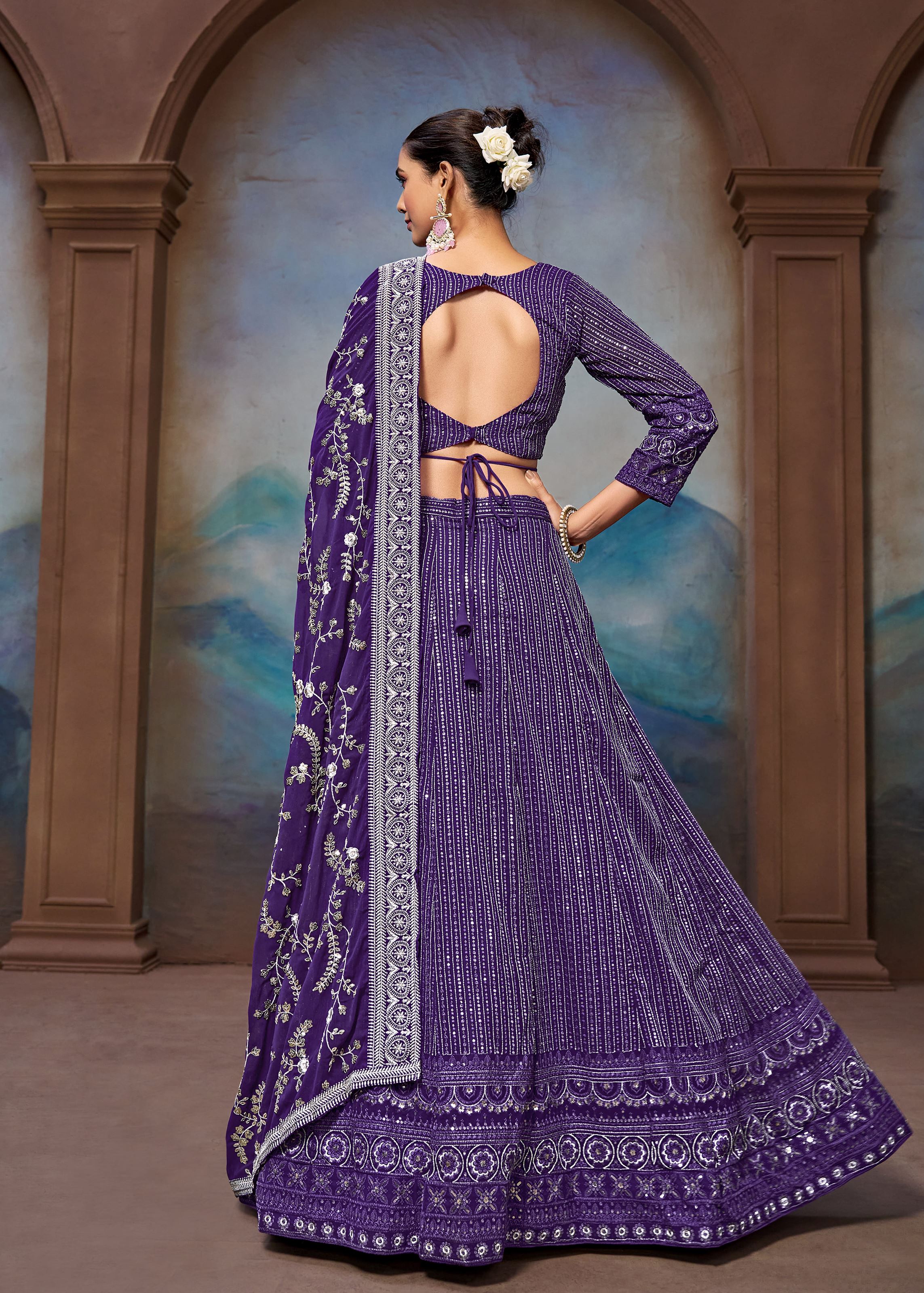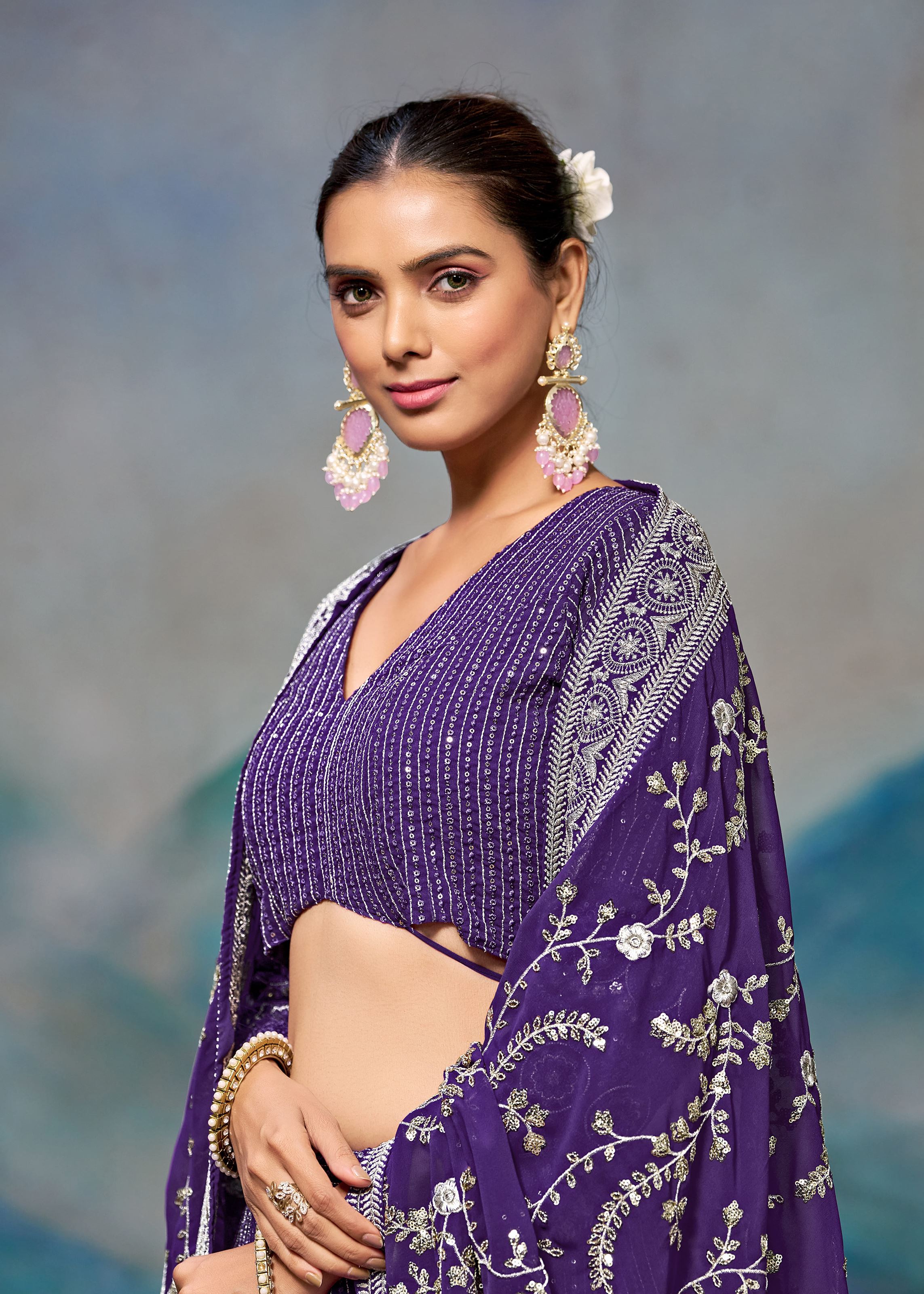 Purple Georgette Zari Sequence Embroidery Work Lehenga Choli
