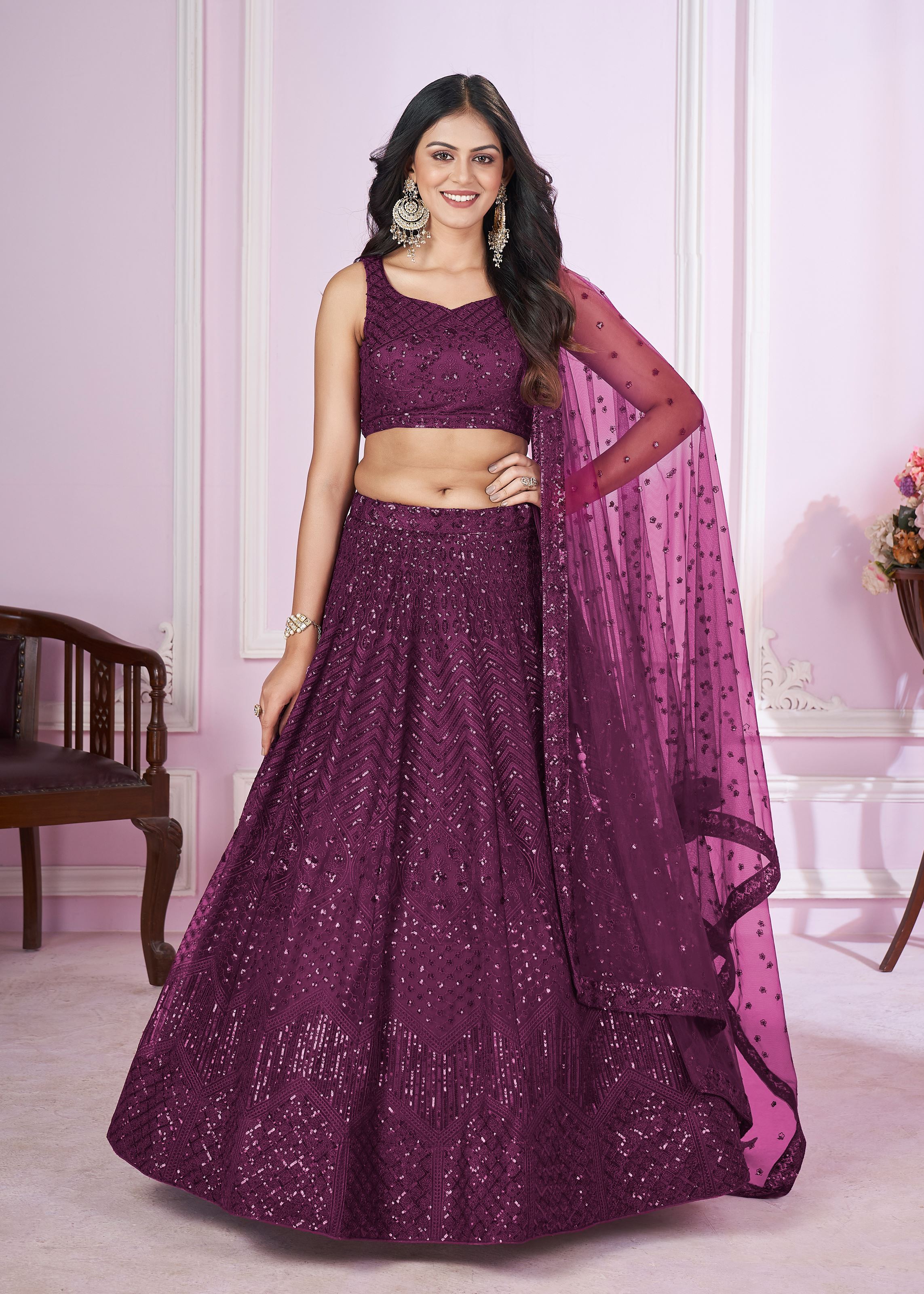 Purple Soft Net Lehenga Choli With Sequins, Thread Embroidery Work --Size Unstitched Available Up To 42 Size