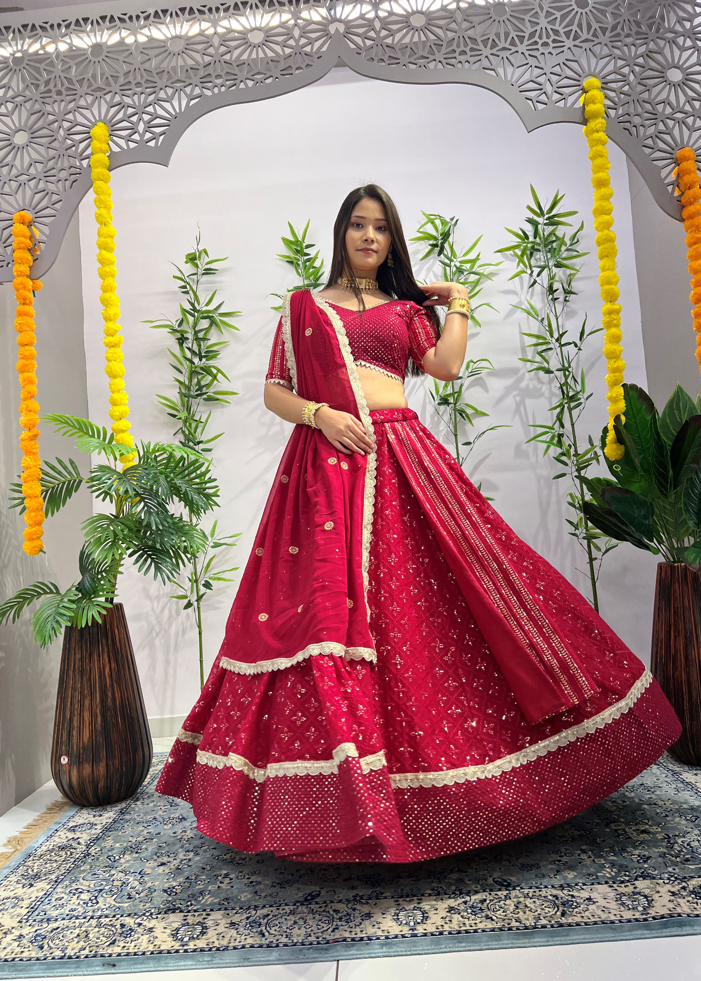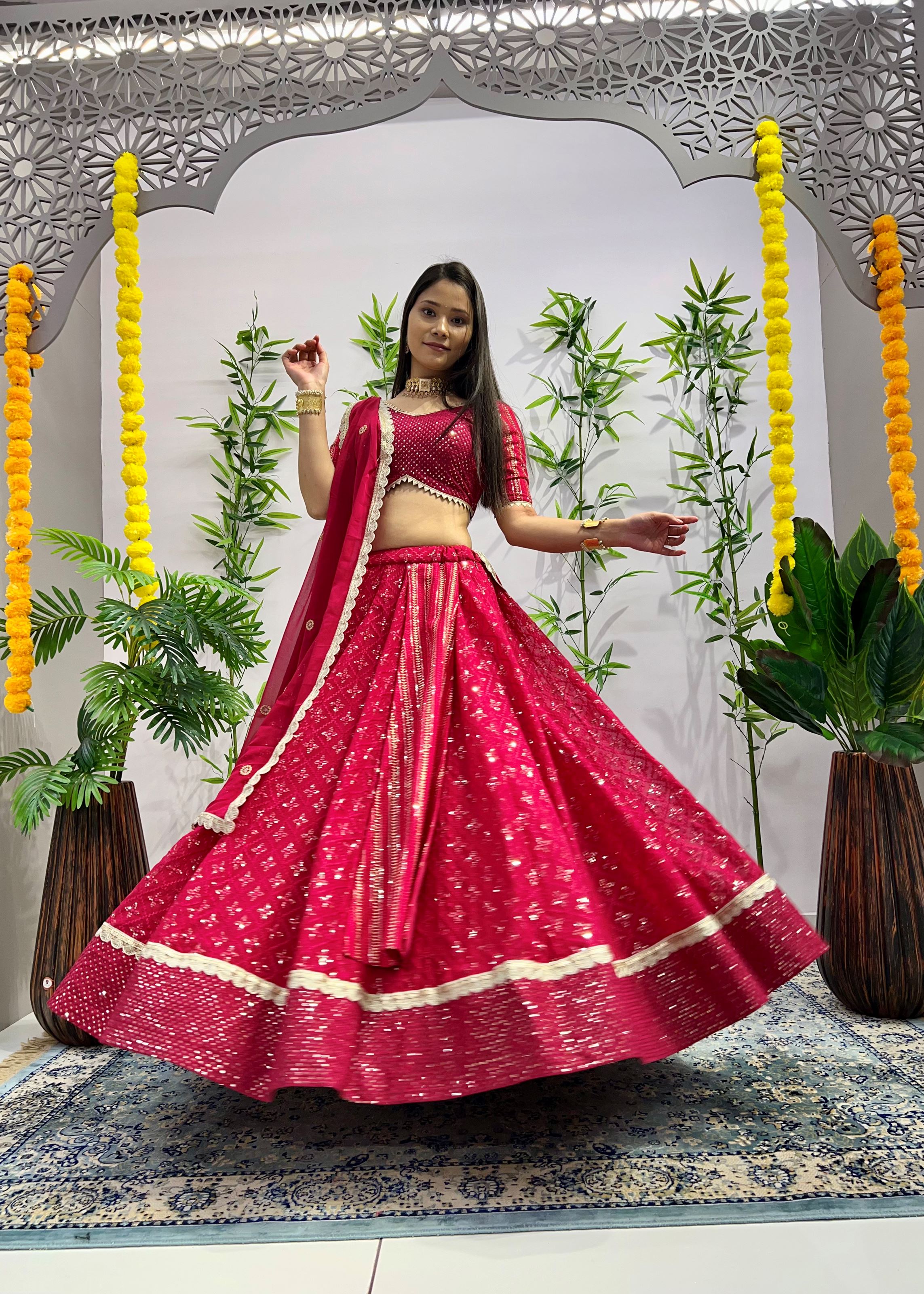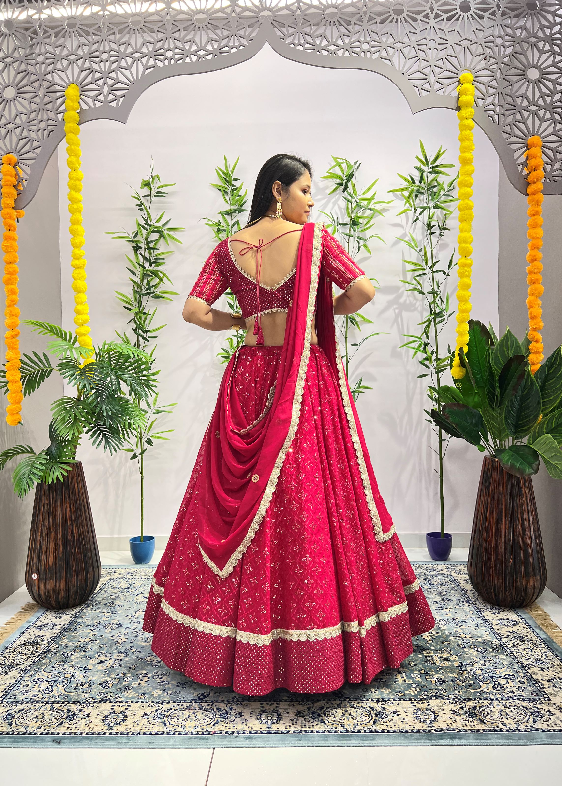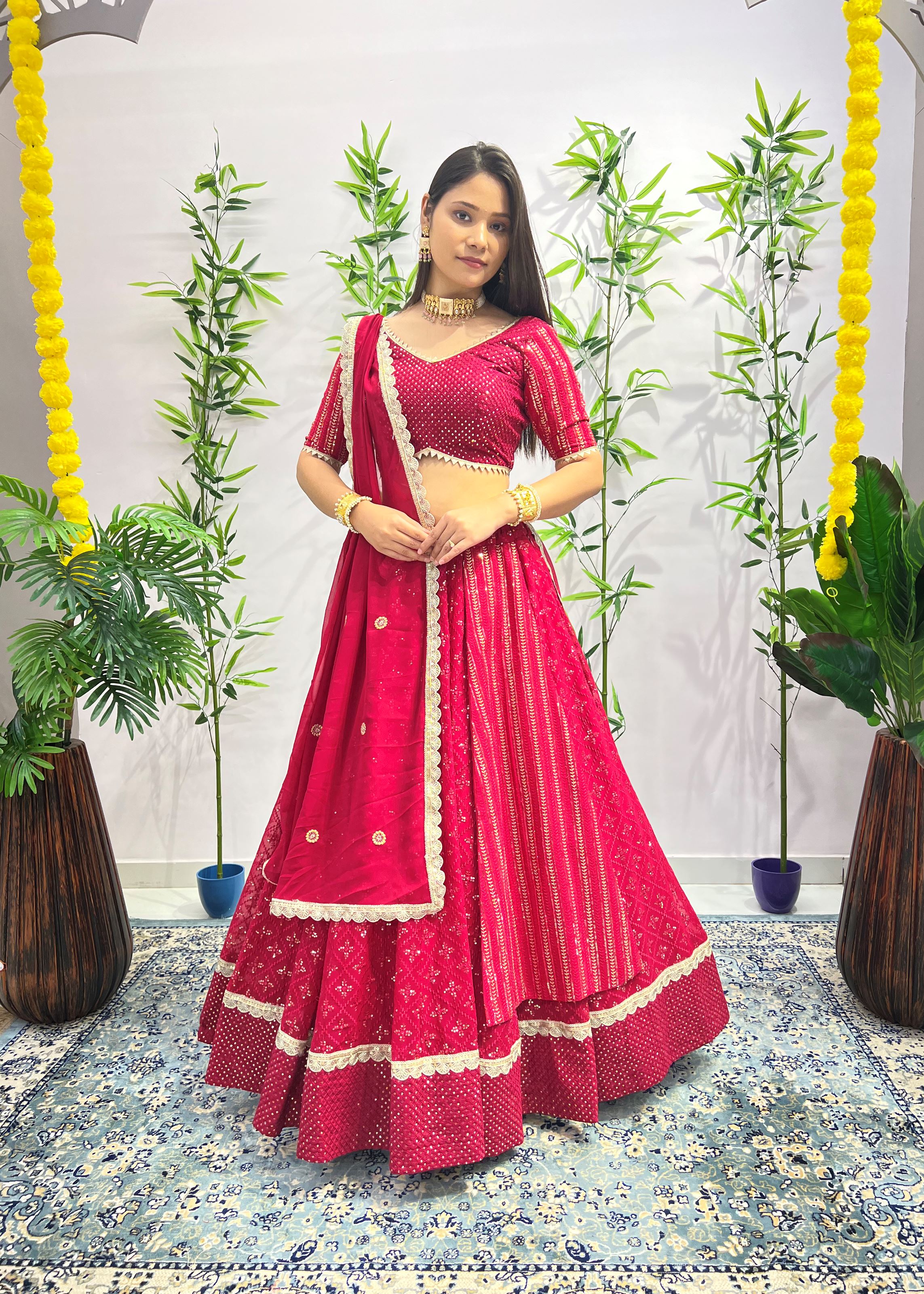 The matching blouse, also in Heavy Georgette, complements the lehenga with identical craftsmanship and flawless structure. Completing the ensemble is a soft Georgette dupatta in rani pink, offering fluid movement and a graceful drape that balances the look with elegance. This three-piece set delivers tradition, vibrancy, and luxury — all in one.
