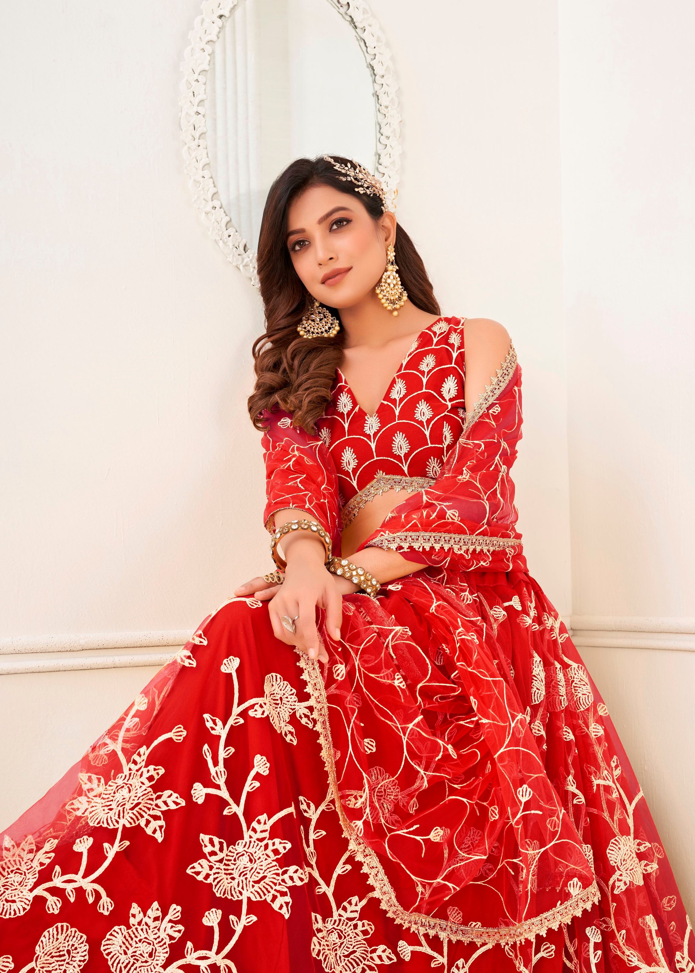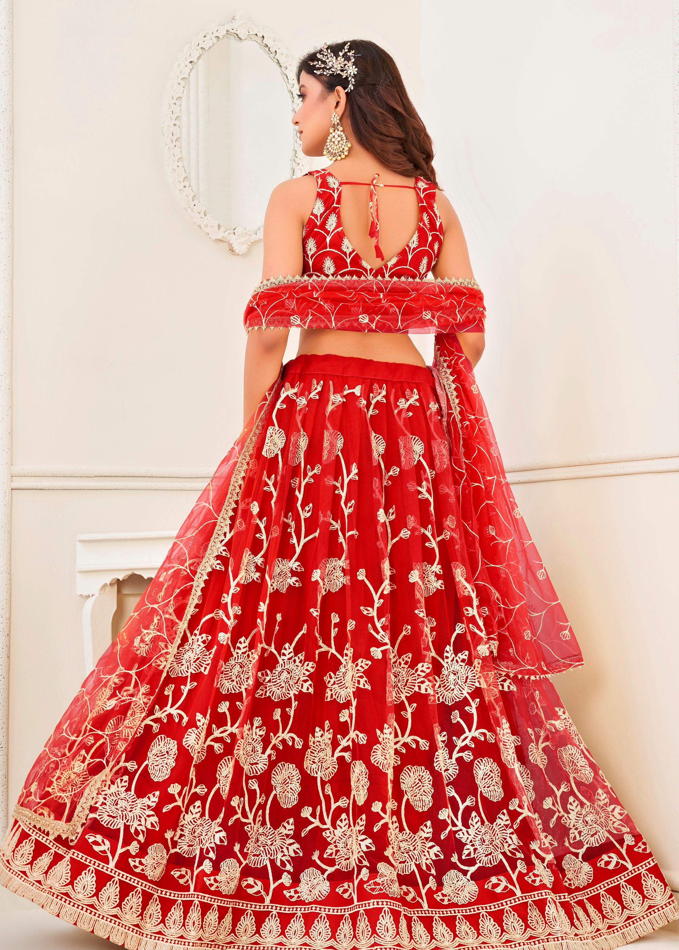 Red Butterfly Net Lehenga Choli with Embroidery and Sequins Work