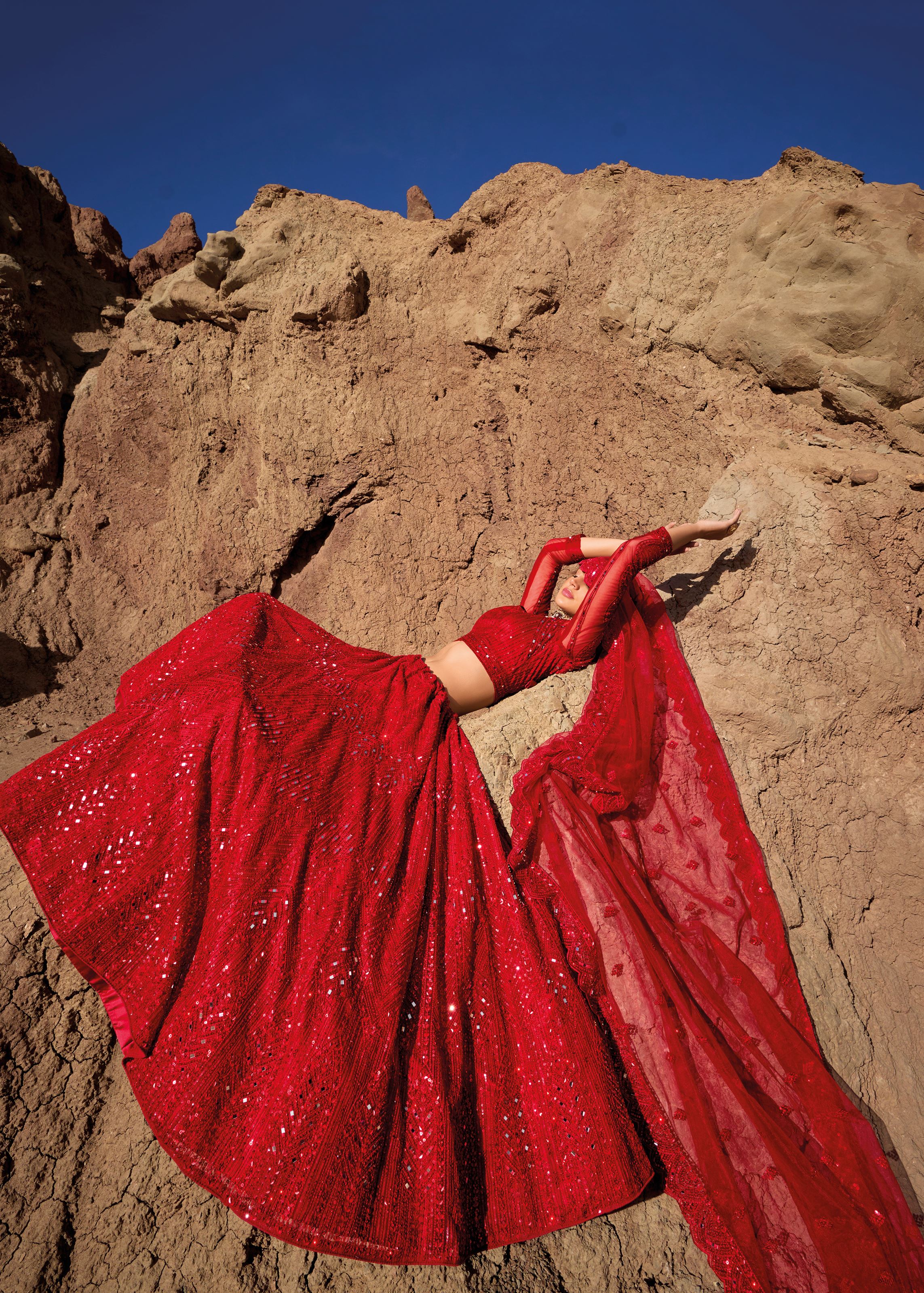 Red Lehenga Choli with Embroidery with Cut Work, Mirror Work and Zarkan Work