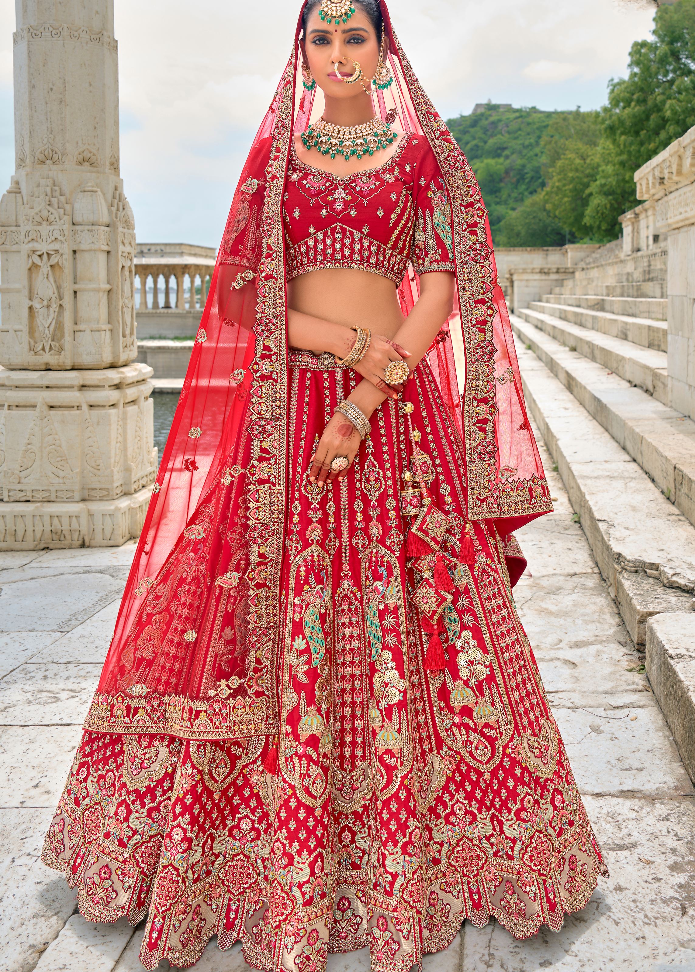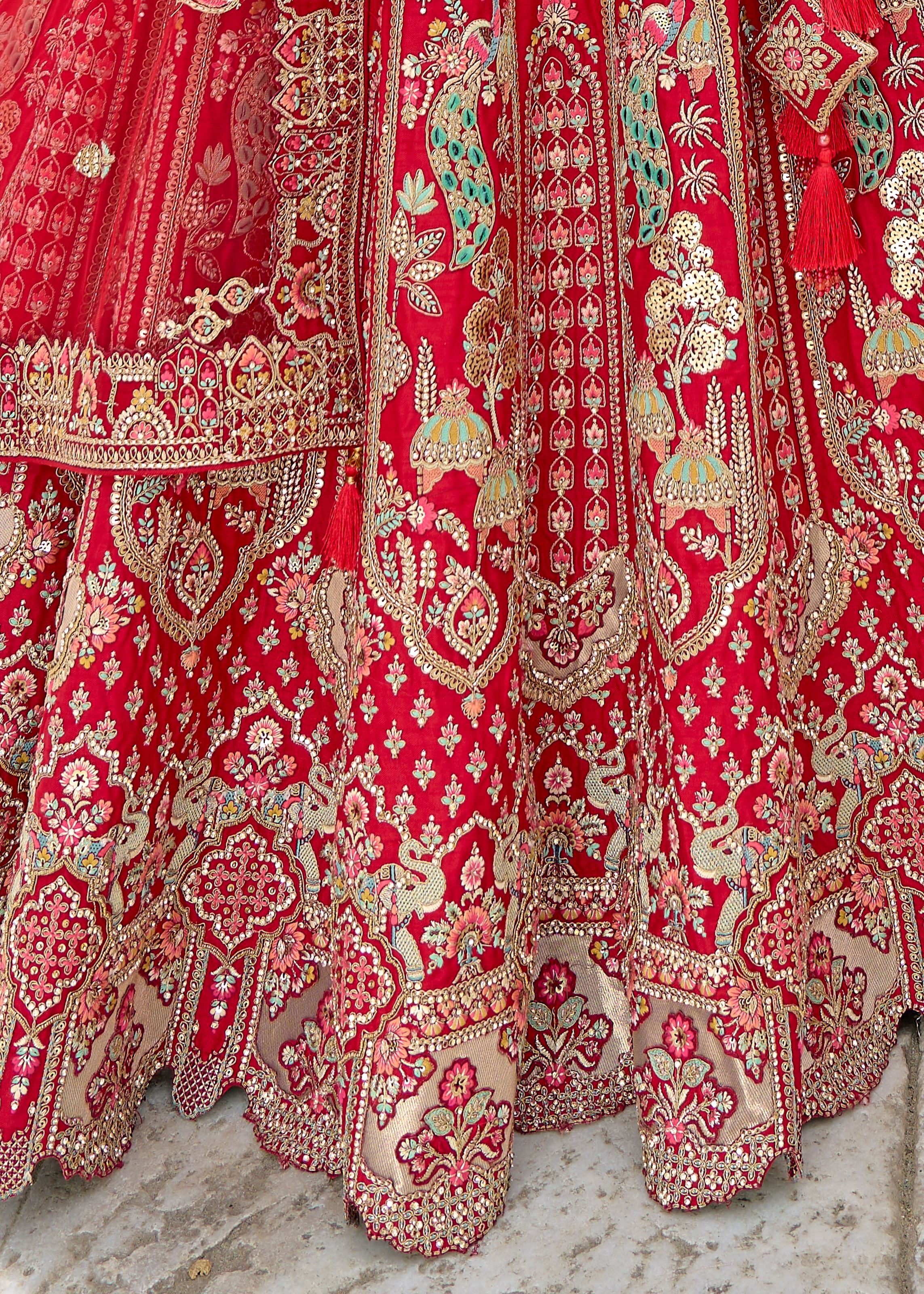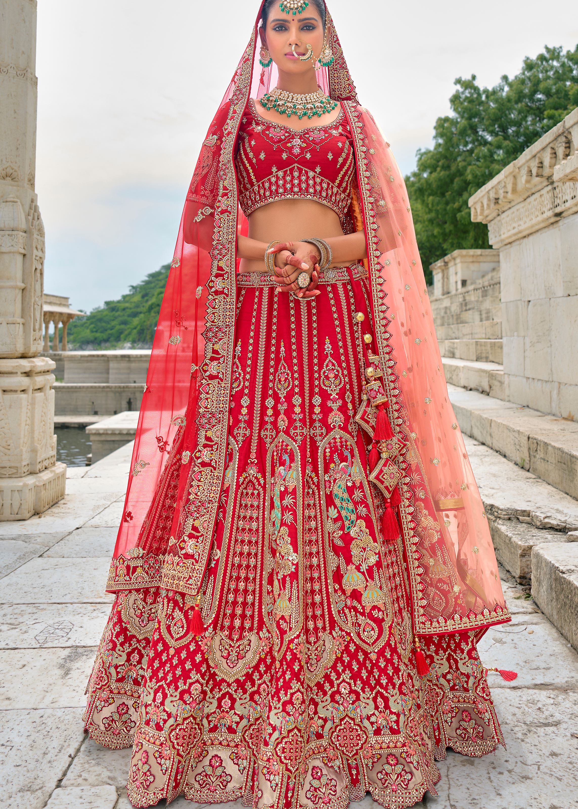 Red Lehenga Choli With Heavy Thread Embroidery, Zari With Sequins Work