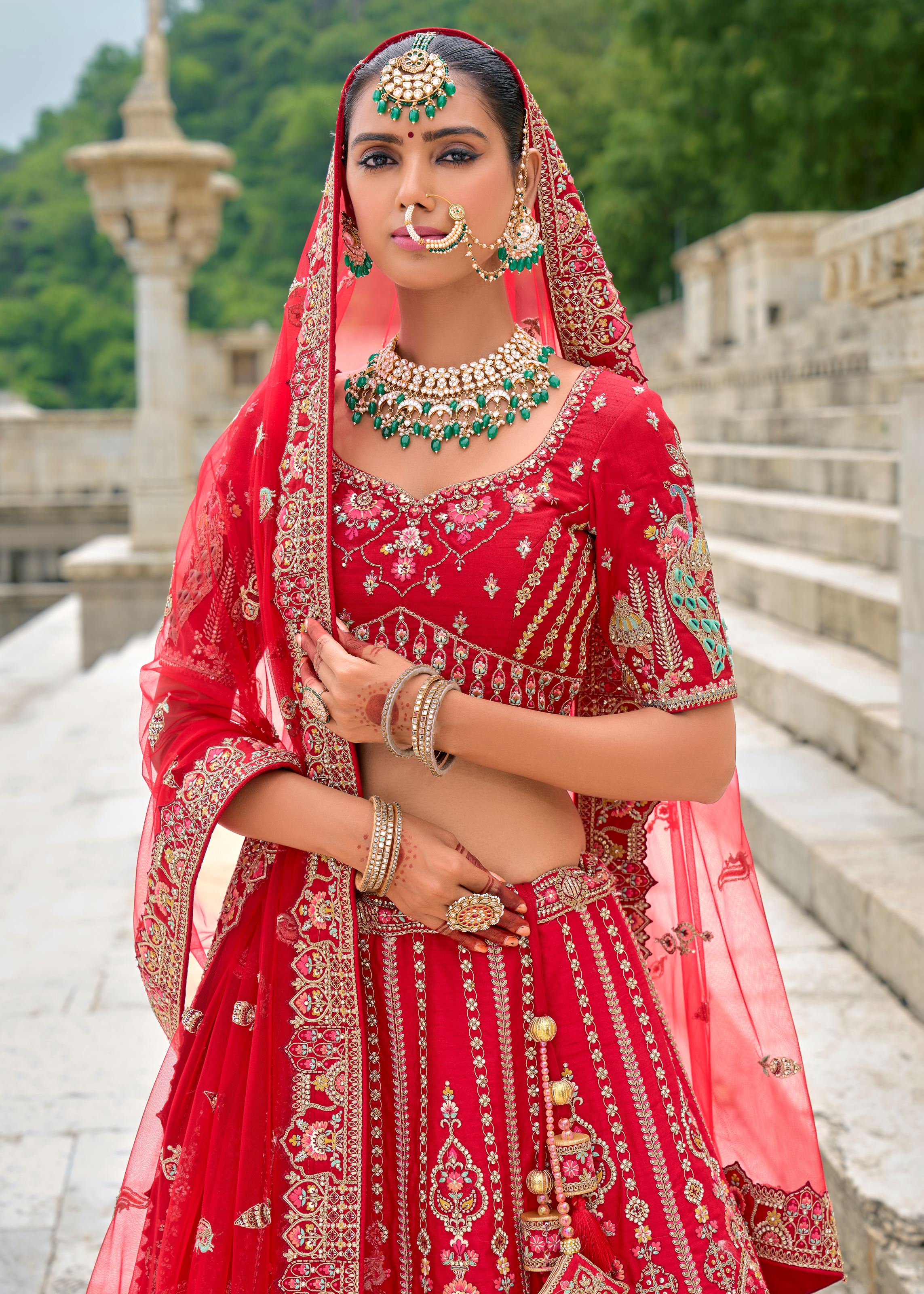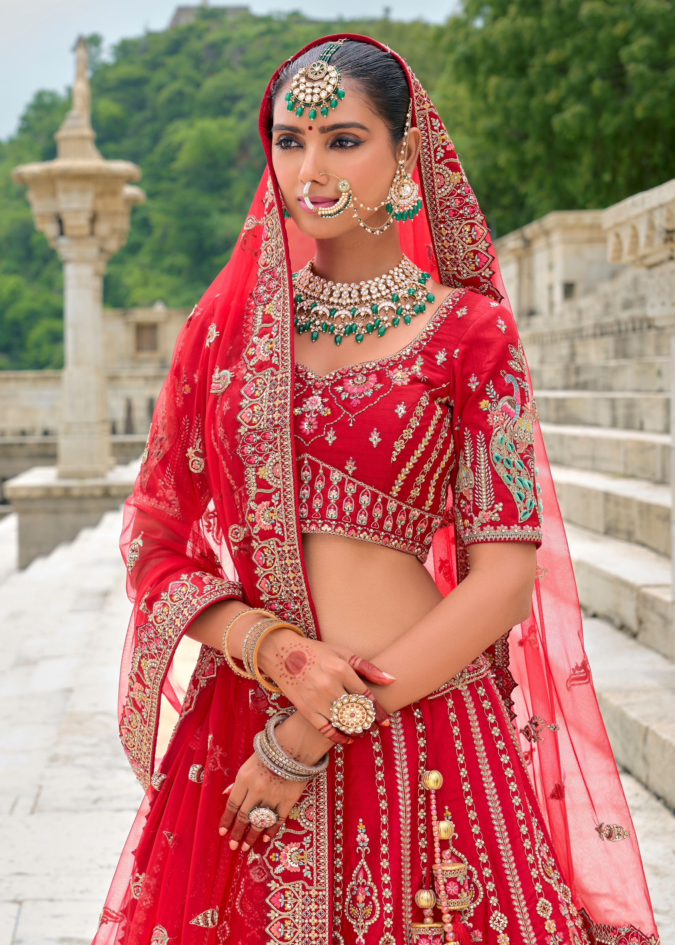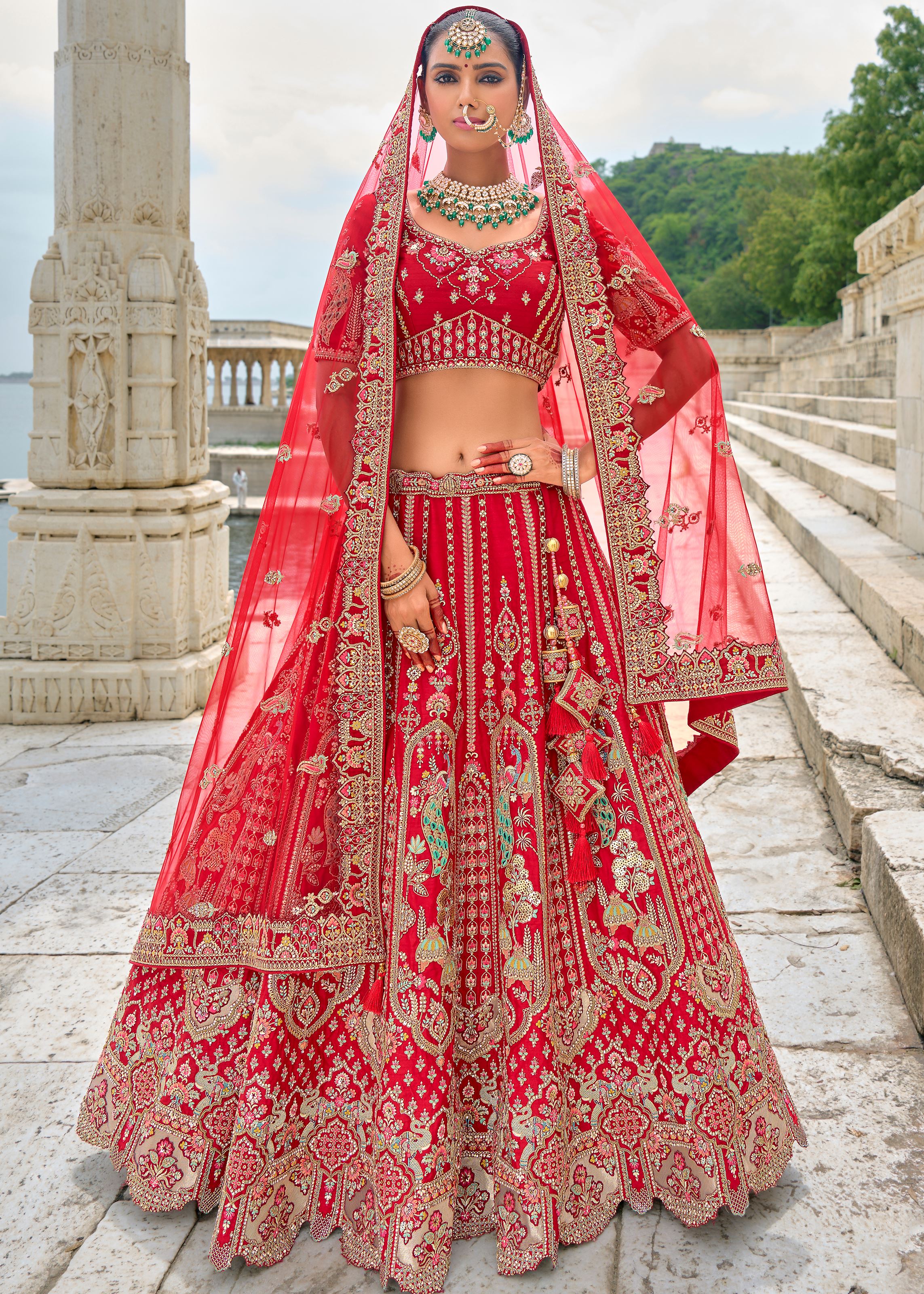 Red Lehenga Choli With Heavy Thread Embroidery, Zari With Sequins Work