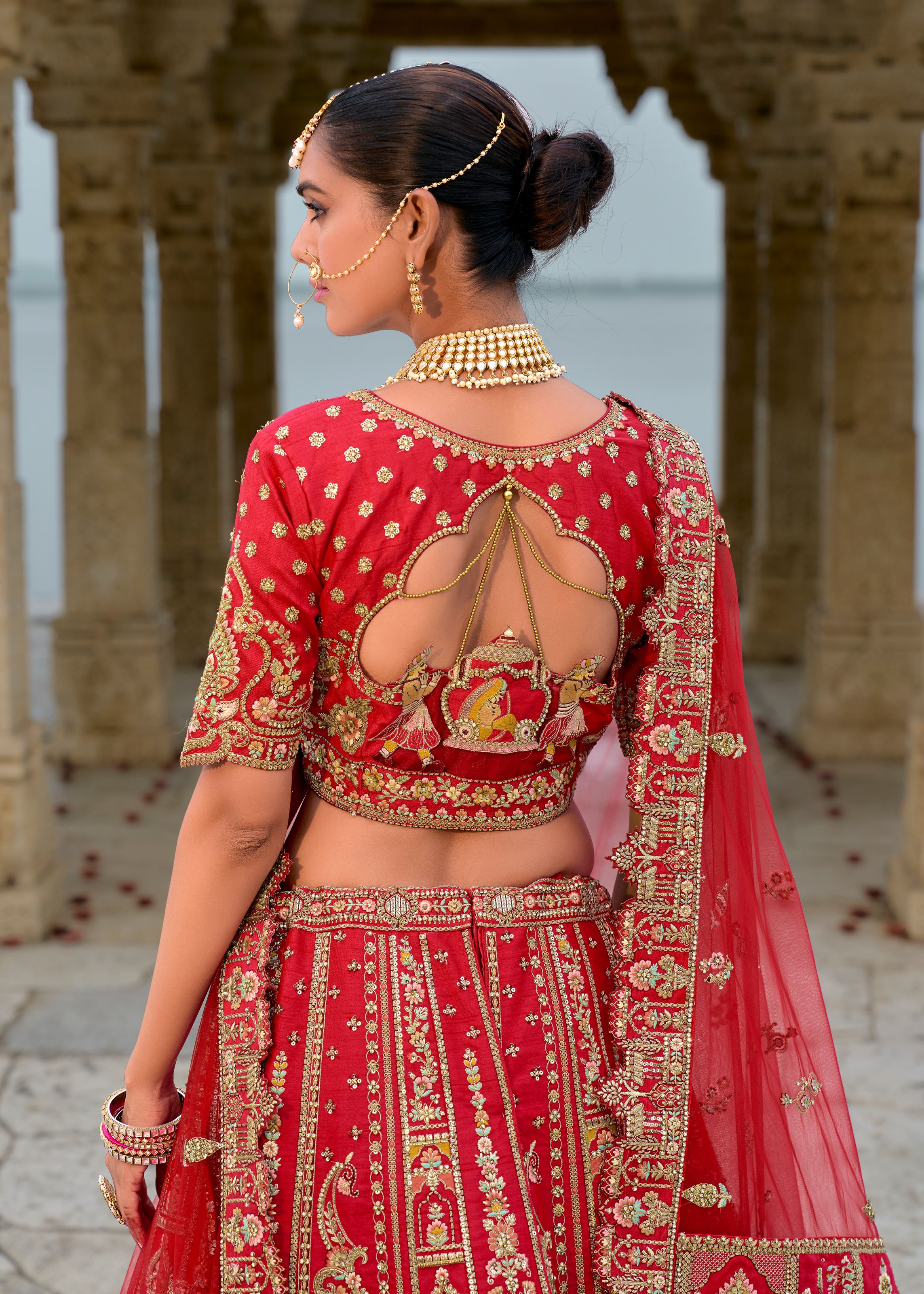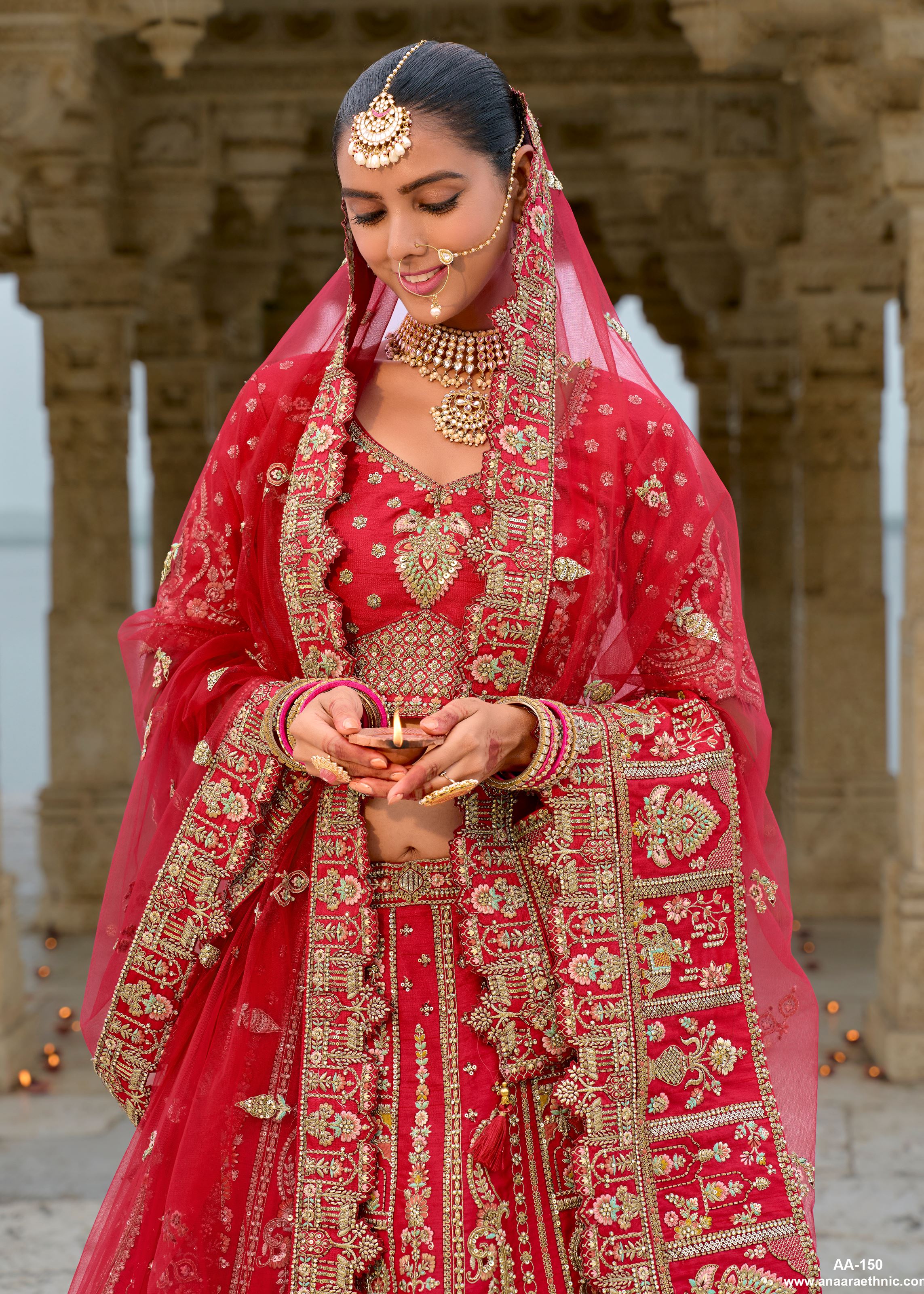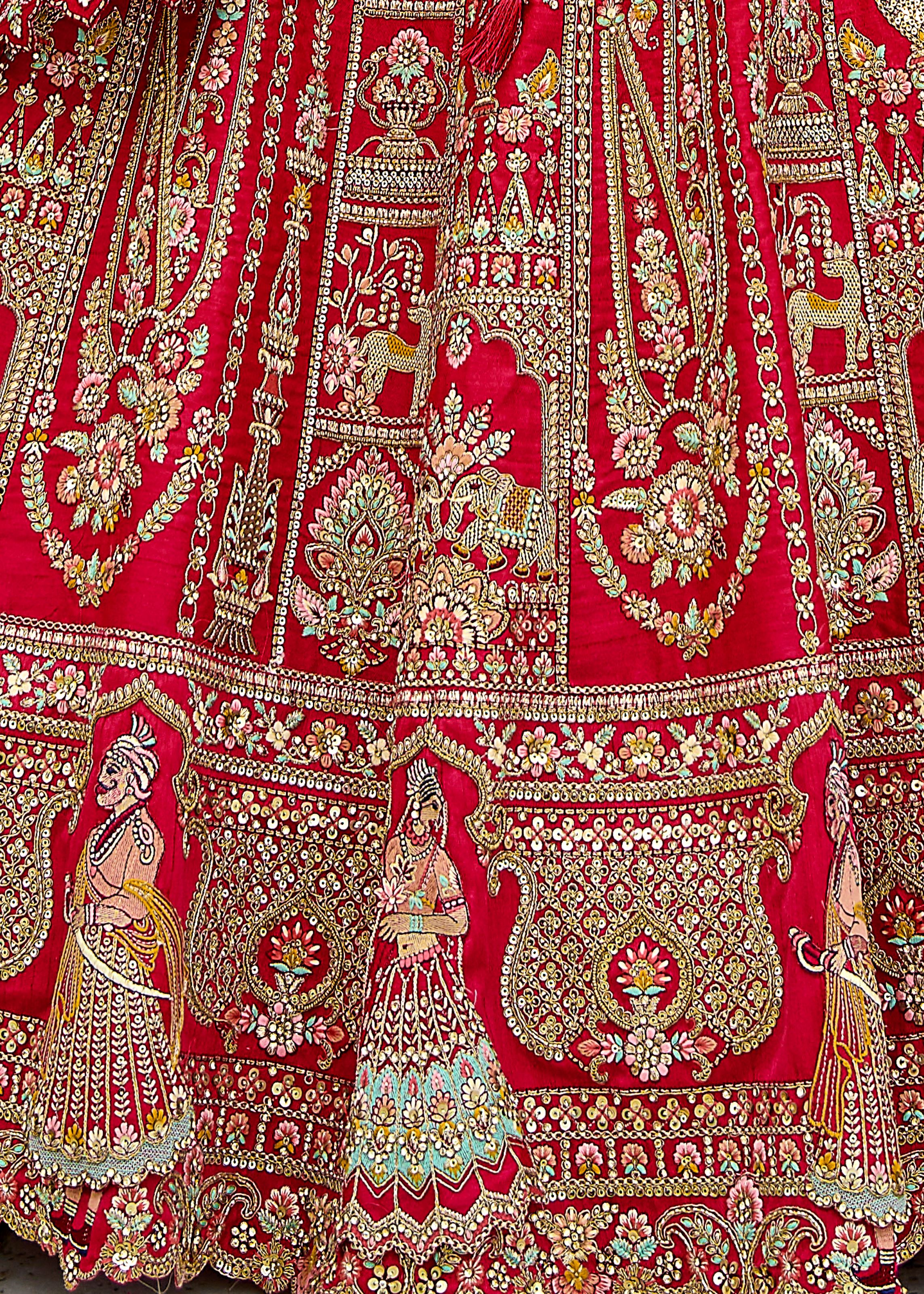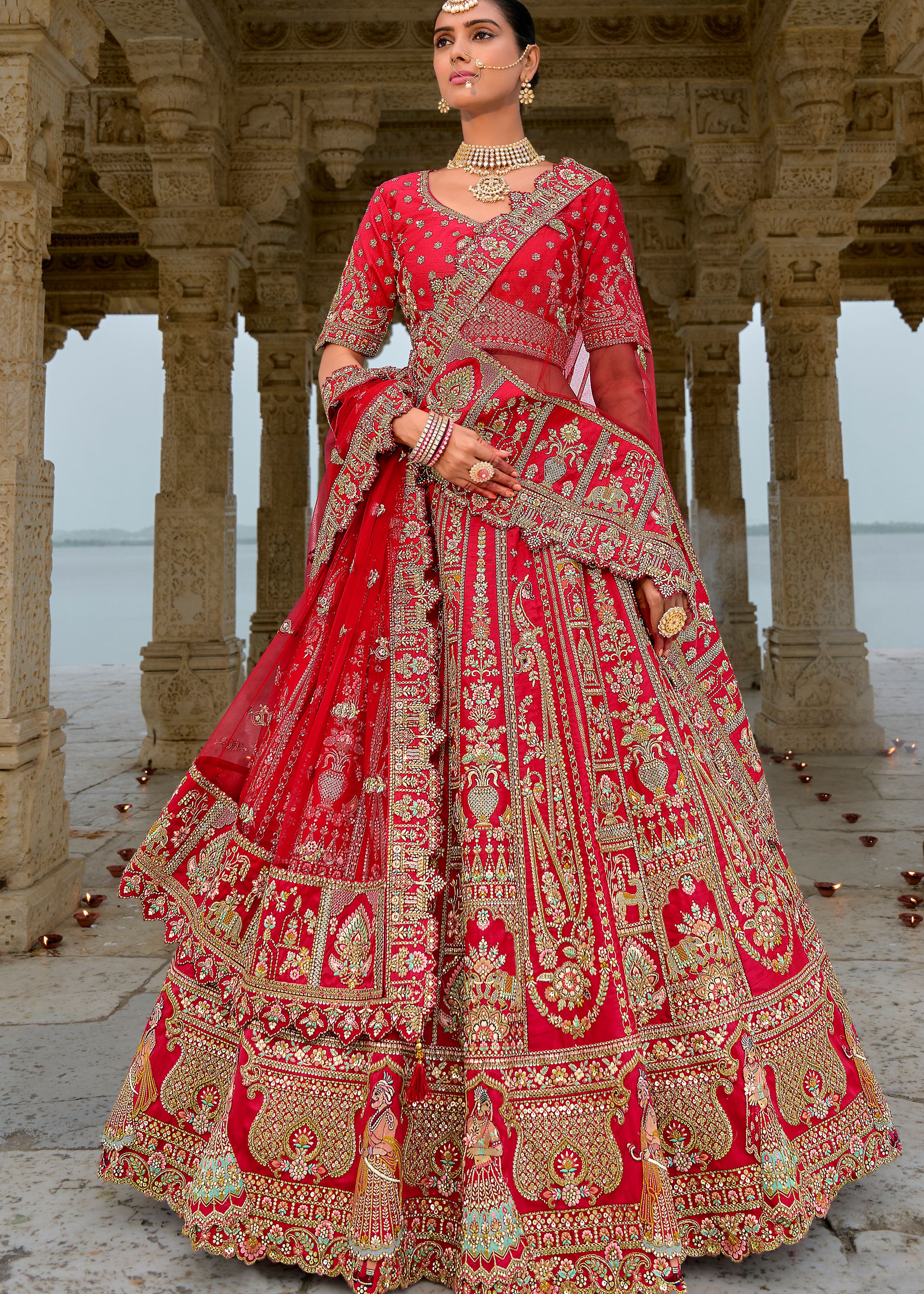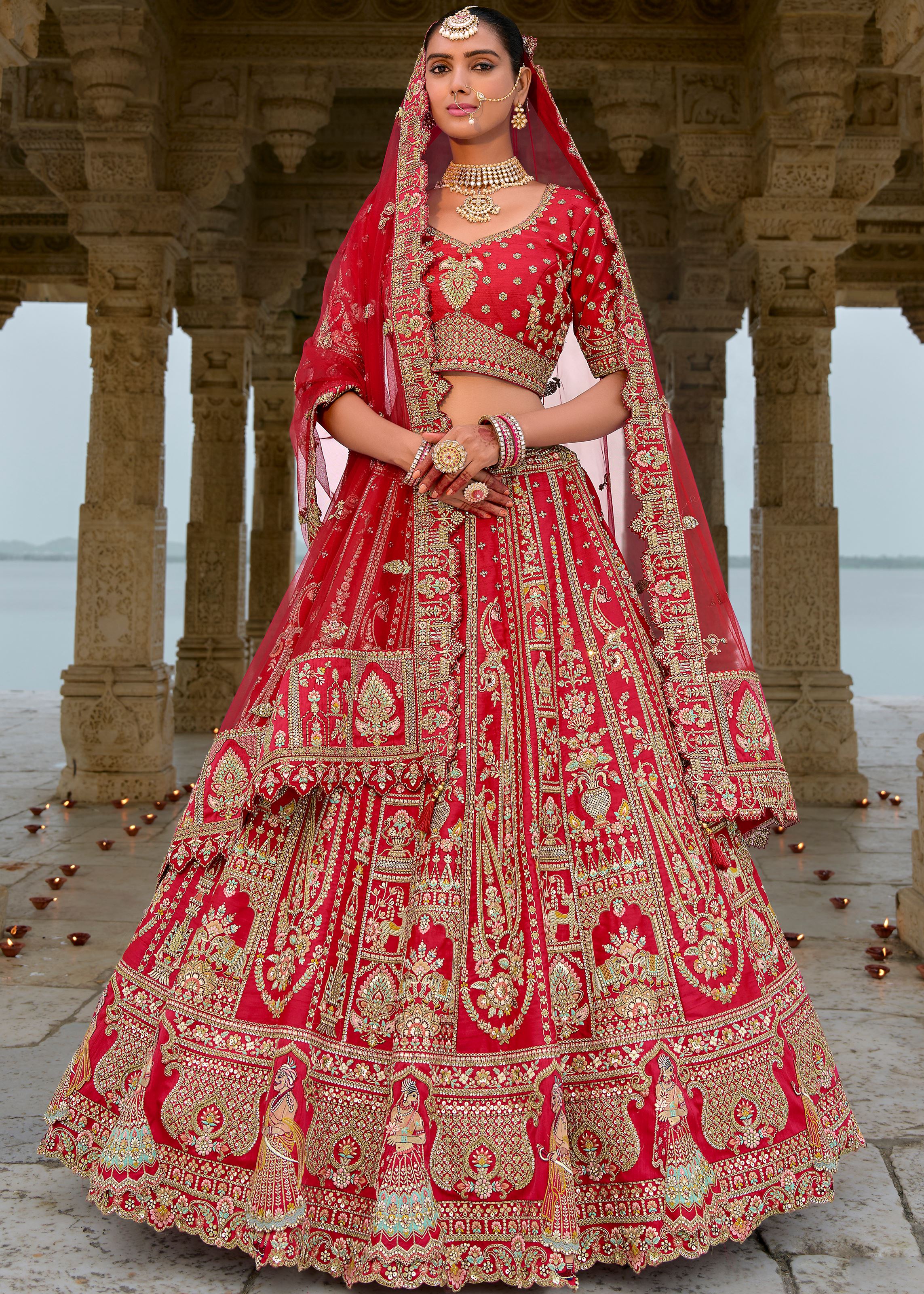 Red Lehenga Choli With Heavy Thread Embroidery, Zari With Sequins Work