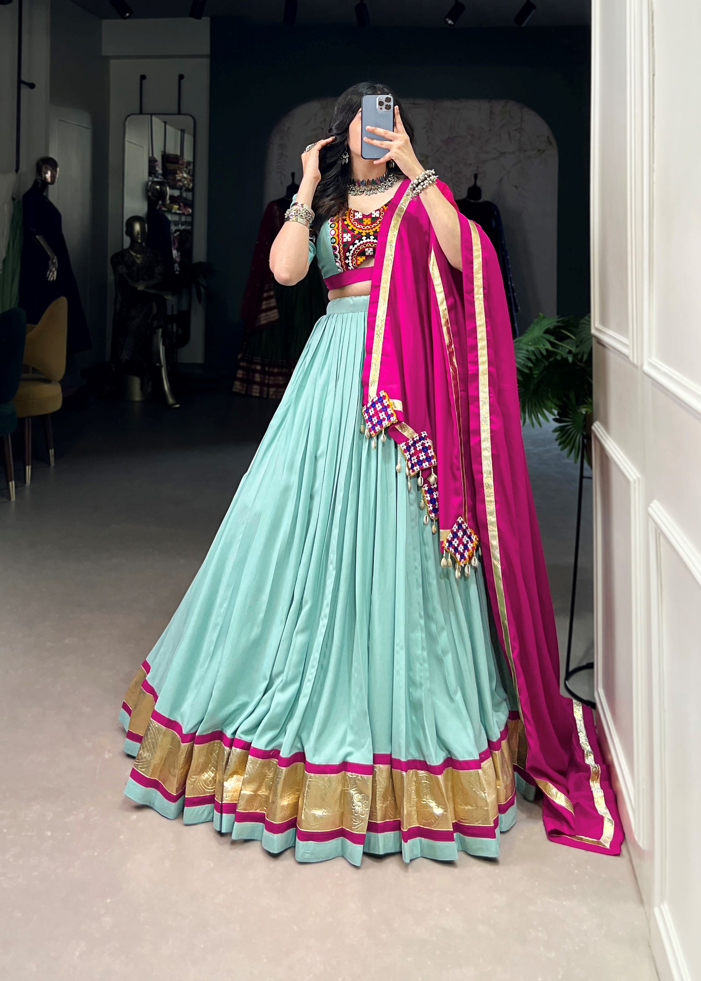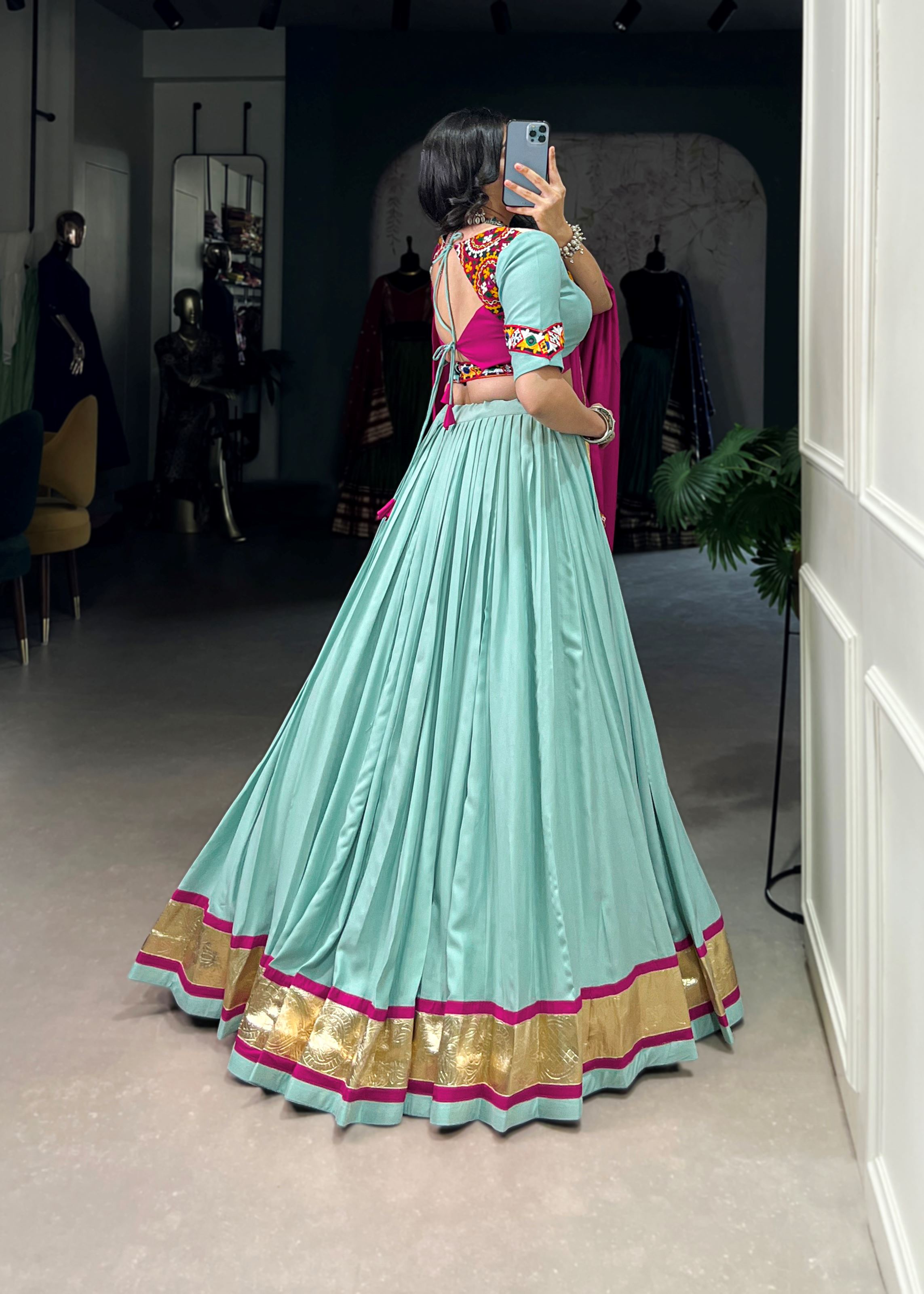 Sea Green Embossed Rayon Lehenga Choli with Lace Touch-Up