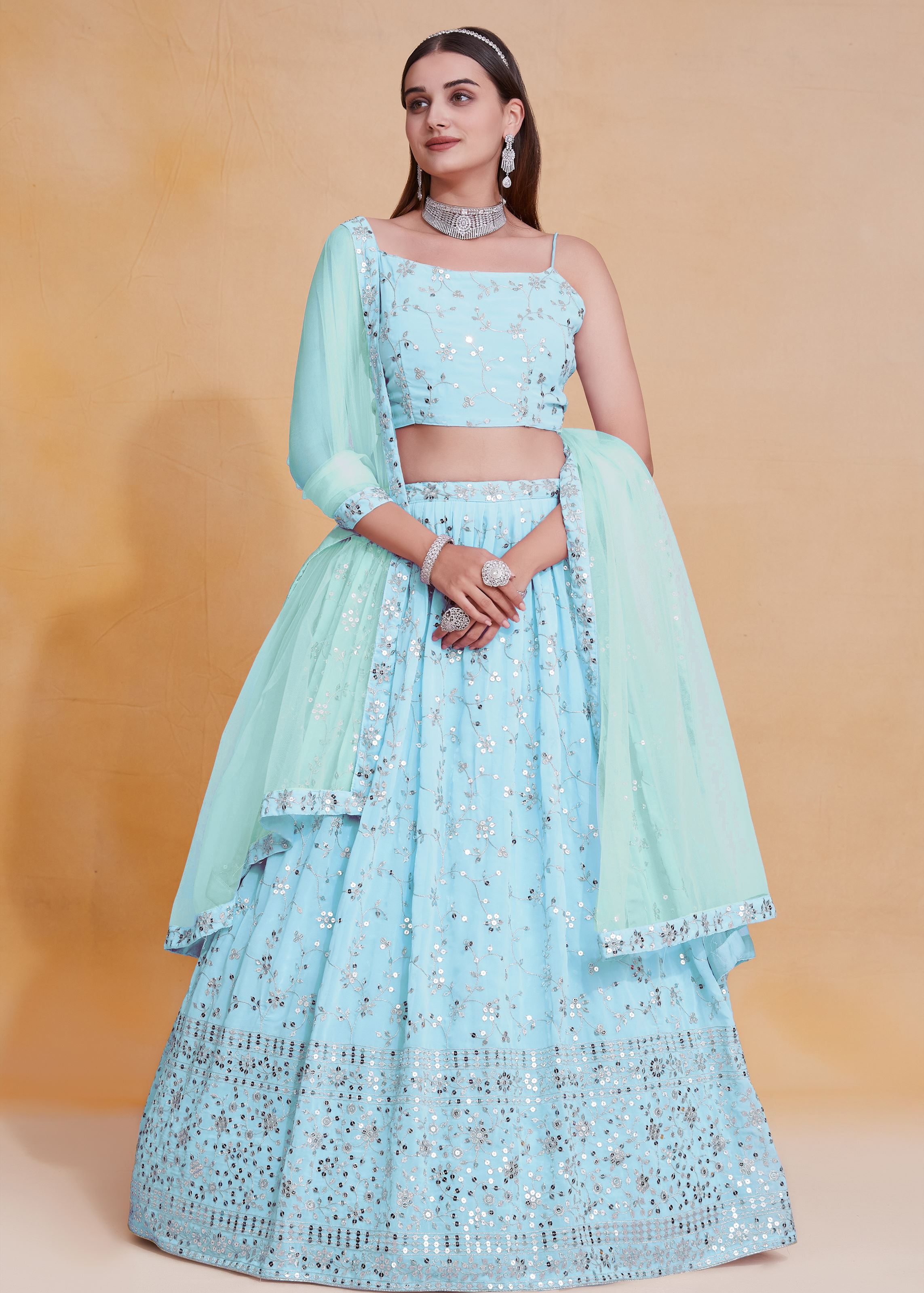 Skyblue Georgette Sequence Embroidery Work Lehenga Choli