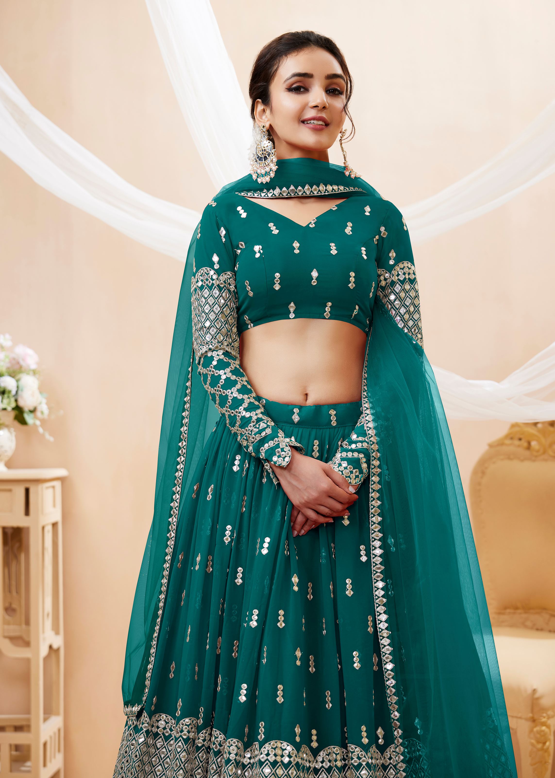 Teal Blue Georgette Lehenga Choli With Sequins Zari Embroidered Work
