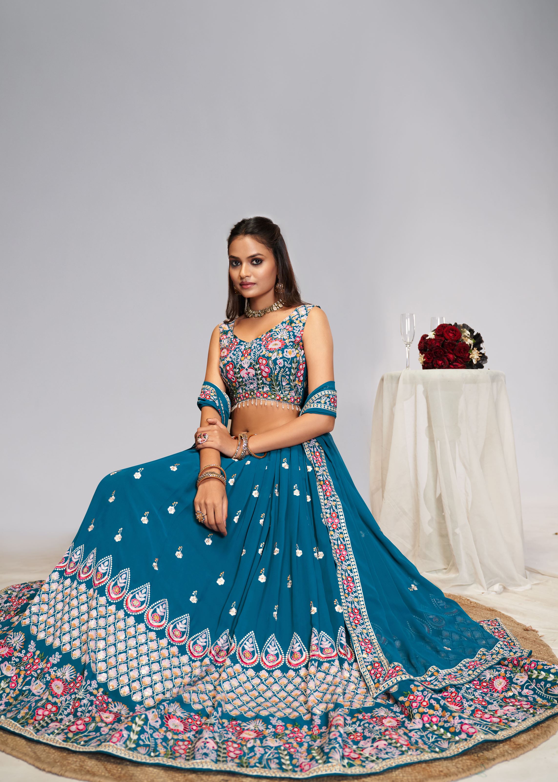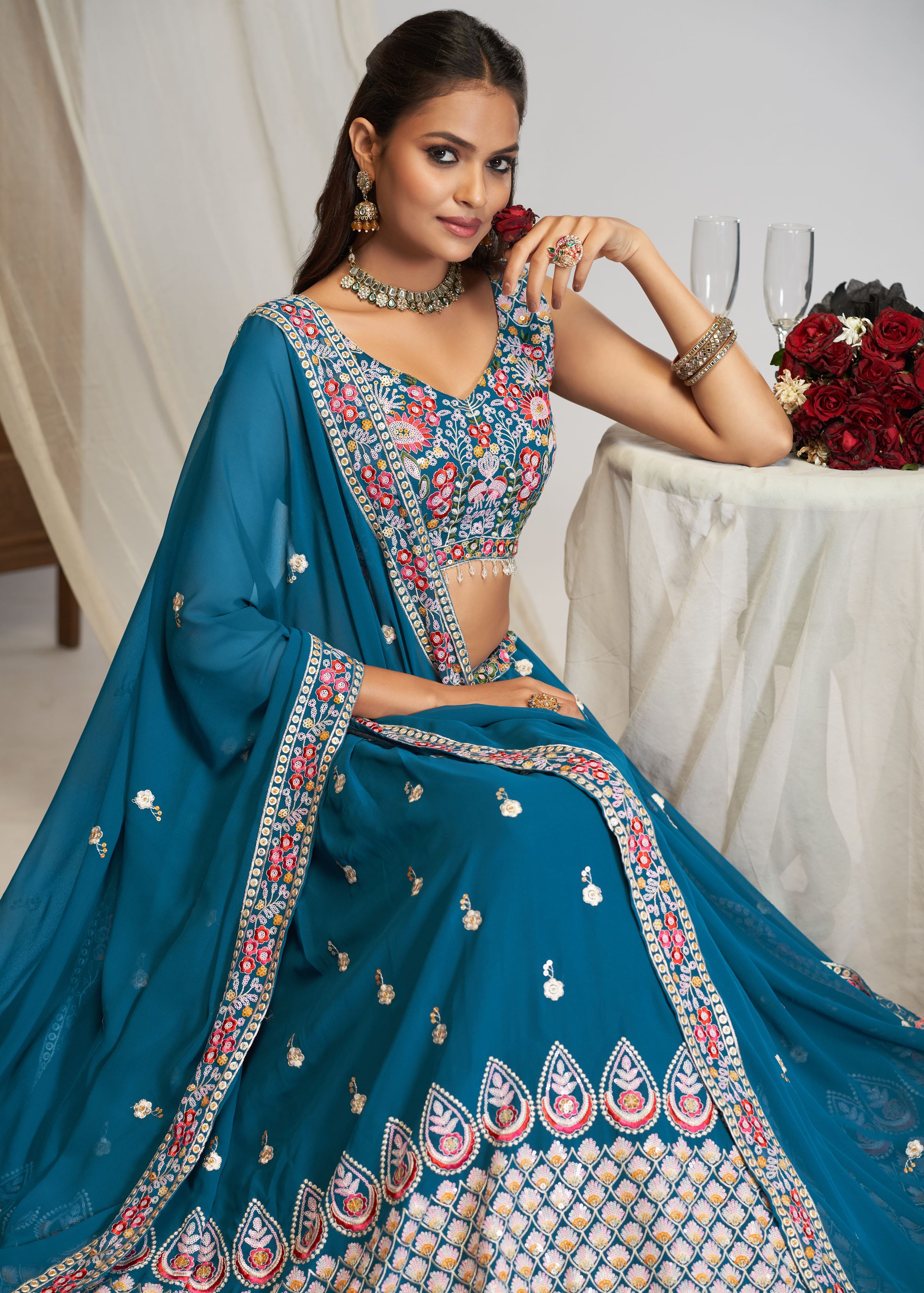 Teal Blue Georgette Sequence Zari, Thread Embroidery Work Lehenga Choli