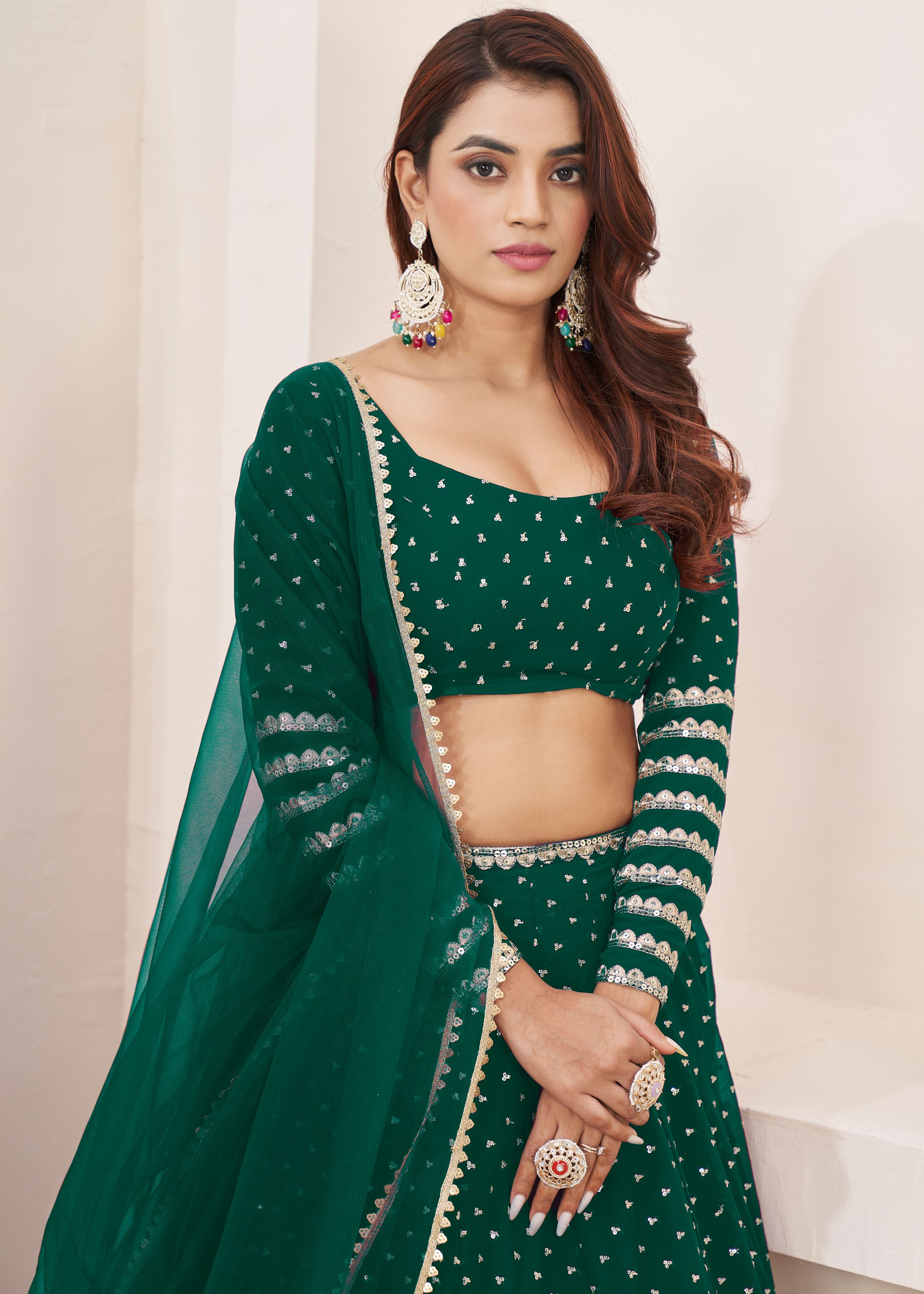 Teal Green Georgette Lehenga Choli With Sequins Zari Embroidered Work --Size Unstitched Available Up To 42 Size