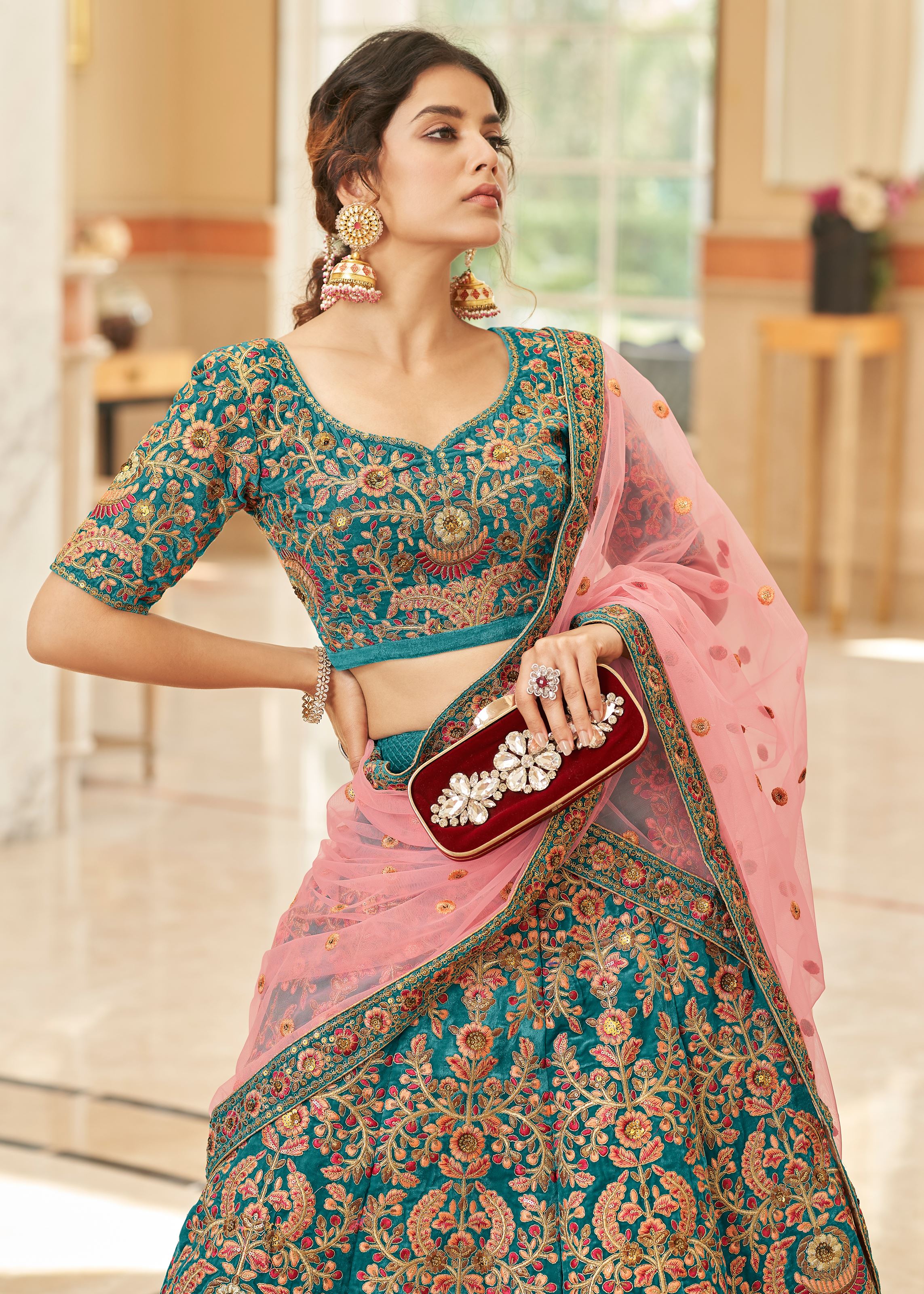 Teal Velvet Lehenga Choli With Thread, Zari, Dori and Sequins Embroidery Work